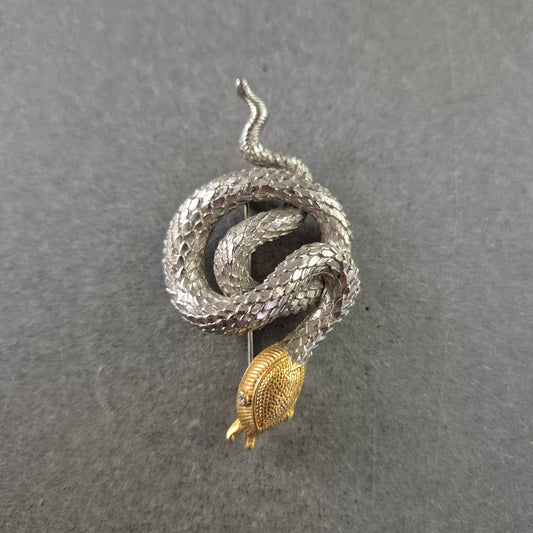 Auffällige Vintage Schlangen Brosche – Silberfarben & Goldkopf