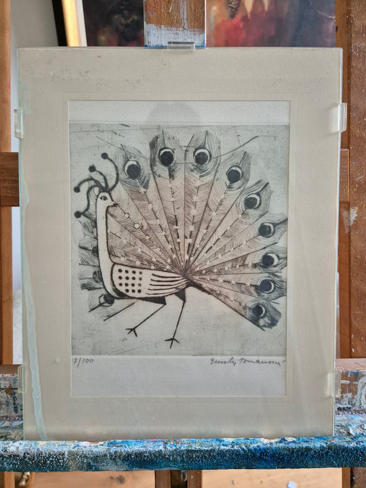 Emilie Tomanová (1933–1994) Radierung Pfau Tiermotiv 24x30,5 cm