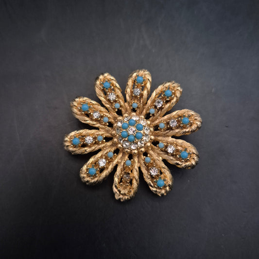 Auffällige Blumen Brosche – Goldton mit Türkis- und Strassakzenten
