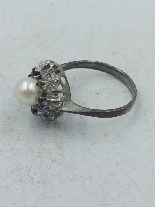 Perlenring mit dunkelblauen Steinen und kunstvoller silberfarbener Fassung im klassischen Stil