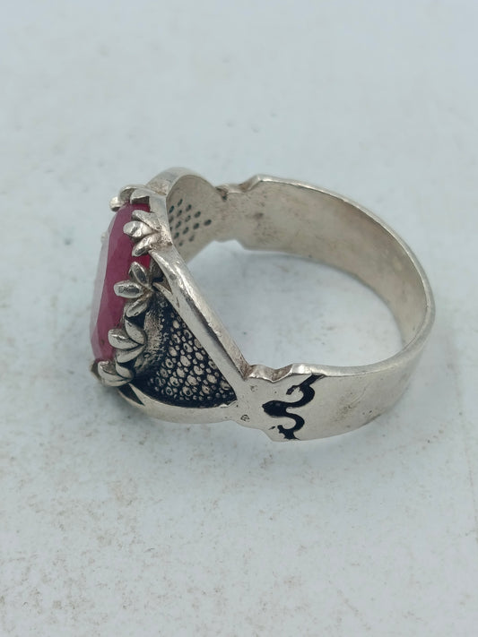 Silberring mit grossem rubinfarbenem Stein und kunstvoll verzierten Seitenflaechen im edlen Stil