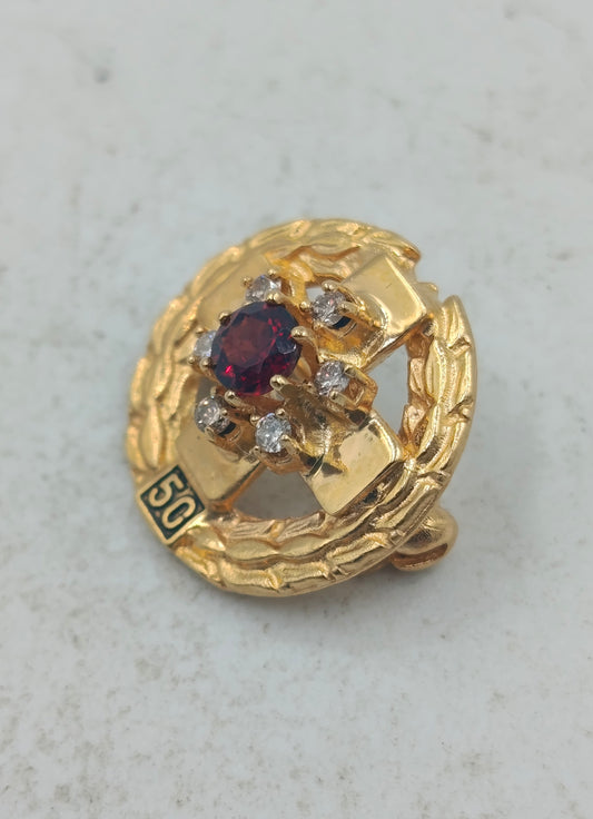 Goldfarbene Brosche mit rotem Mittelstein und funkelnden Akzenten im klassischen Stil