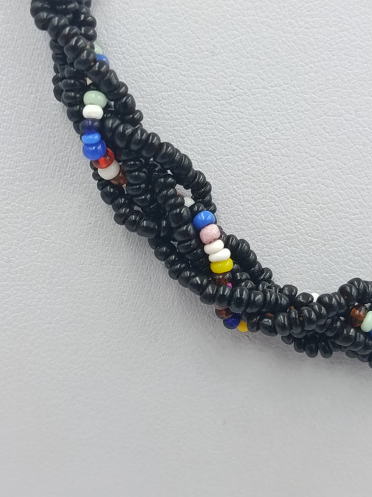 Bunte Glasperlenkette mit schwarzer Grundfarbe und dekorativem Mittelstein