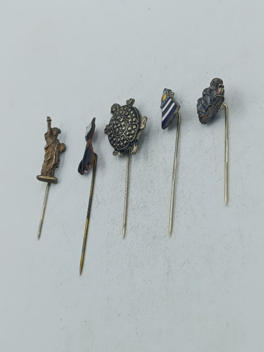 Dekoratives Set aus fünf Sammlernadeln mit Figuren Tier und maritimen Motiven im Vintage Stil