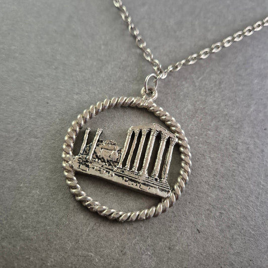 Silberfarbene Kette mit Anhänger – Antikes Tempelmotiv