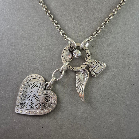 Silberfarbene Halskette mit Charms – Herz, Flügel & Love-Botschaften