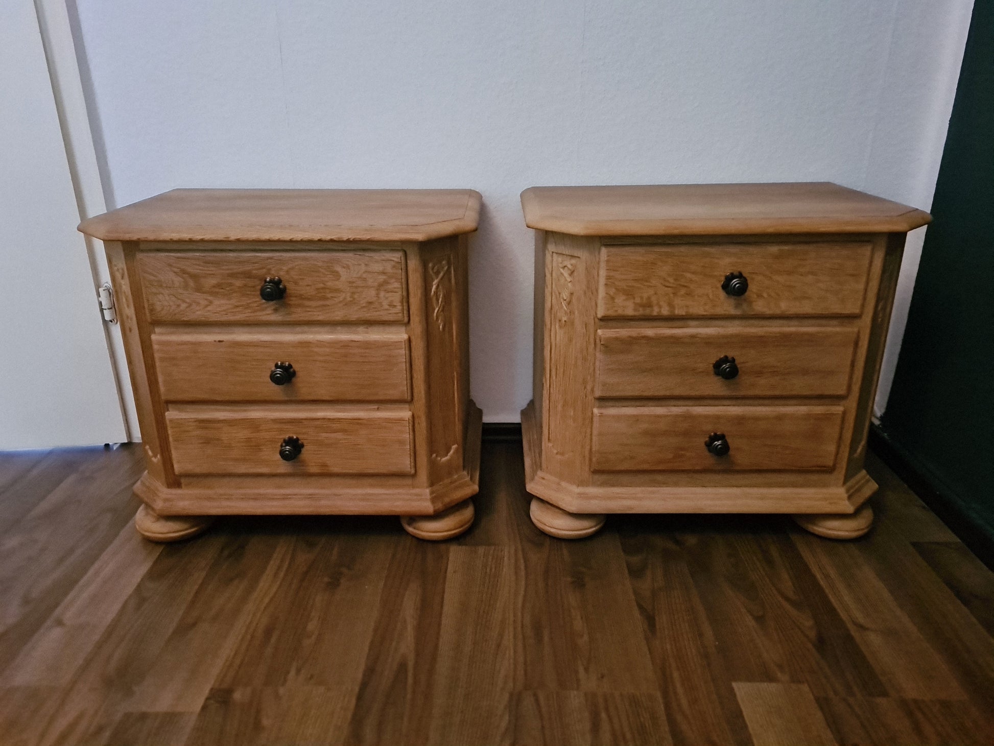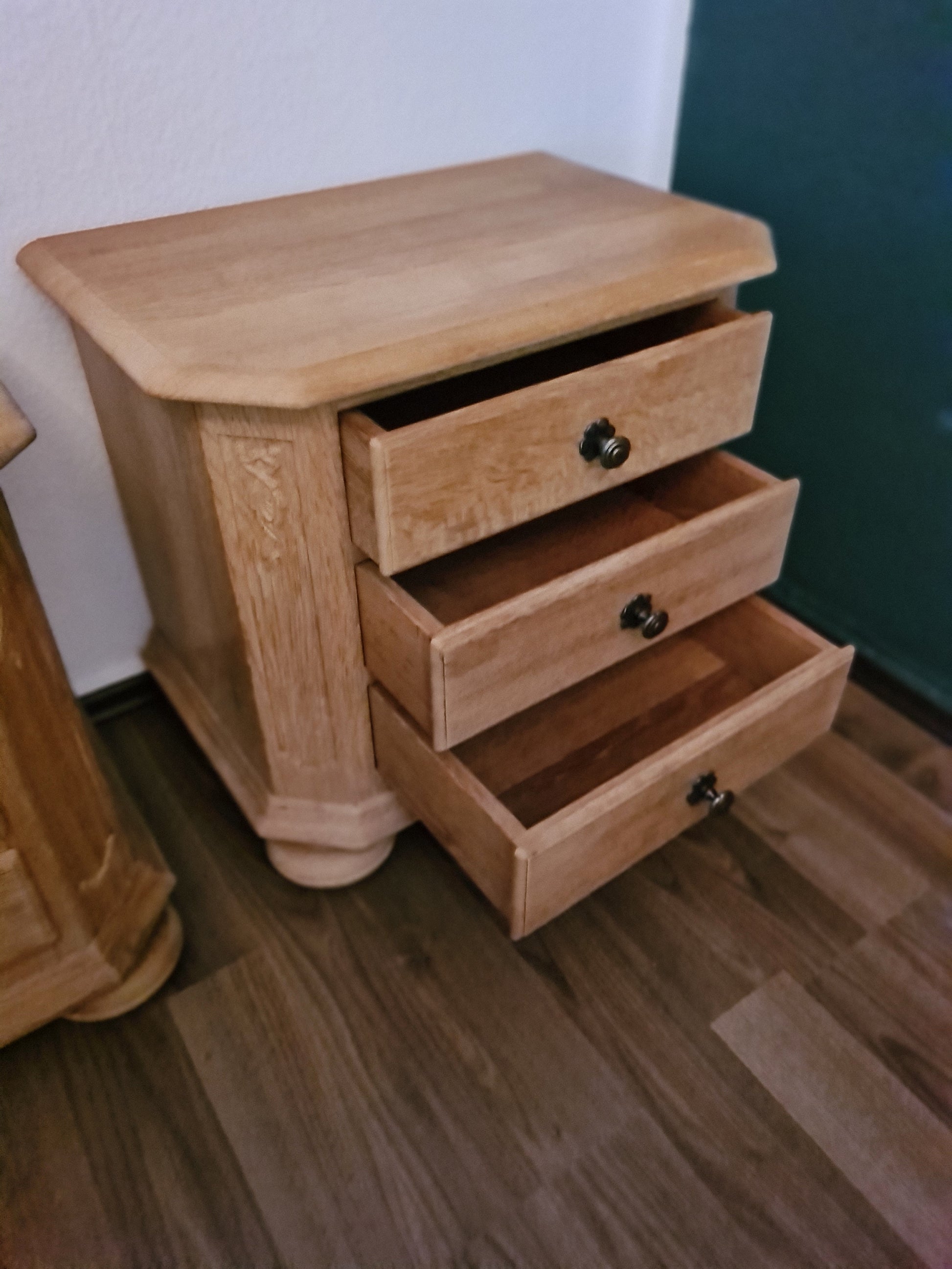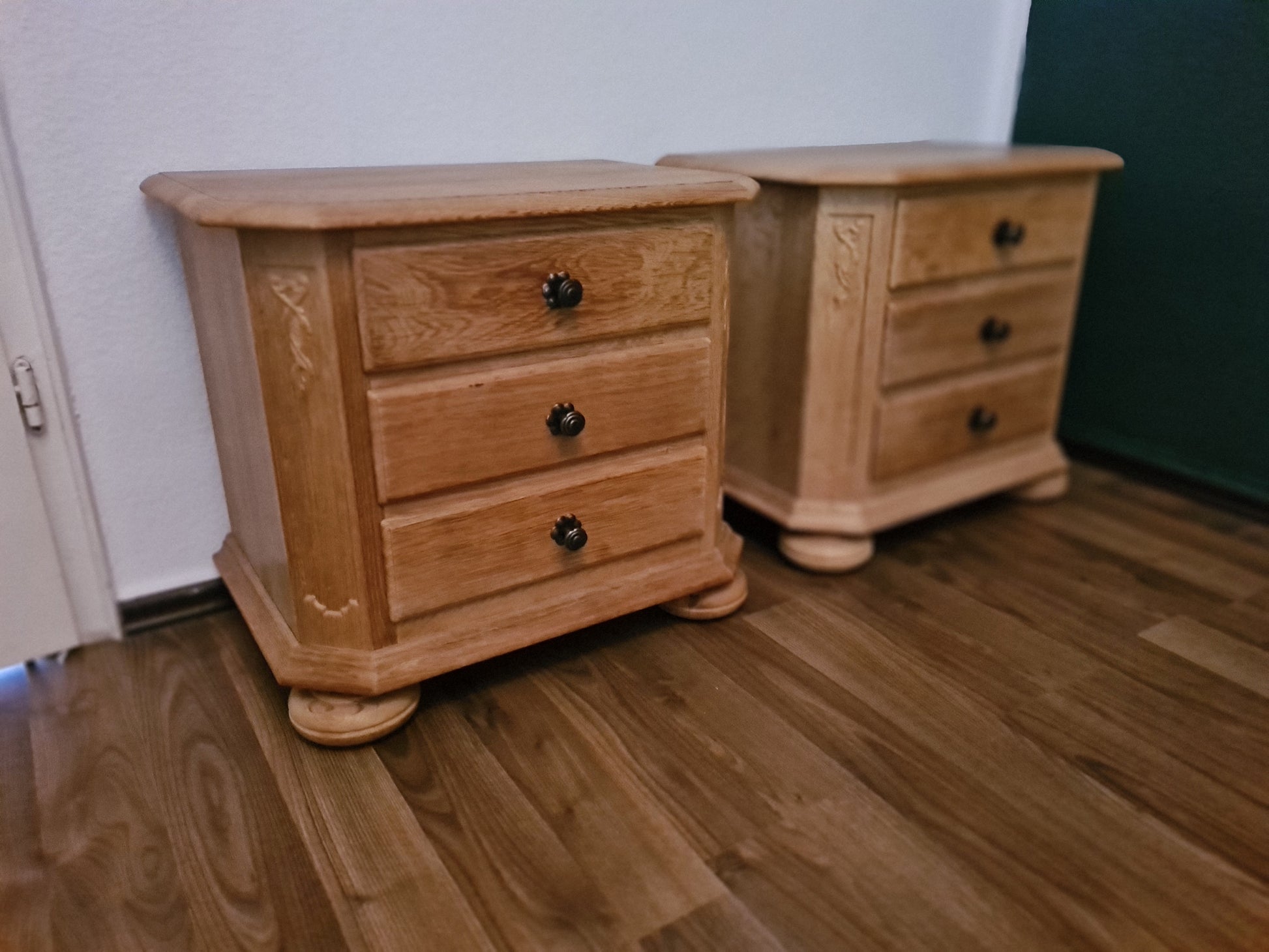 zum Verkauf steht ein Paar hochwertiger Nachtschränkchen aus massivem Holz. Die beiden Nachttische überzeugen durch ihre zeitlose Optik, stabile Verarbeitung und praktischen Stauraum. Mit je drei Schubladen bieten sie ausreichend Platz für persönliche Gegenstände im Schlafzimmer oder Gästezimmer. Die schön abgerundeten Kanten und dekorativen Beschläge verleihen ihnen einen klassischen Charakter.