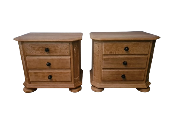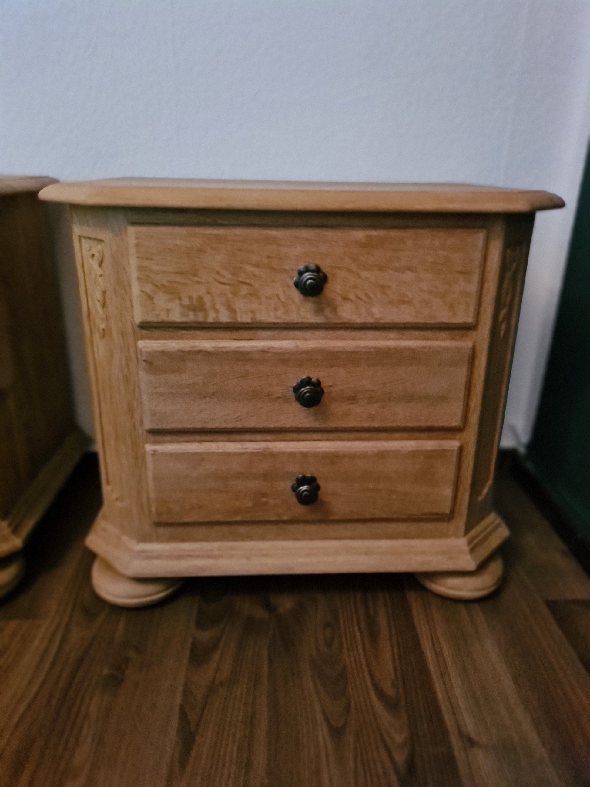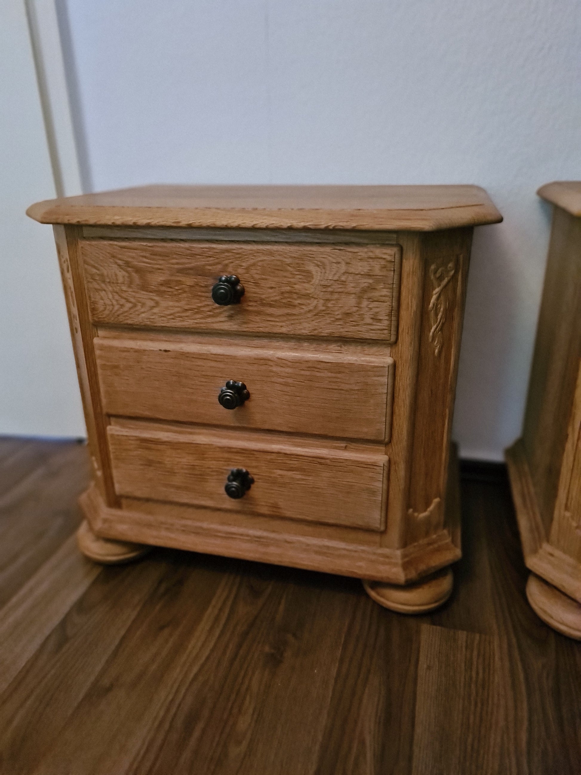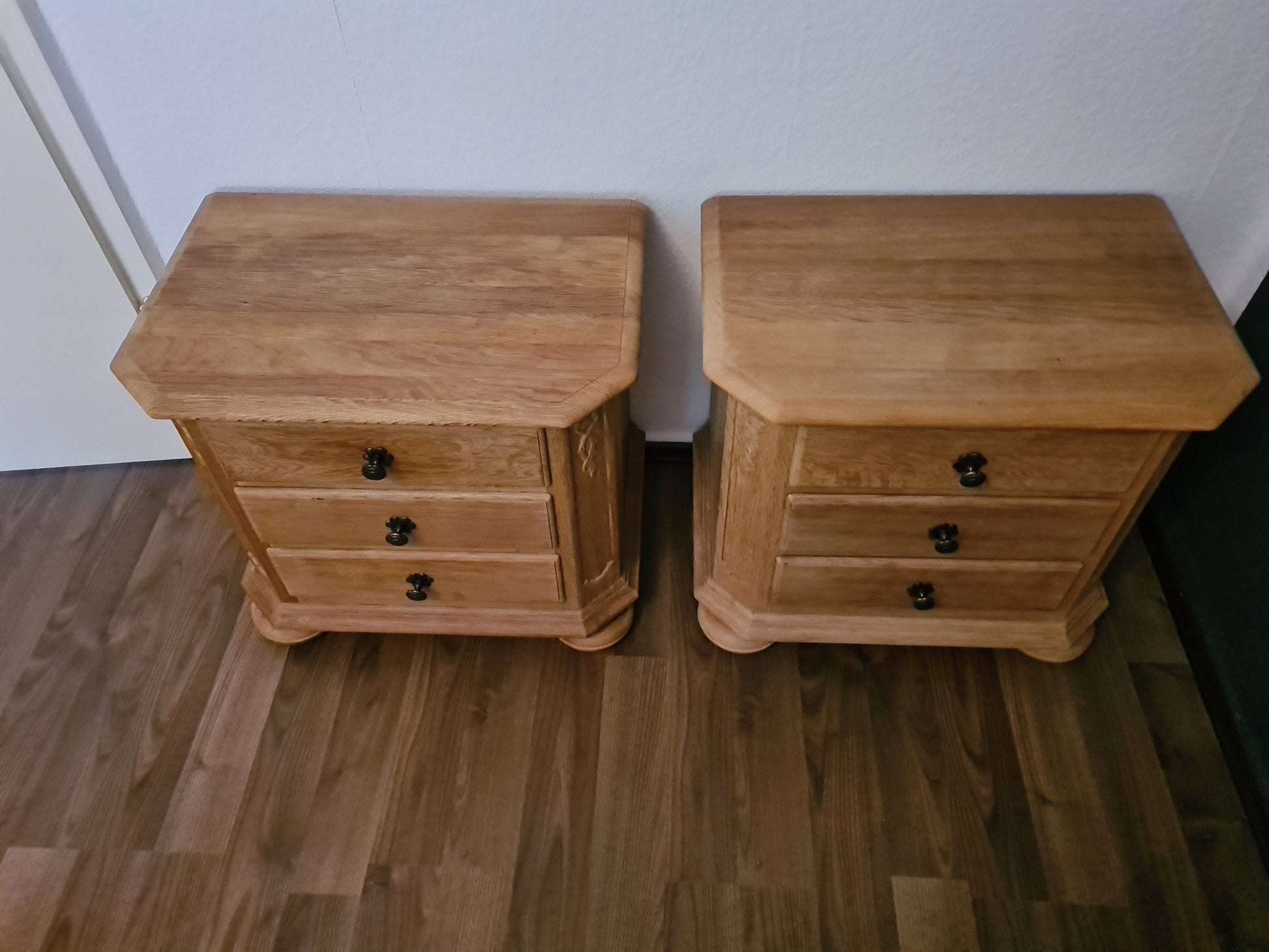zum Verkauf steht ein Paar hochwertiger Nachtschränkchen aus massivem Holz. Die beiden Nachttische überzeugen durch ihre zeitlose Optik, stabile Verarbeitung und praktischen Stauraum. Mit je drei Schubladen bieten sie ausreichend Platz für persönliche Gegenstände im Schlafzimmer oder Gästezimmer. Die schön abgerundeten Kanten und dekorativen Beschläge verleihen ihnen einen klassischen Charakter.