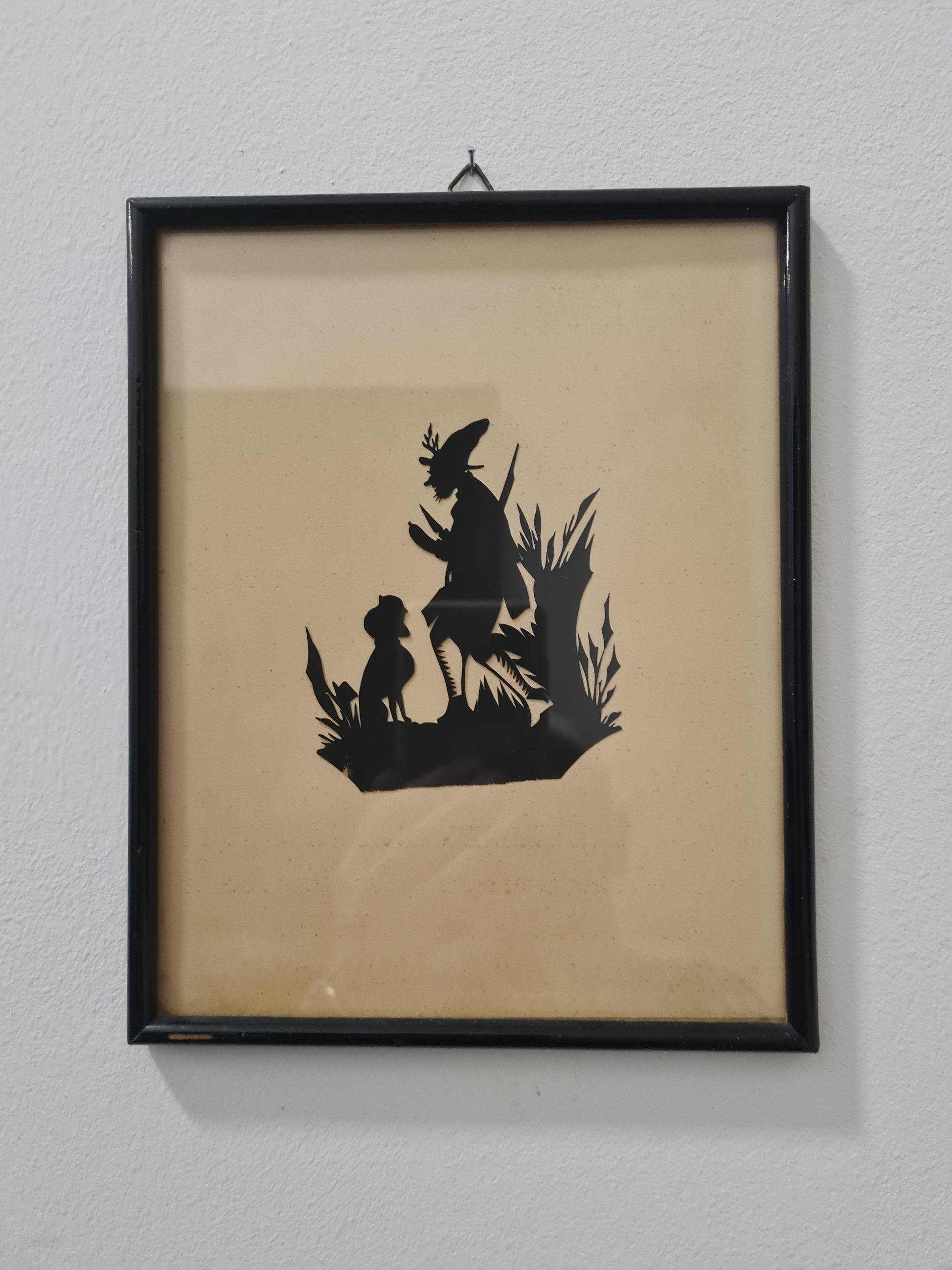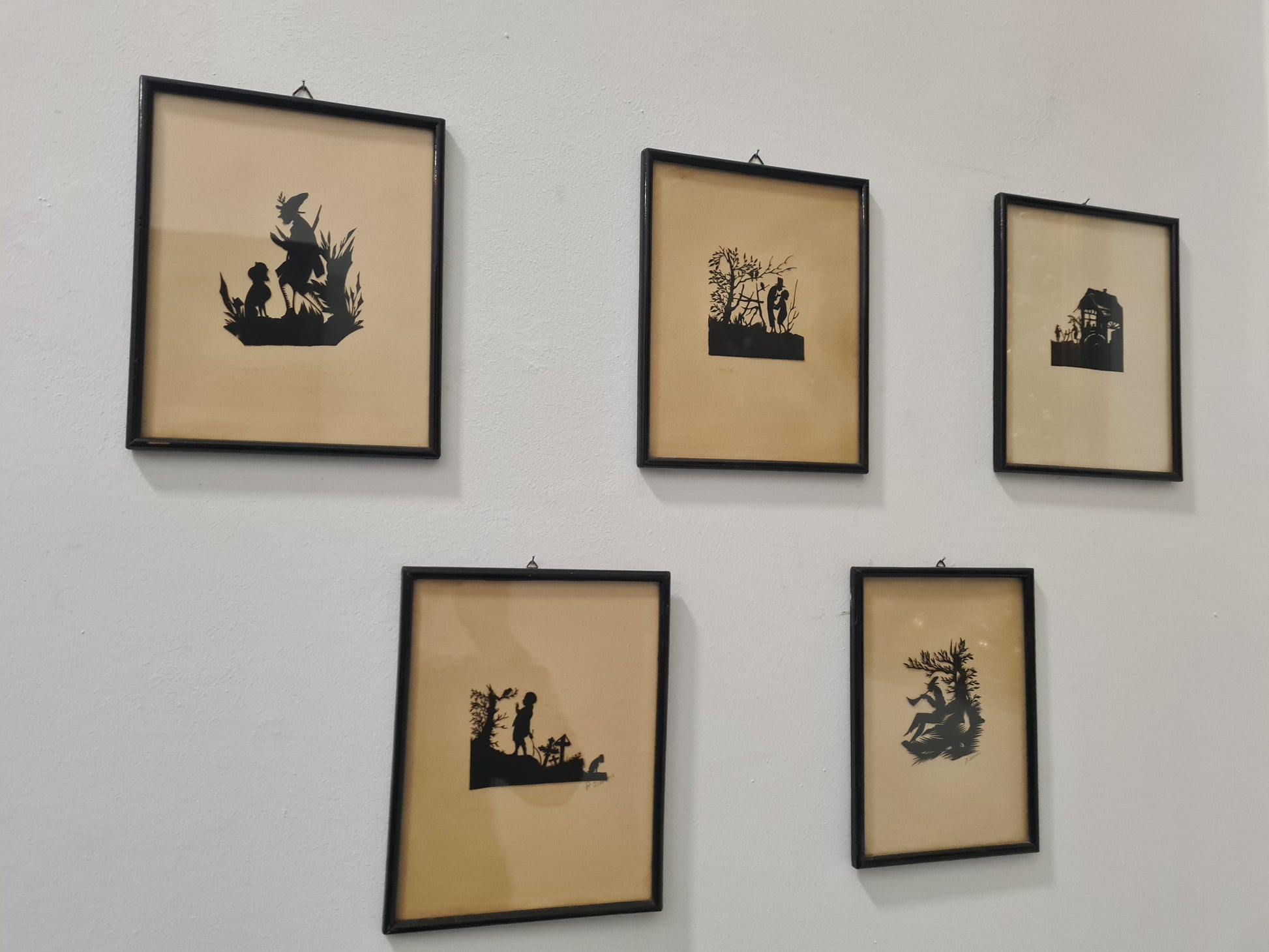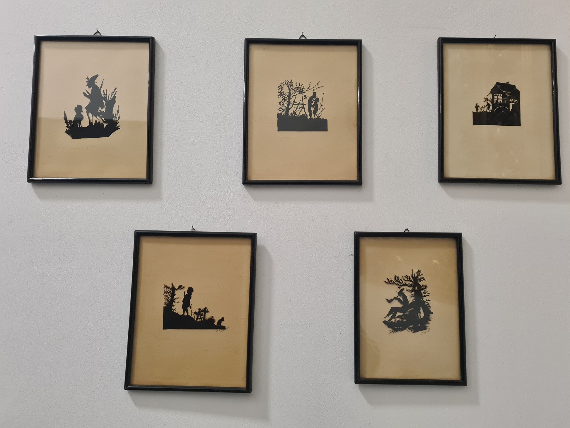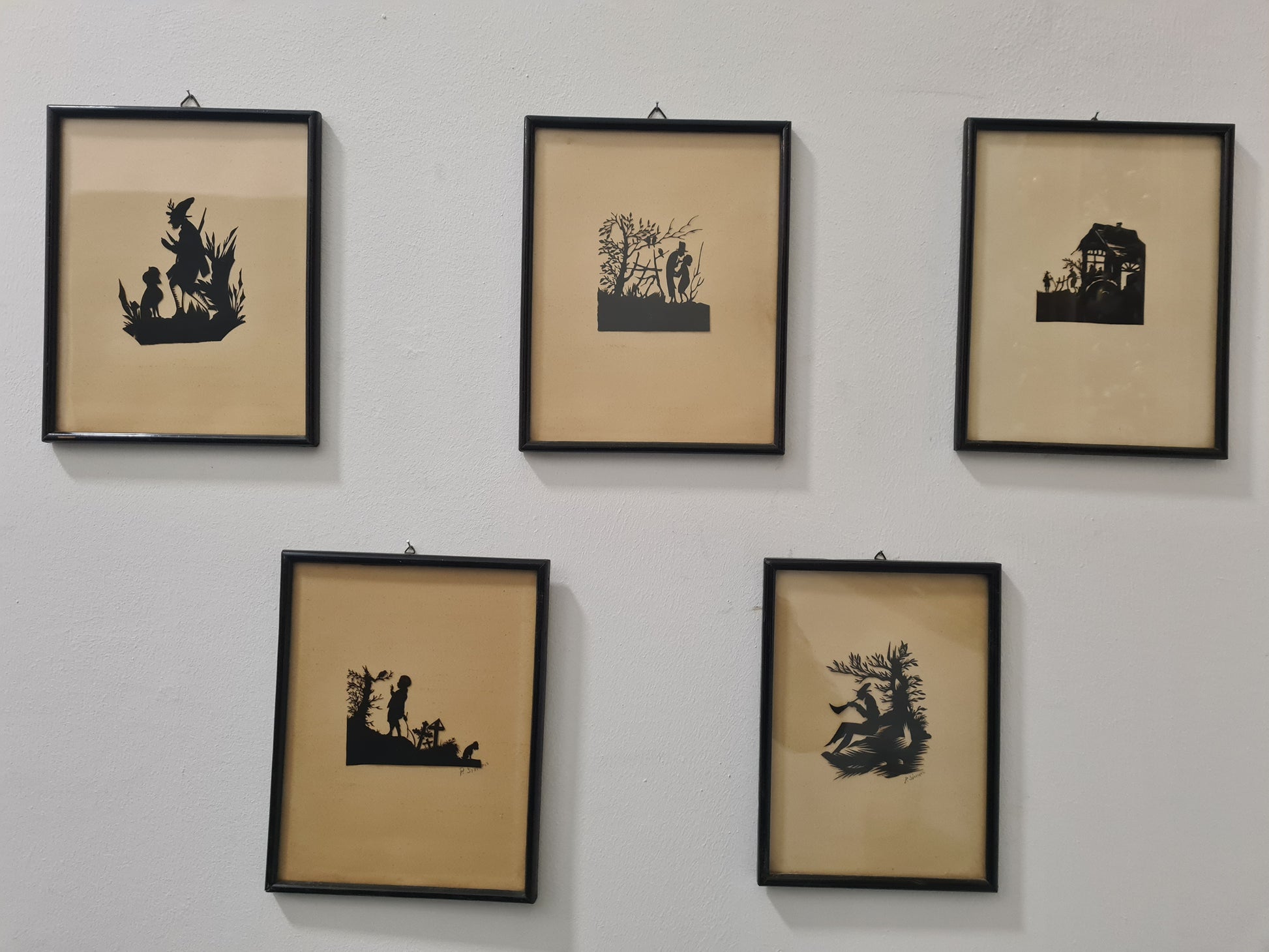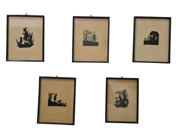 angeboten wird ein Set aus 5 Art-Déco-Scherenschnitten, stilvoll gerahmt in Holzrahmen – elegante Kunstwerke mit feinen Silhouetten.