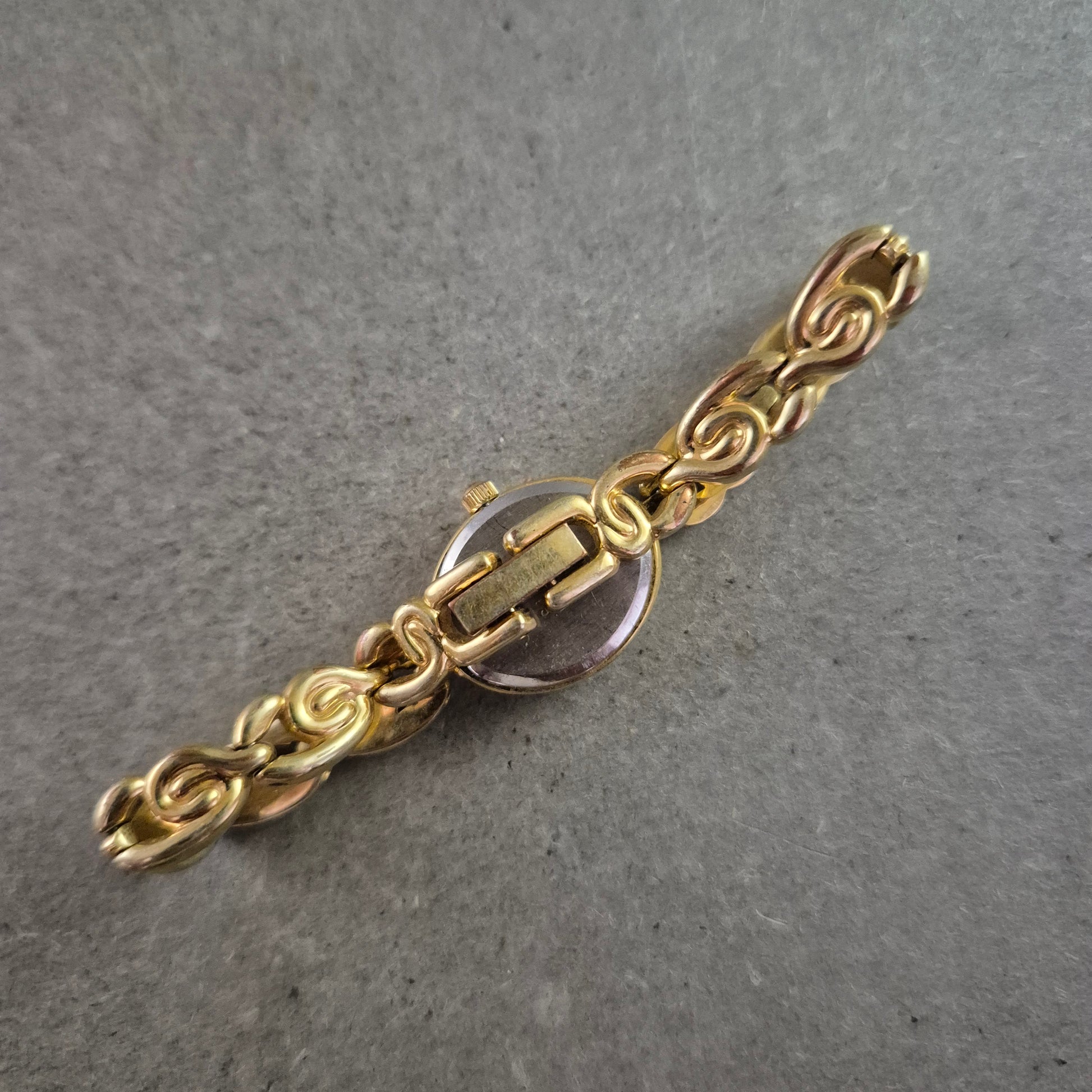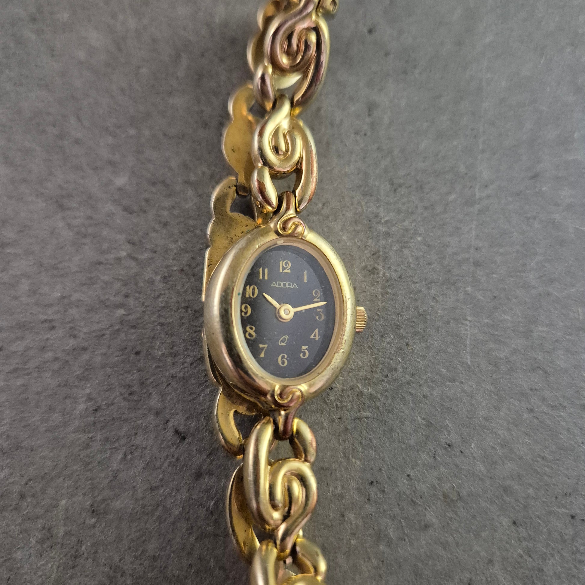 Diese elegante Damen Uhr von Adora kombiniert zeitloses Design mit einem dekorativen Armband. Das kleine ovale Gehäuse in Goldoptik umrahmt ein schwarzes Zifferblatt mit goldfarbenen Zahlen und Zeigern. Besonders auffällig ist das kunstvoll gestaltete Armband mit geschwungenen Gliedern, das der Uhr den Charakter eines Schmuckstücks verleiht. Ideal für Damen, die Funktionalität mit Schmuckoptik verbinden möchten.