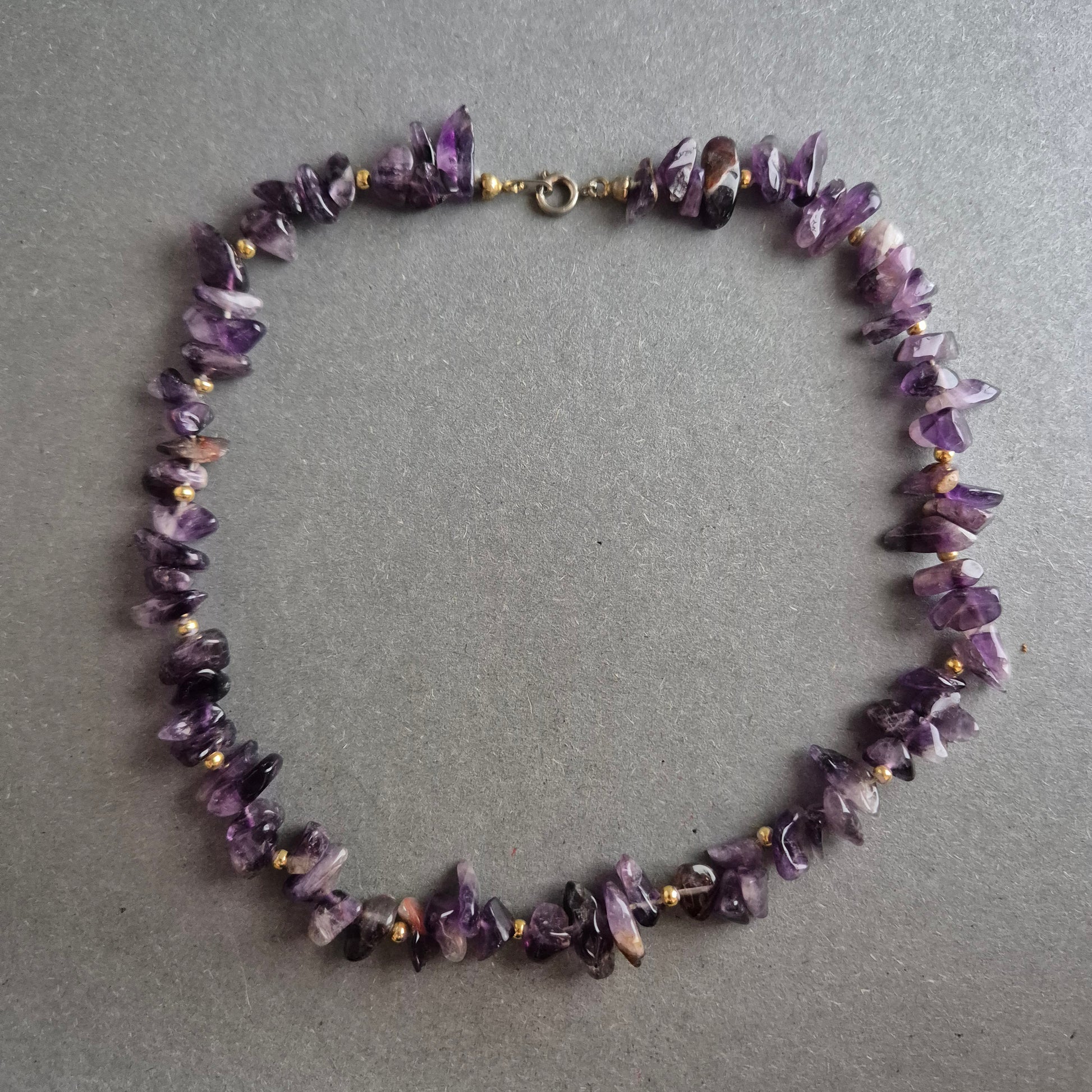 Diese elegante Halskette besteht aus echten Amethyst-Splittern, die in natürlichen Formen und Schattierungen gehalten sind. Zwischen den violetten Edelsteinen setzen kleine goldfarbene Perlen stilvolle Akzente. Die Kette strahlt einen natürlichen, leicht spirituellen Charakter aus und eignet sich perfekt für Boho-Styles oder als Statement-Schmuck für den Alltag.