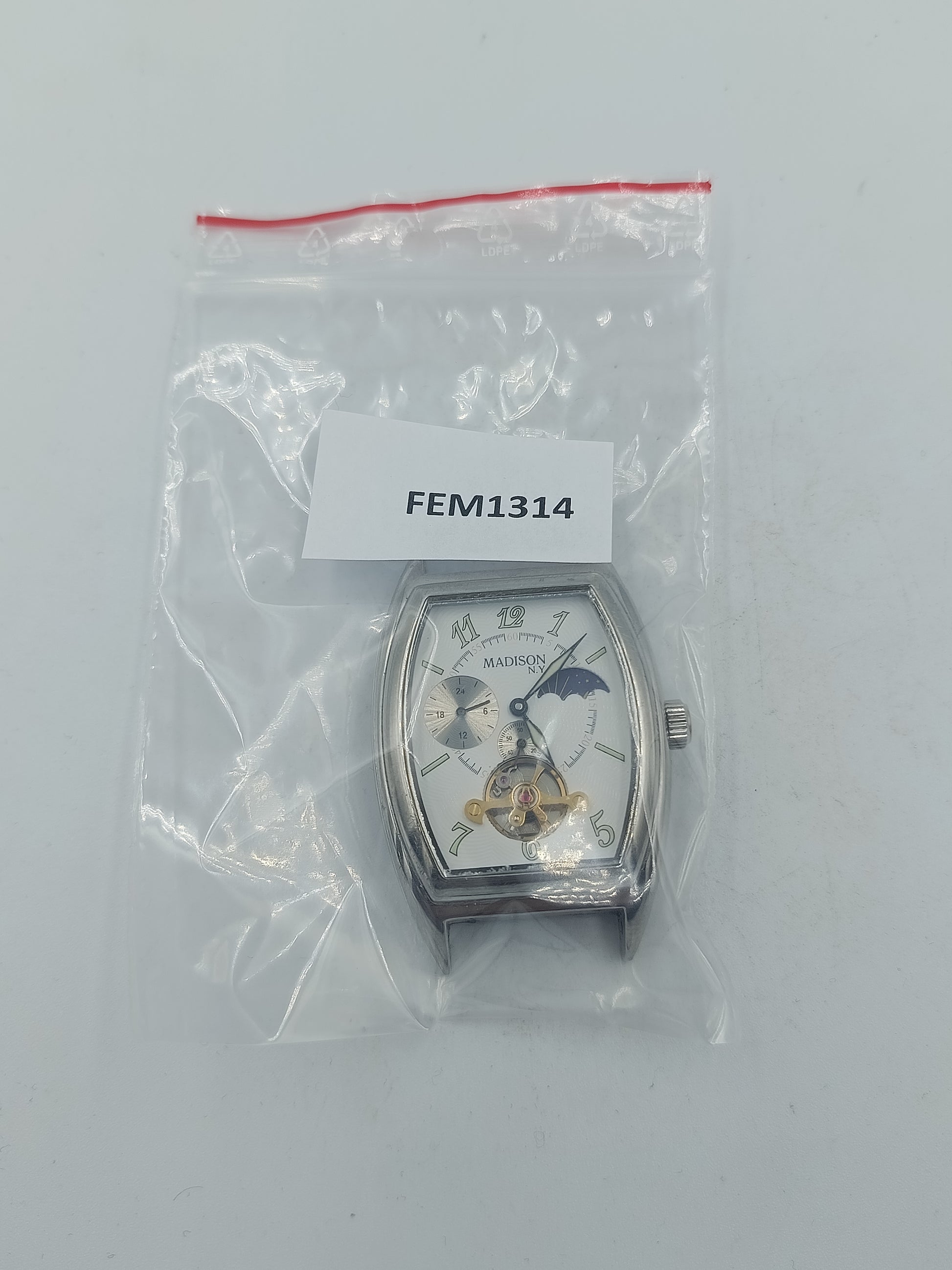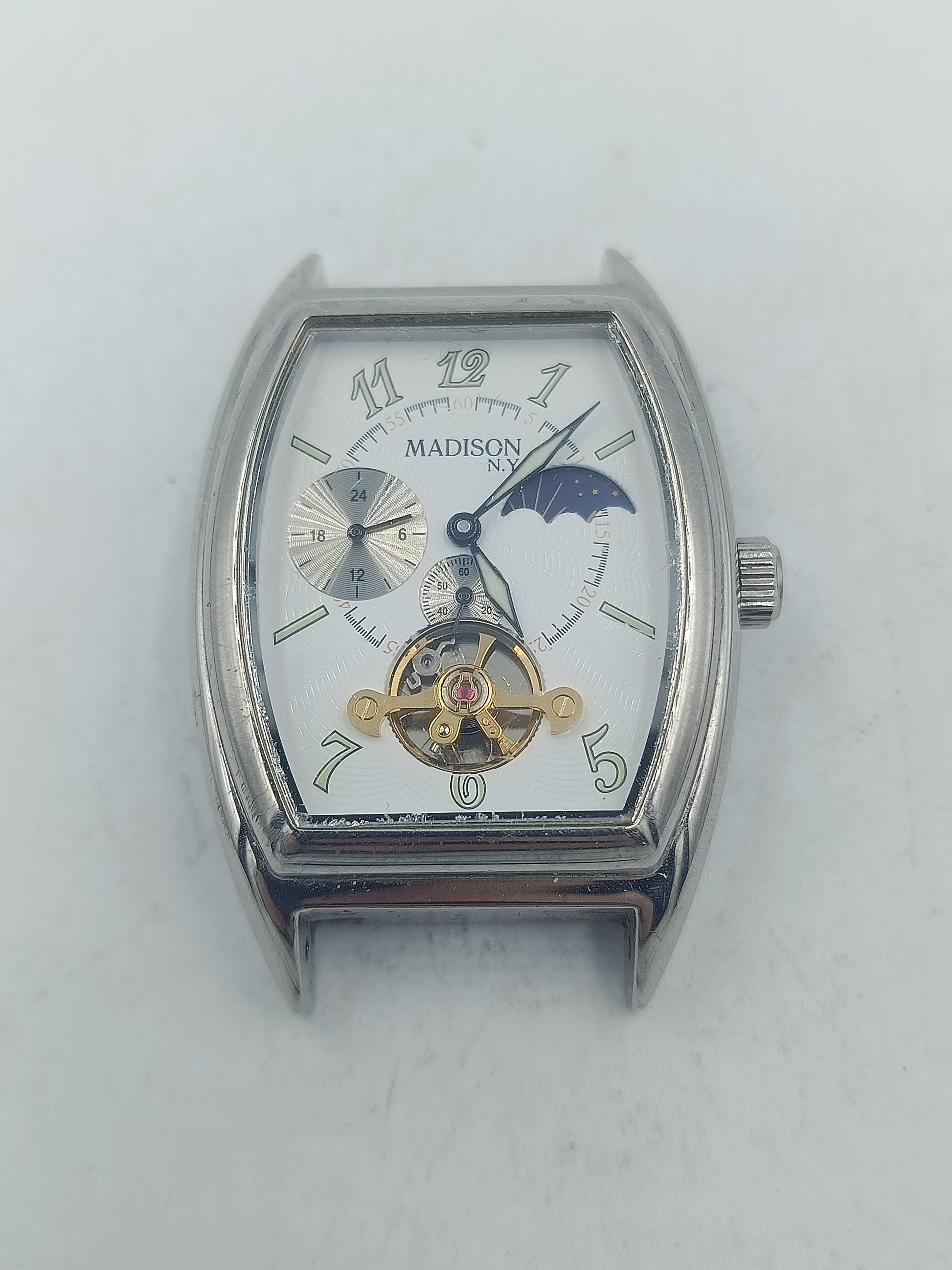 Diese elegante Armbanduhr von Madison überzeugt durch ihr außergewöhnliches Zifferblatt mit sichtbarem Uhrwerk und zusätzlichen Anzeigen. Das silberfarbene Gehäuse in rechteckiger Form verleiht der Uhr eine moderne und zugleich klassische Ausstrahlung. Ideal für Liebhaber besonderer Designs und markanter Zeitmesser geeignet.