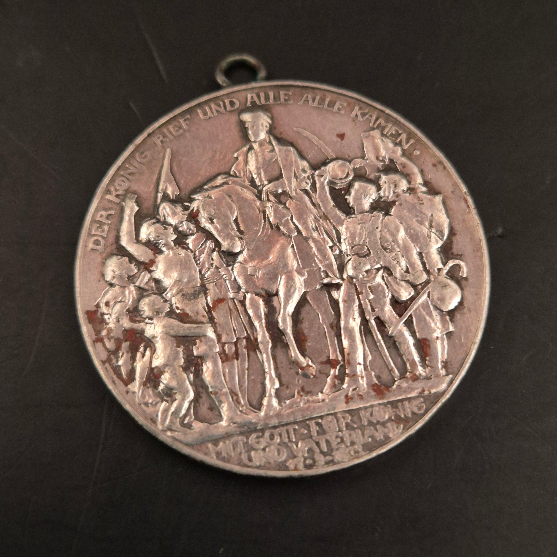 Dieser einzigartige Anhänger wurde aus einer originalen 3-Mark-Silbermünze des Deutschen Kaiserreichs aus dem Jahr 1913 gefertigt. Auf der Vorderseite ist der kaiserliche Reichsadler zu sehen, während die Rückseite eine patriotische Szene mit der Inschrift „Der König rief und alle alle kamen“ sowie „Mit Gott für König und Vaterland“ zeigt. Durch die angebrachte Öse lässt sich der Anhänger bequem an einer Kette tragen – ein besonderes Schmuckstück mit historischem Wert und Charakter.