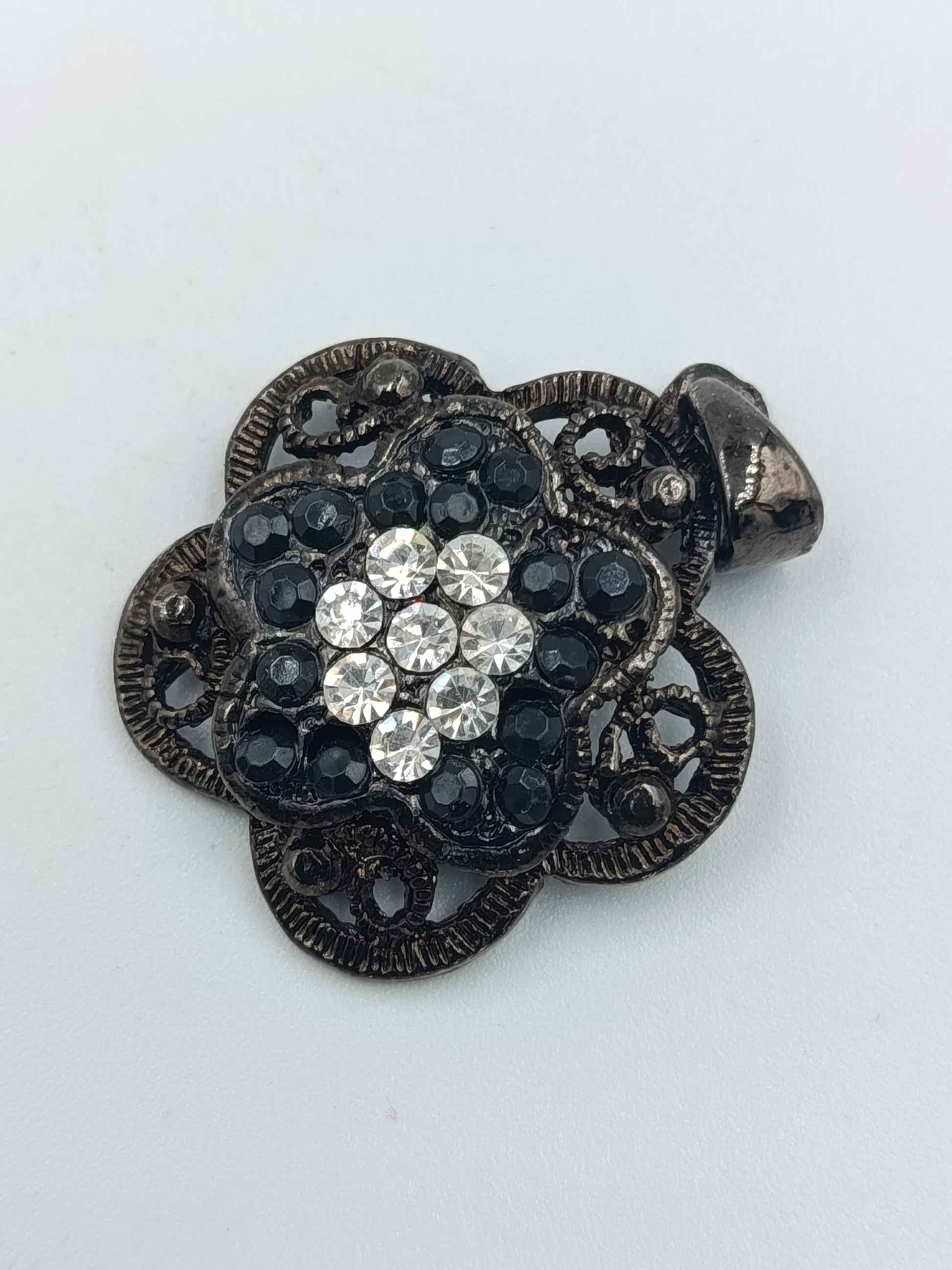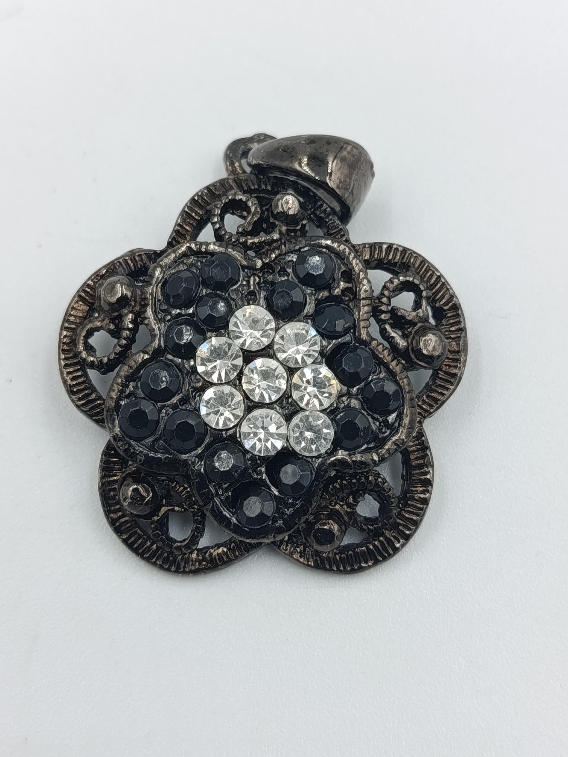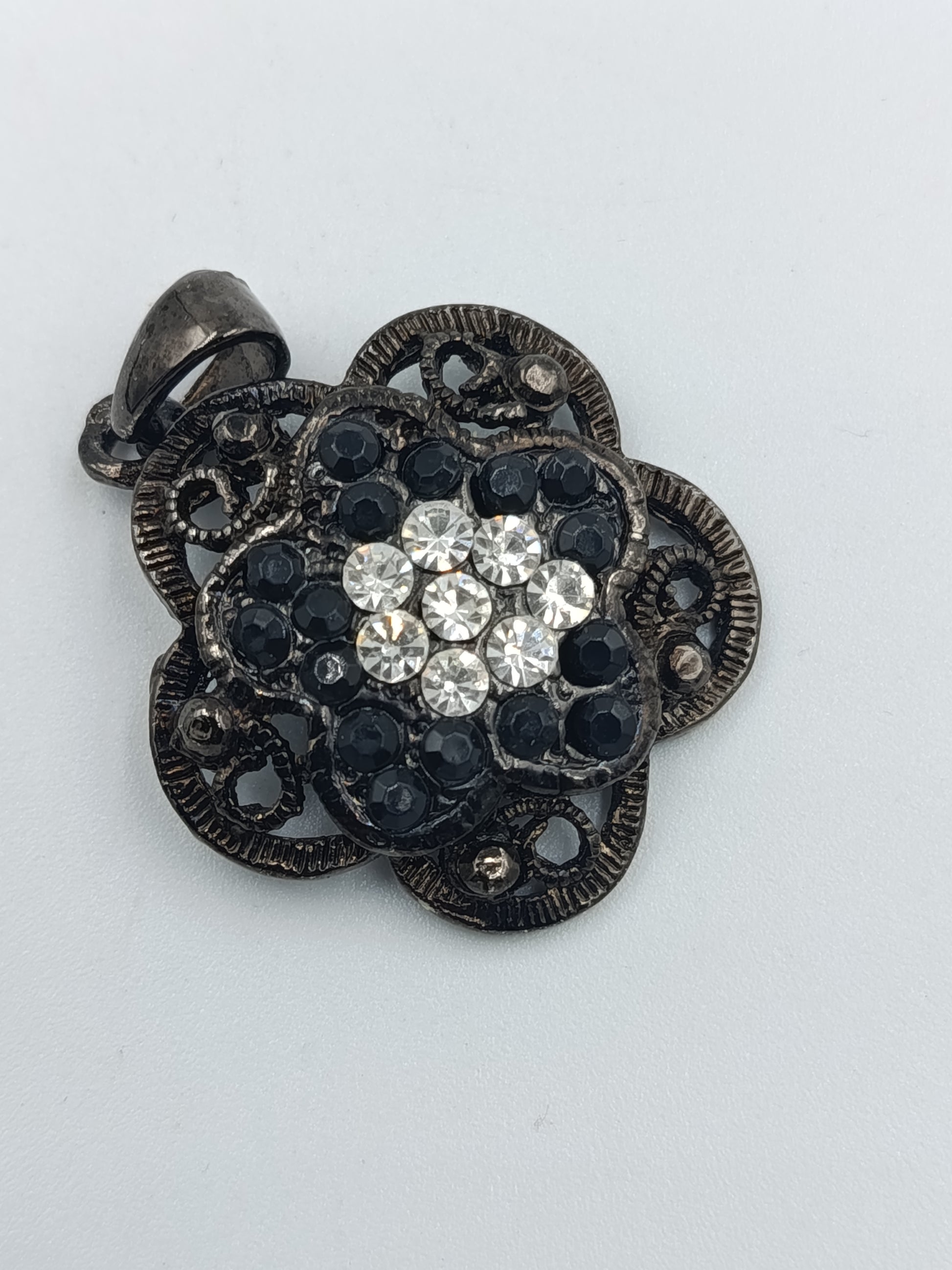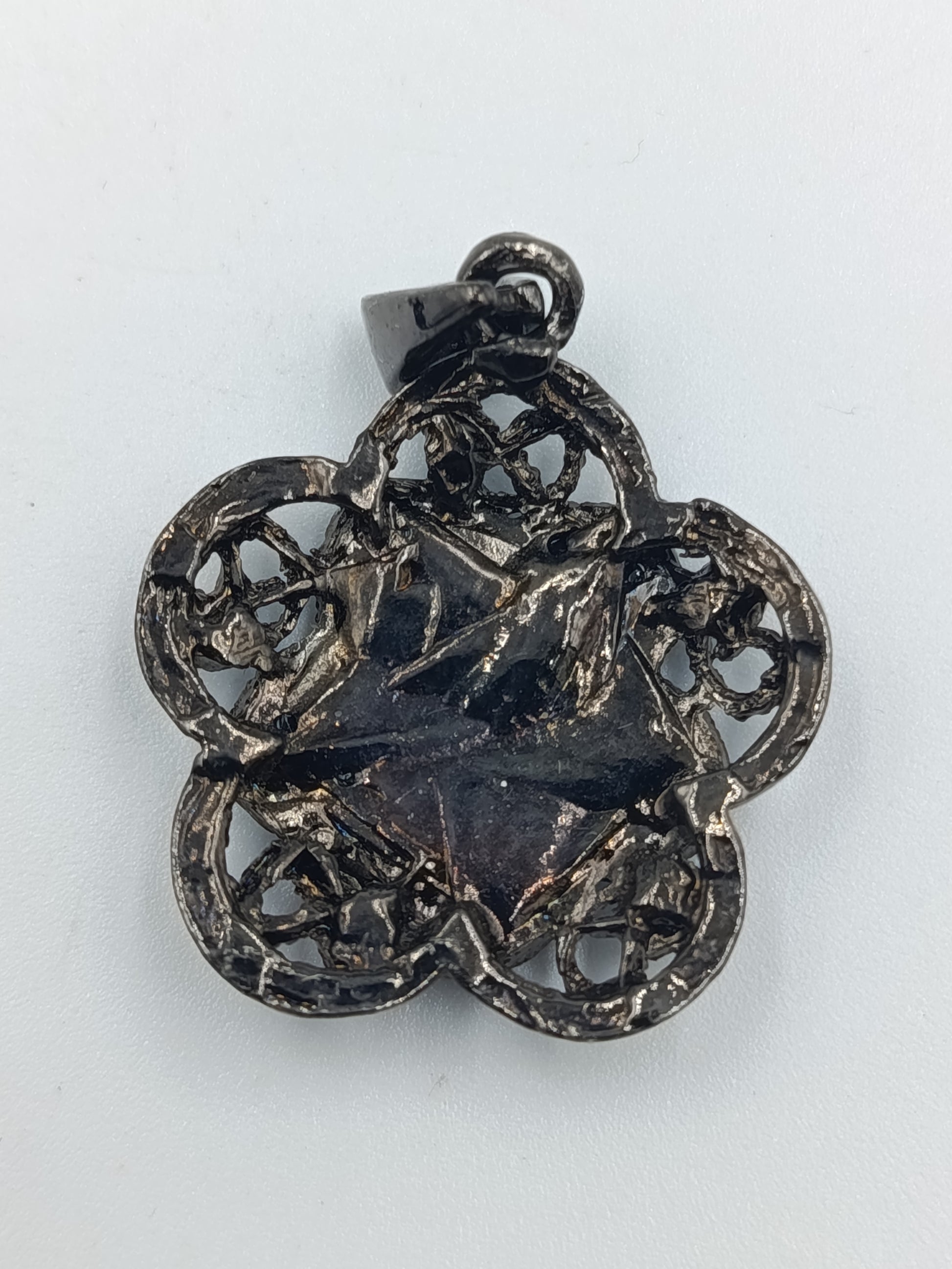 Dunkelmetallener Anhänger in Form einer Blüte mit filigraner, ornamentaler Fassung.