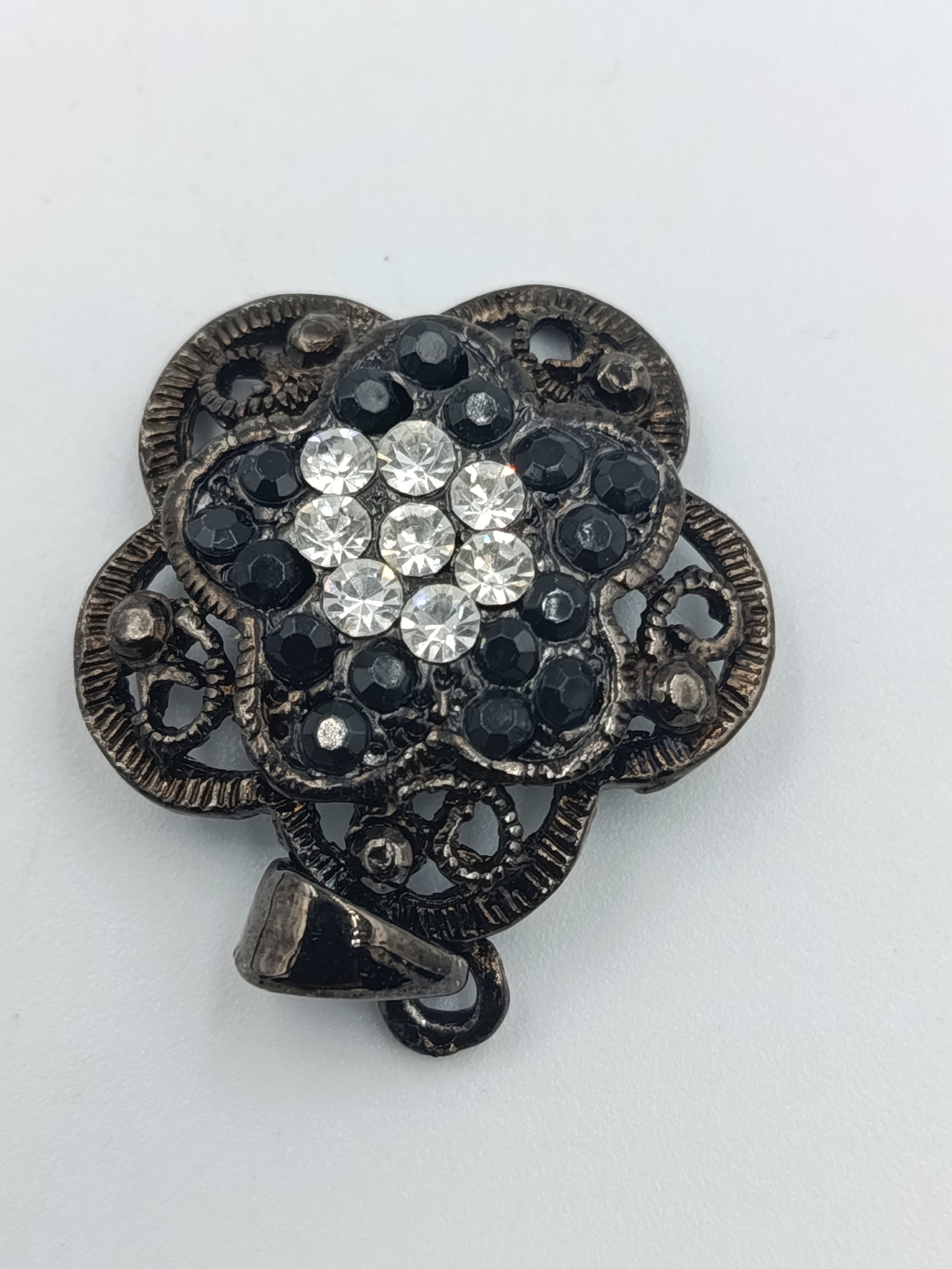 Die Mitte ist besetzt mit funkelnden klaren Strasssteinen, umgeben von schwarz glänzenden Steinen.