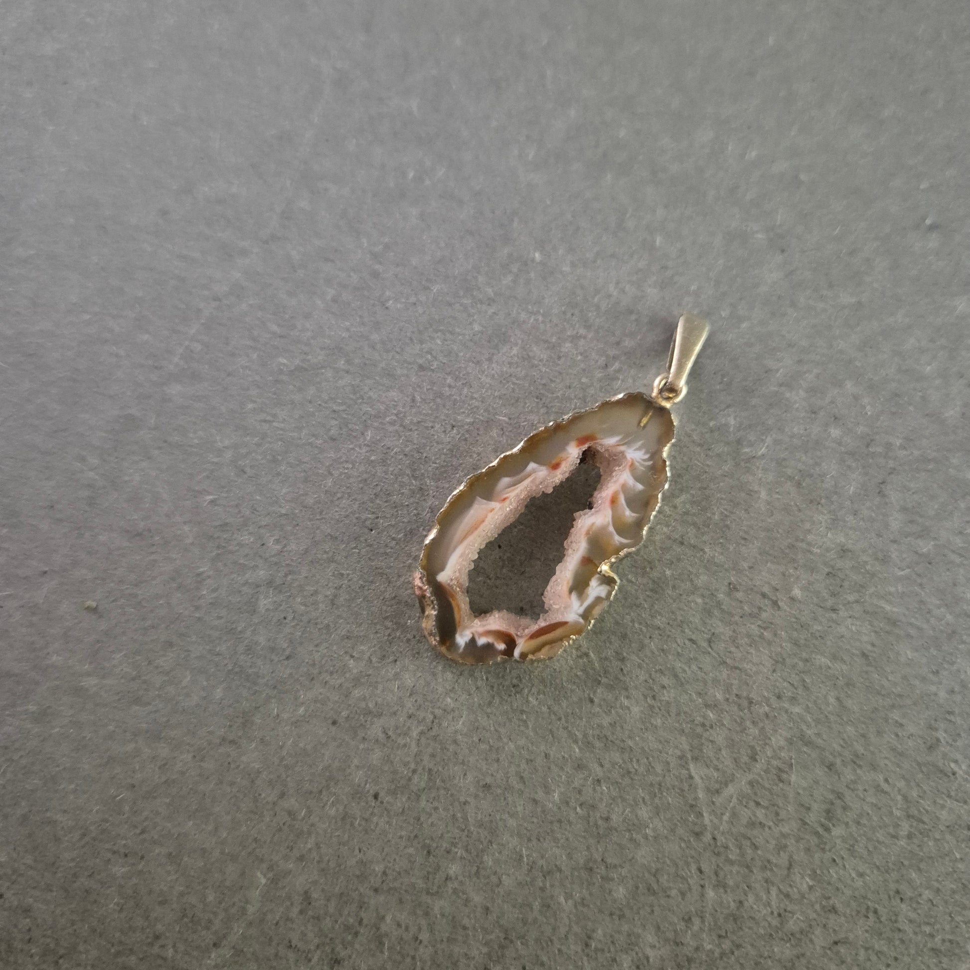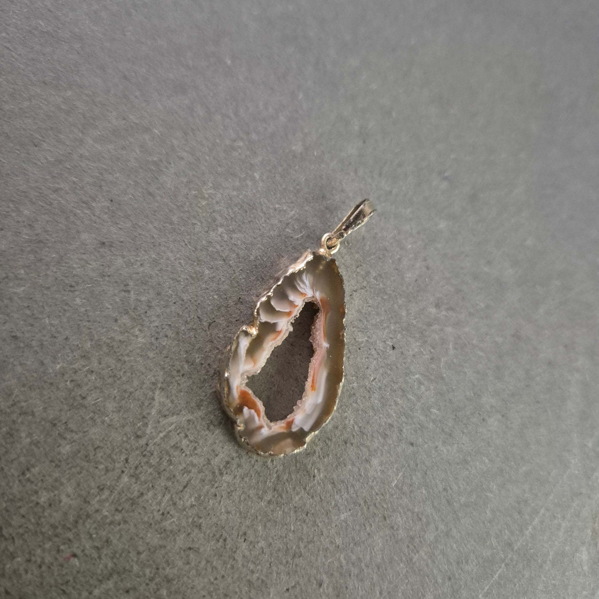 Dieser elegante Anhänger besticht durch seine natürliche Schönheit. Der Stein ist eine Achatdruse in Tropfenform, die durch ihre offene Mitte und die zarten Kristallstrukturen einen einzigartigen Blickfang bietet. Die Kanten sind dezent vergoldet, was den Anhänger edel abrundet. Perfekt geeignet, um an einer schlichten Kette getragen zu werden und jedem Outfit eine individuelle, naturverbundene Note zu verleihen.