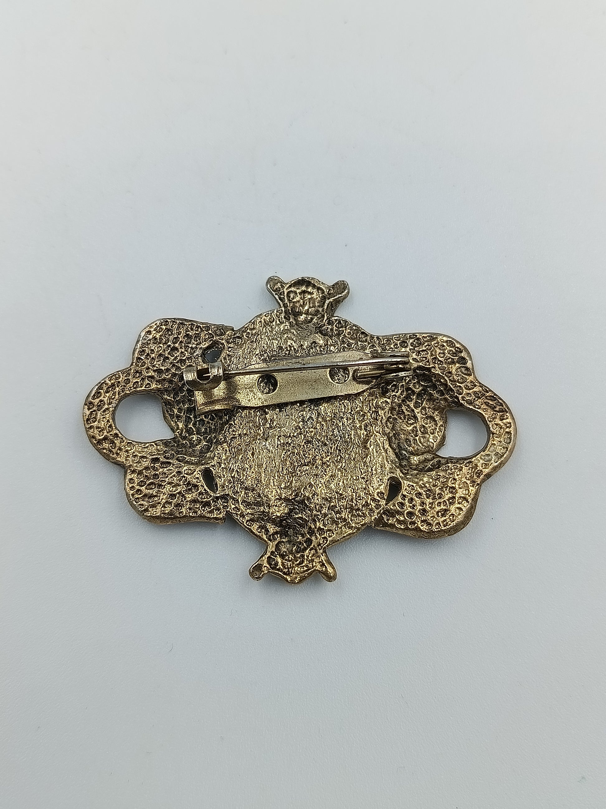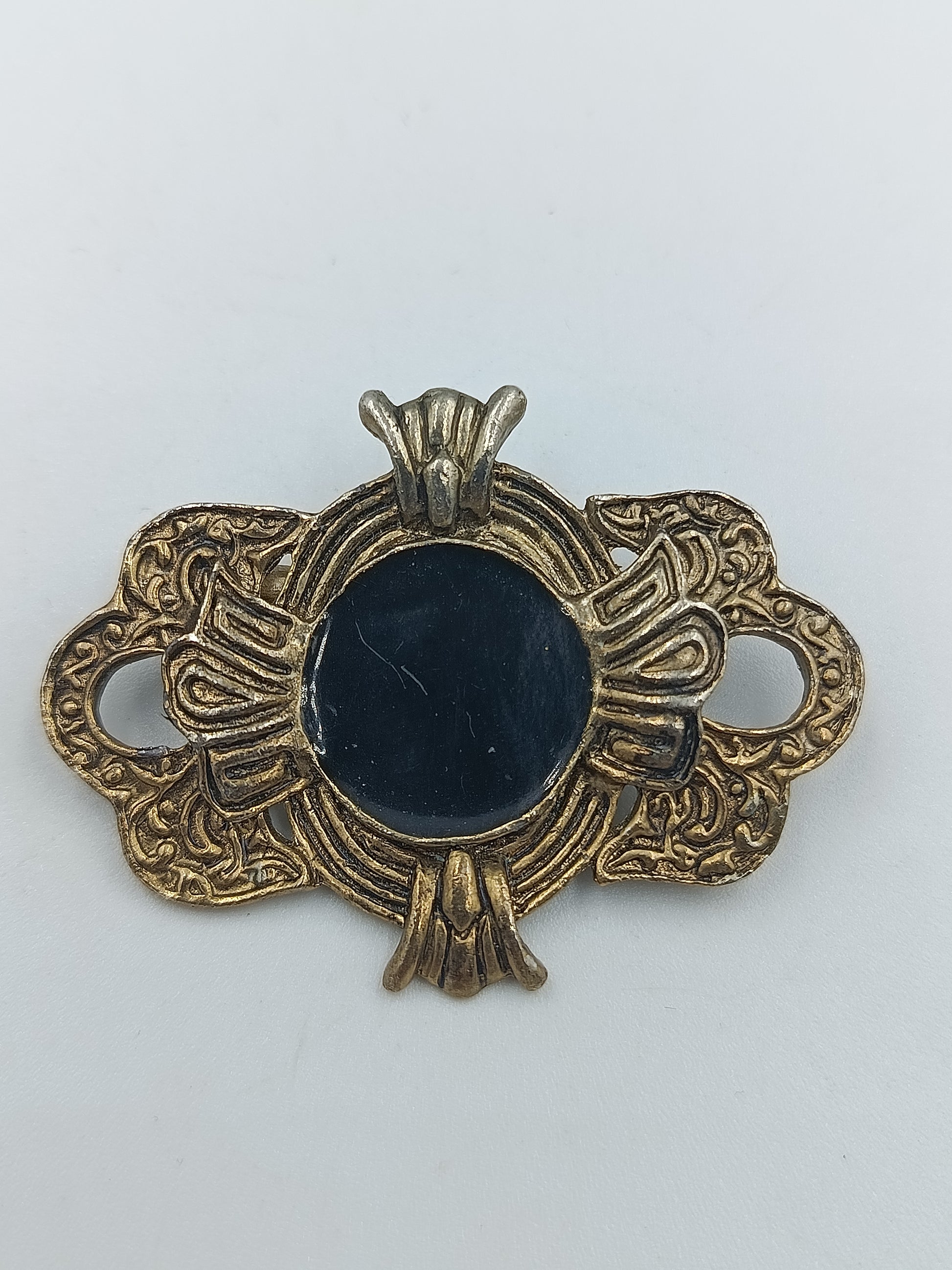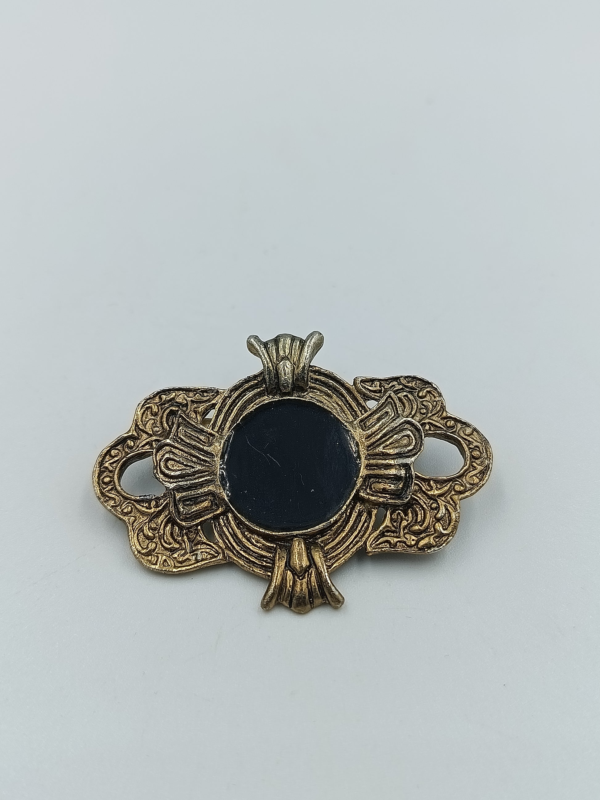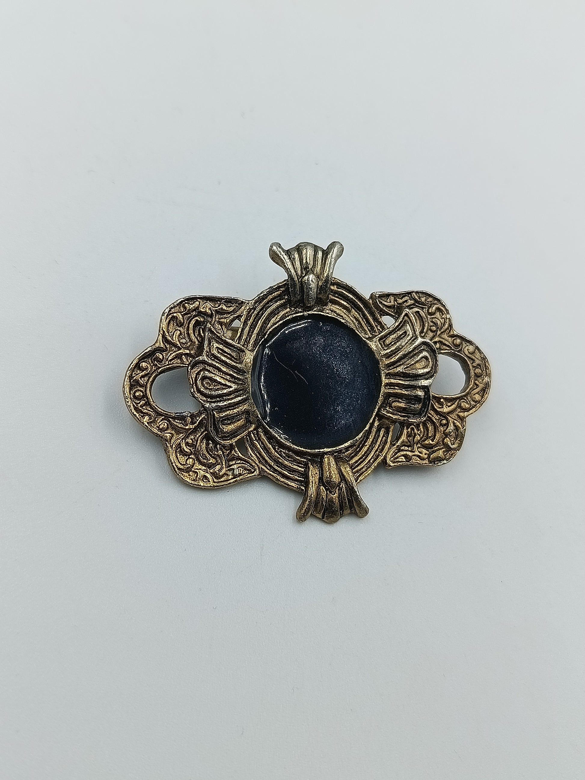 Charmante Brosche im antiken Stil, gefertigt aus bronzefarbenem Metall mit kunstvollen Ornament-Verzierungen. Im Zentrum sitzt ein ovaler, dunkelblauer Cabochon-Stein, der der Brosche eine elegante Tiefe und klassische Ausstrahlung verleiht. Ideal als Akzent an Blusen, Schals oder Jacken.