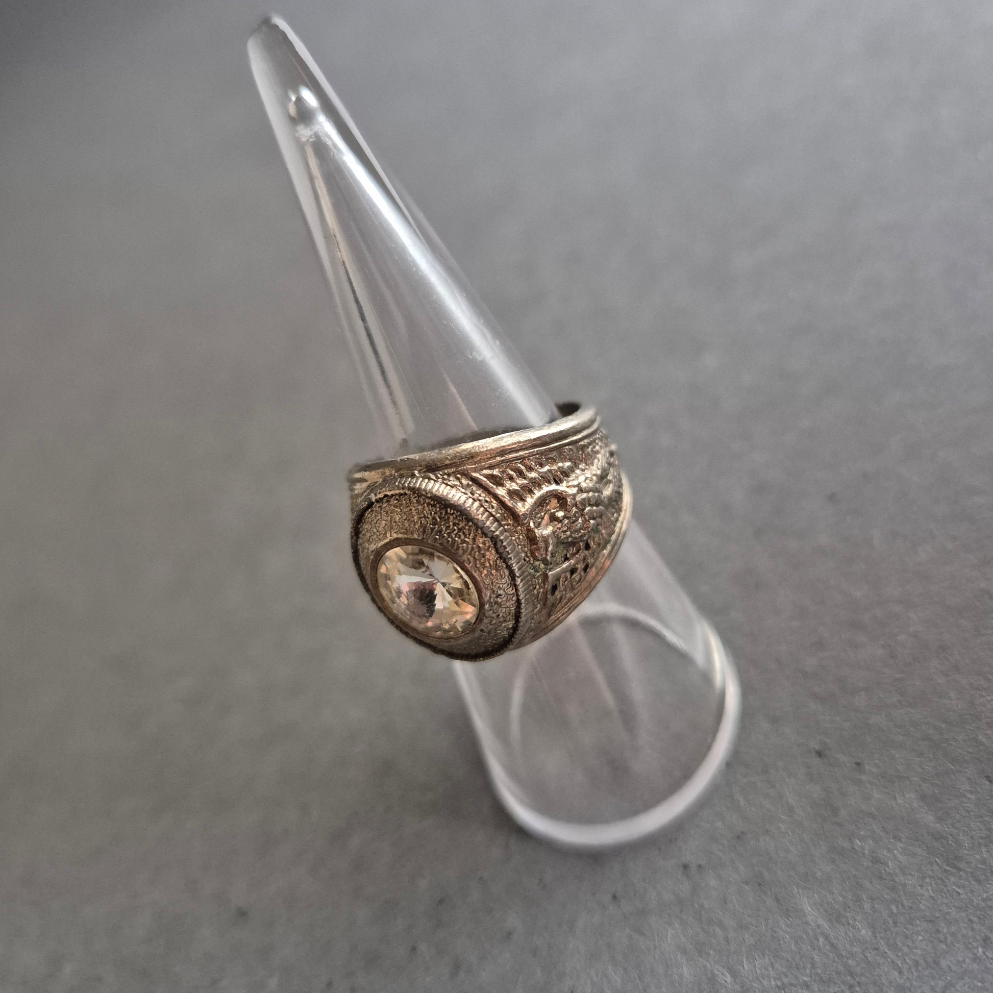 Dieser auffällige Ring mit großem, klaren Glasstein im Zentrum beeindruckt durch sein aufwendig gearbeitetes, ornamentales Muster im orientalischen Stil. Die silberfarbene Oberfläche wirkt antik und verleiht dem Schmuckstück eine mystische Ausstrahlung. Ideal für Vintage-Looks oder als Statement-Accessoire mit Ethno-Flair.