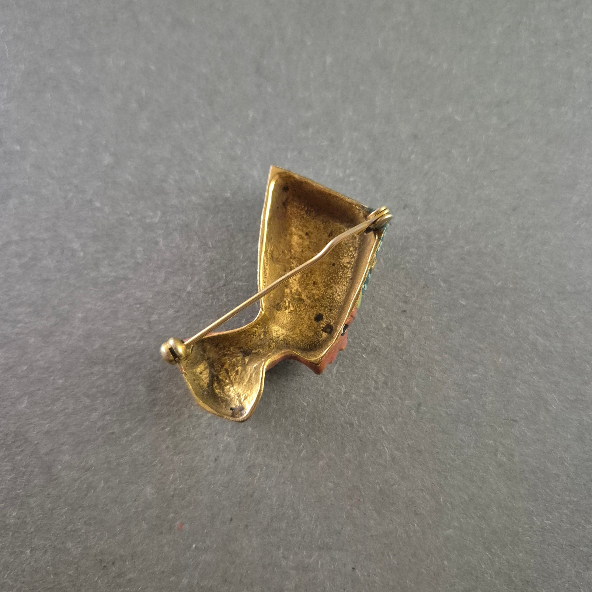 Diese charmante Vintage-Anstecknadel zeigt das ikonische Profil der Nofretete, der berühmten Königin des Alten Ägyptens. Mit fein gearbeiteten Details und lebendiger Emaille-Malerei in Blau, Gold und Rot zieht diese Brosche garantiert Blicke auf sich. Die Rückseite besteht aus einer vergoldeten Metalllegierung mit klassischer Nadelbefestigung. Ideal als Sammlerstück oder als stilvoller Akzent an Kleidung, Tuch oder Hut.