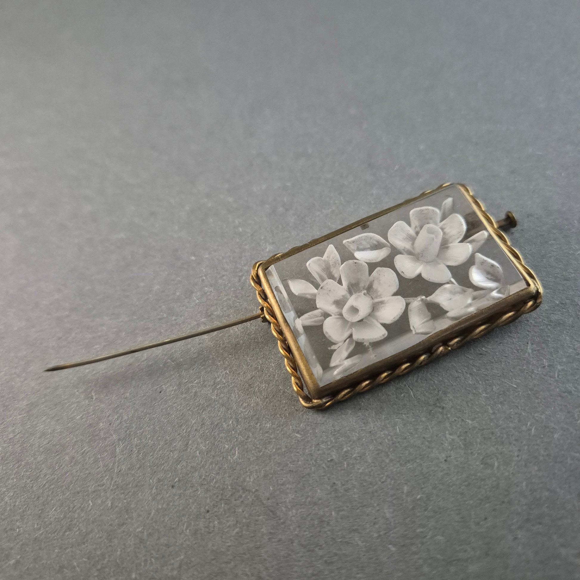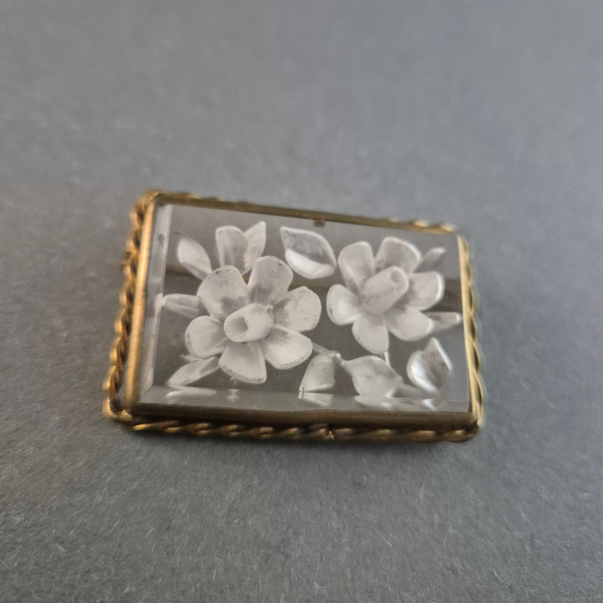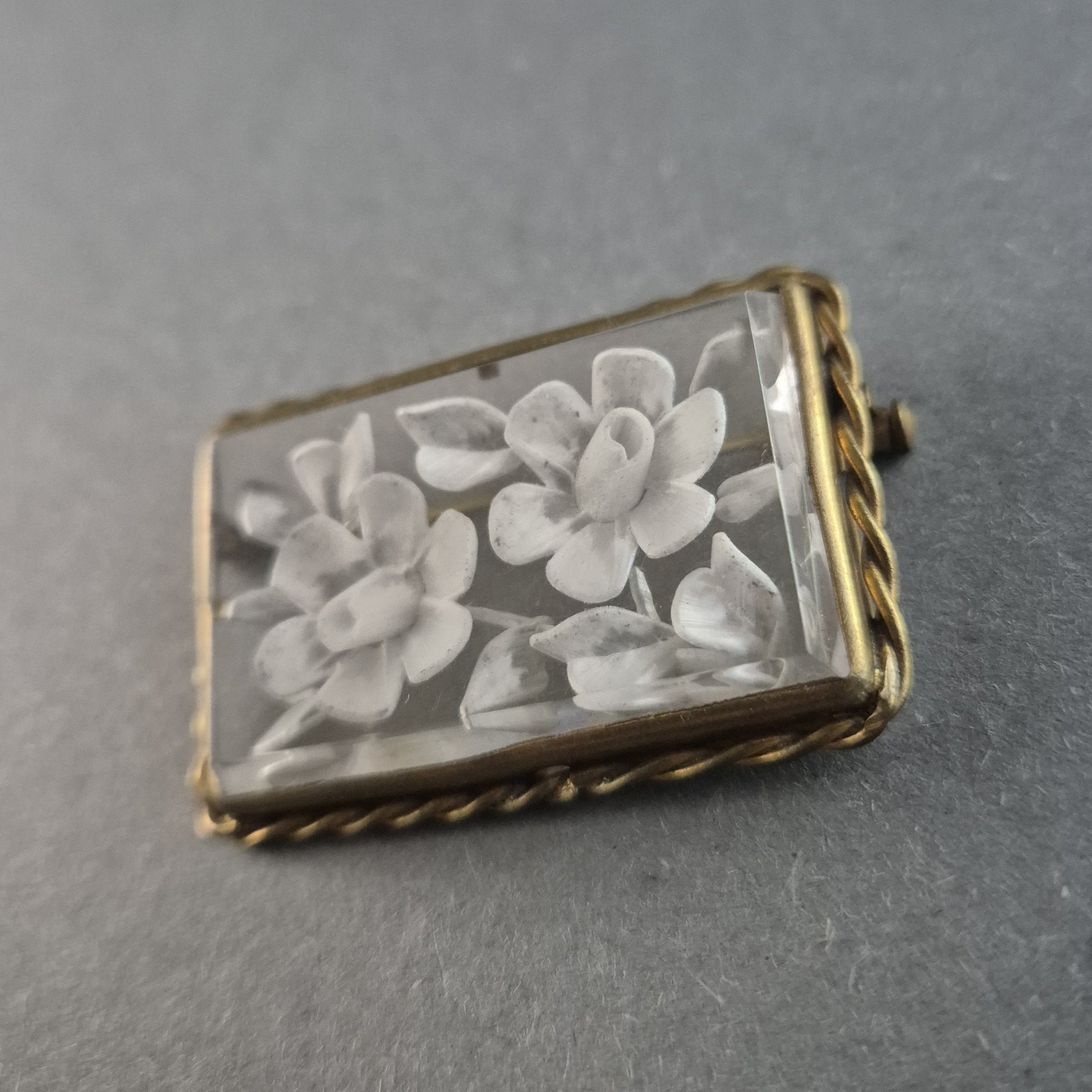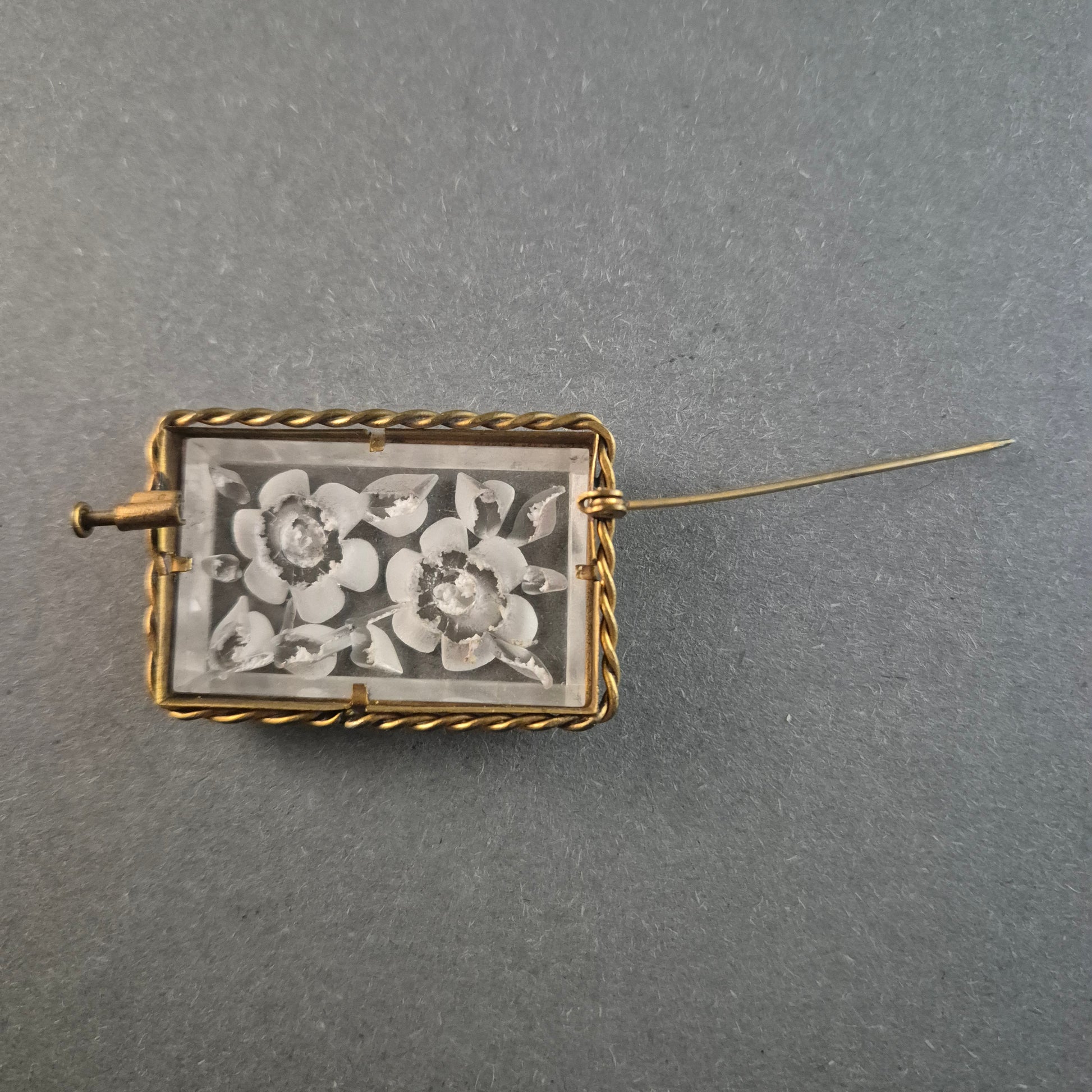 Diese elegante antike Brosche besticht durch ihre filigrane Gravur auf transparentem Material, das zwei kunstvoll eingearbeitete Blüten zeigt. Die rechteckige Form wird von einer goldfarbenen, gedrehten Metallfassung umrahmt, die der Brosche einen klassischen und zeitlosen Look verleiht. Die Anstecknadel auf der Rückseite sorgt für einen sicheren Halt an Kleidung oder Accessoires.