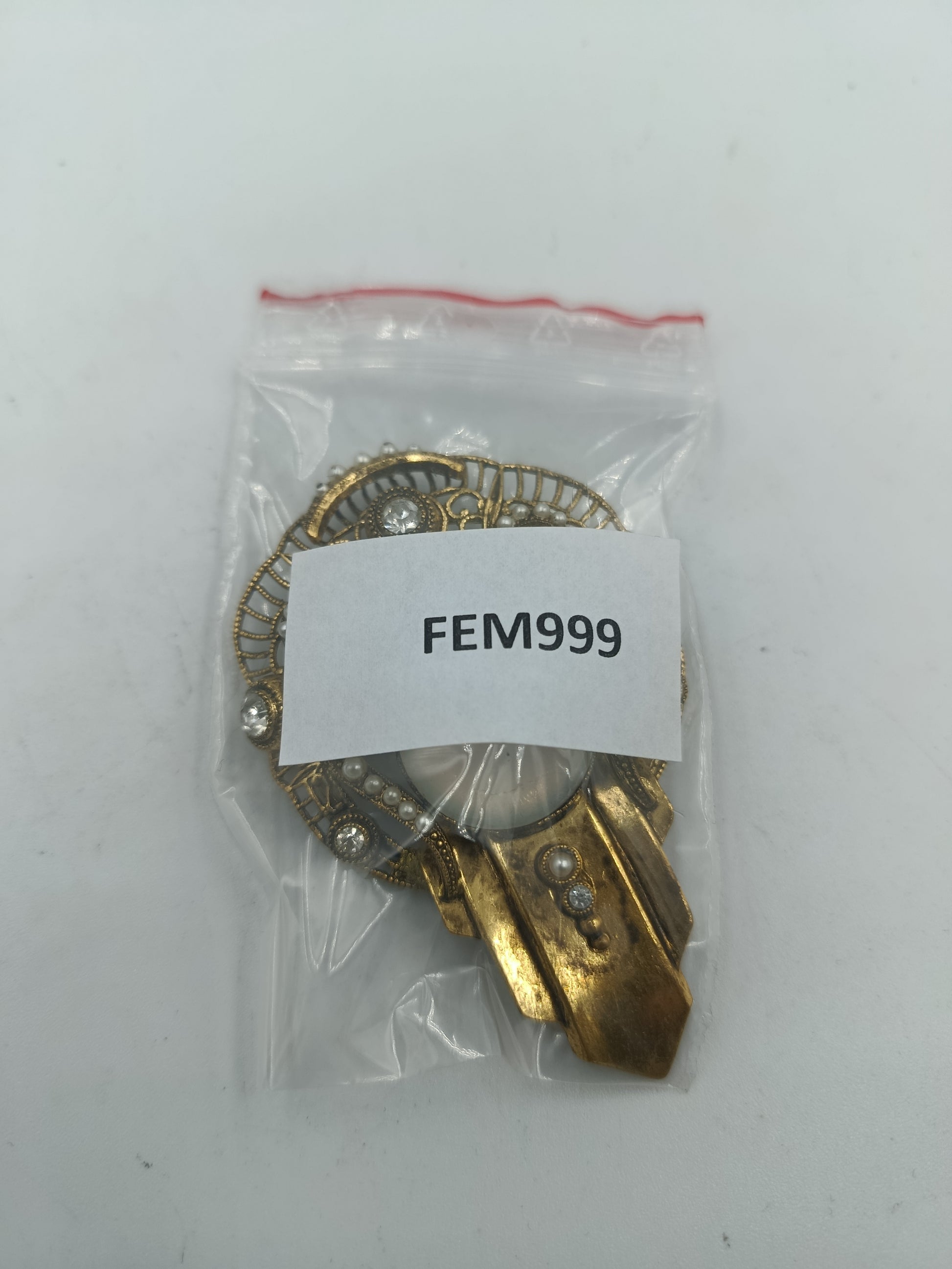 Wunderschöne antik anmutende Brosche in edler Goldoptik mit aufwendig verziertem Design, weißen Perlenakzenten und einem großen milchig schimmernden Glasstein im Zentrum. Diese Brosche besticht durch ihren nostalgischen Charme und eignet sich perfekt als elegantes Accessoire oder Sammlerstück.