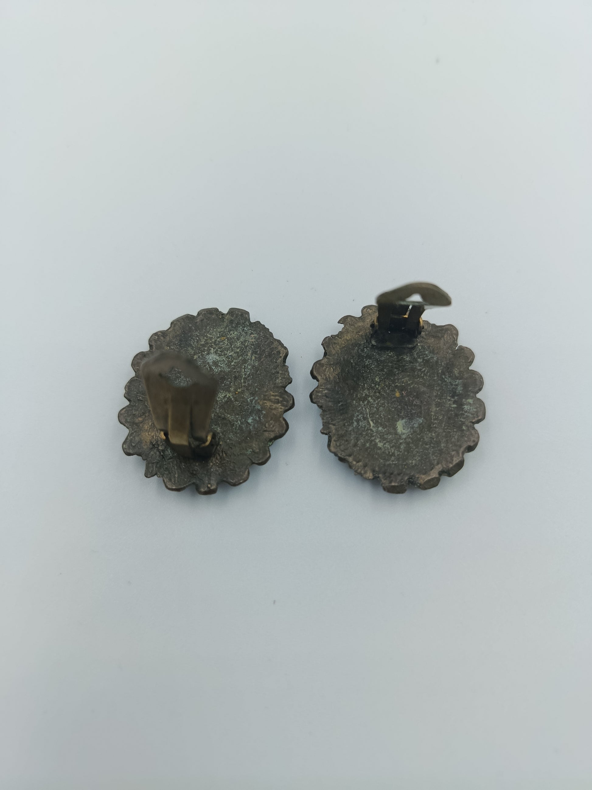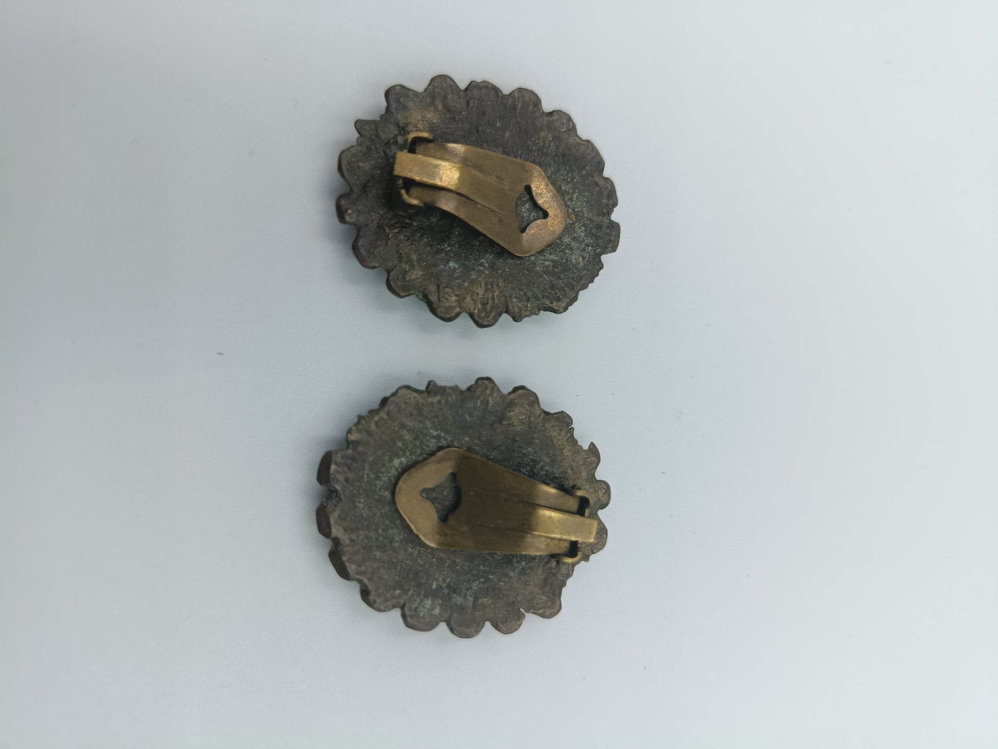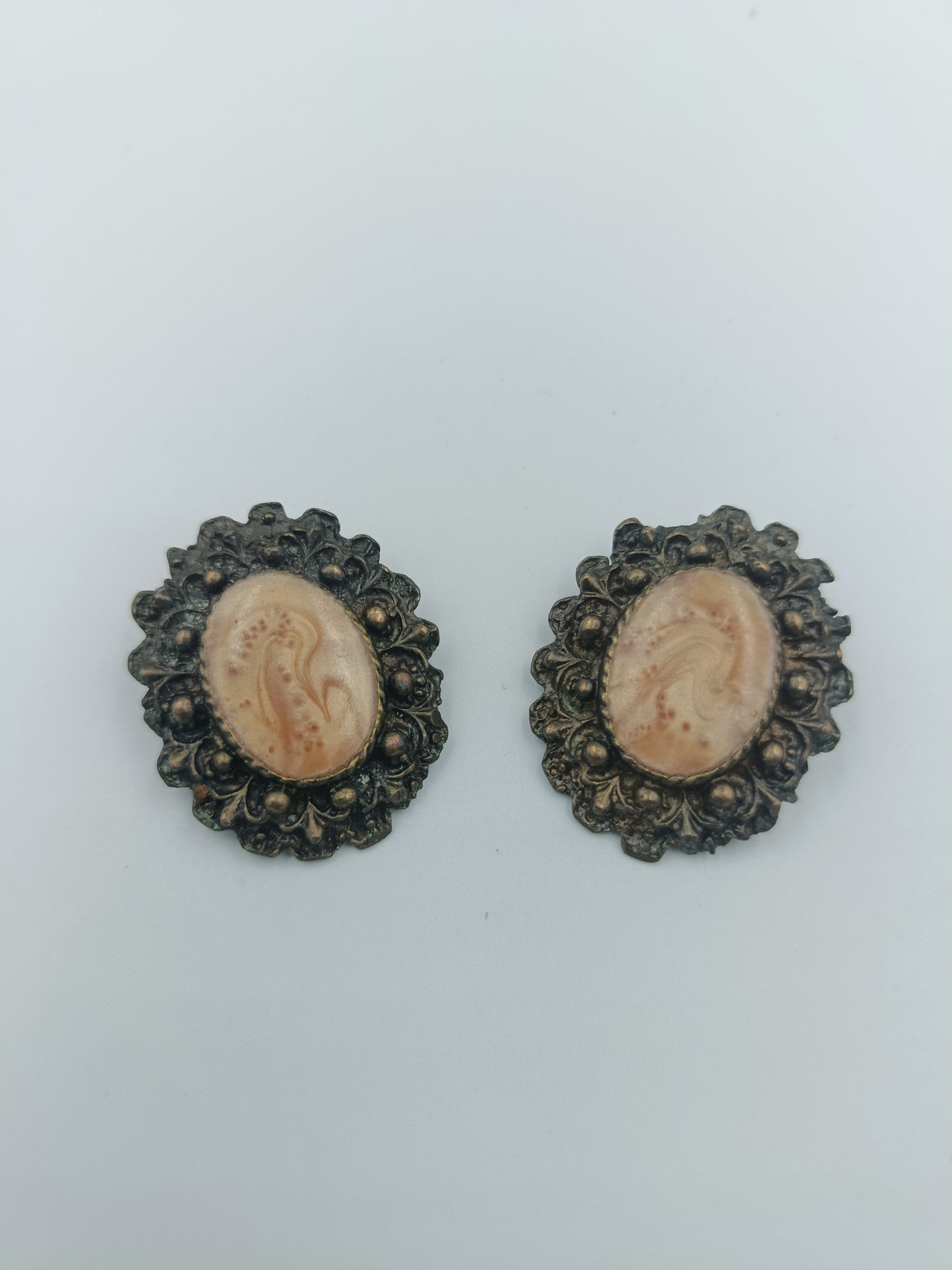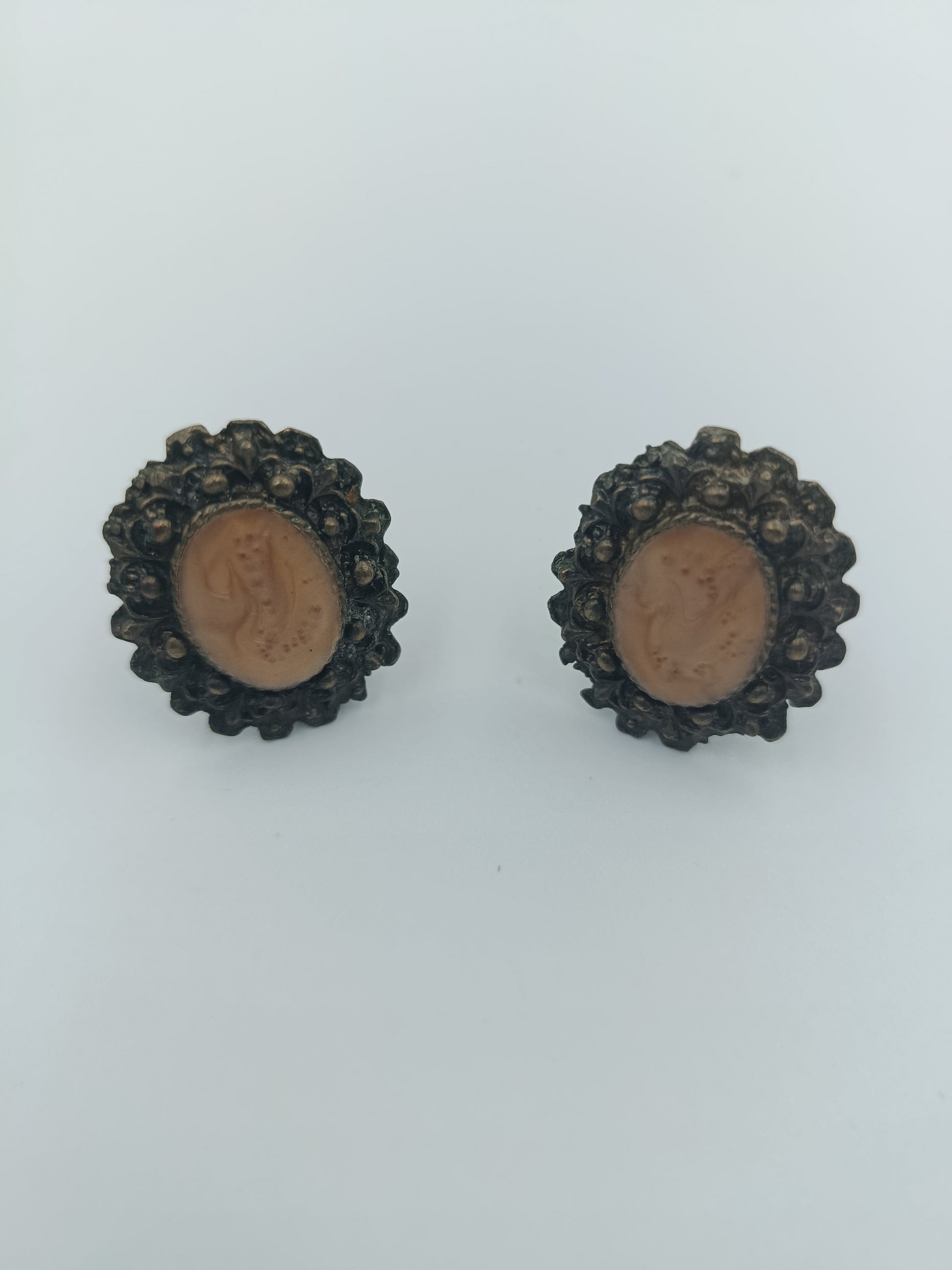 Diese charmanten antiken Clip-Ohrringe im nostalgischen Design präsentieren eine zarte ovale Kamee-Optik in warmen Beigetönen. Die bronzefarbene, florale Umrandung verleiht dem Schmuckstück einen unverwechselbaren Vintage-Charakter und macht es zu einem besonderen Blickfang für Liebhaber historischer Accessoires.
