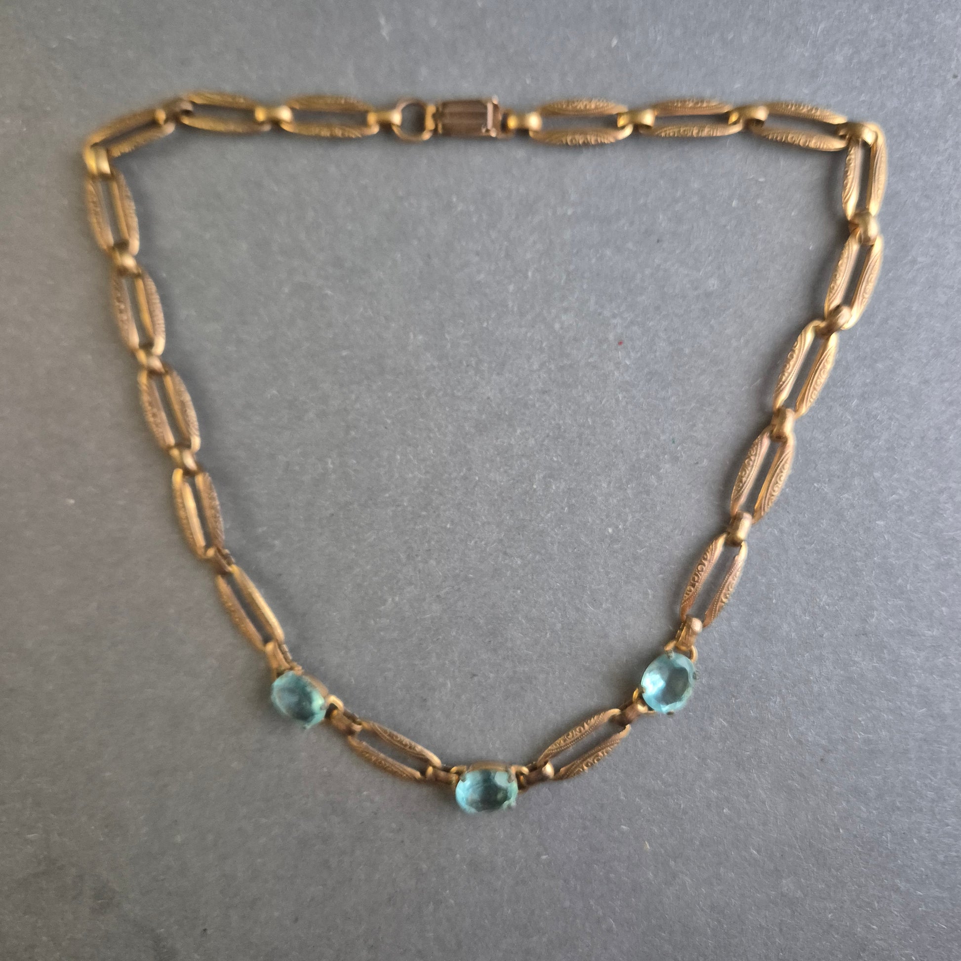 Diese wunderschöne antike Halskette besticht durch ihr filigranes Design mit kunstvoll verzierten Gliedern und funkelnden blauen Schmucksteinen. Die warm vergoldete Metallstruktur verleiht der Kette eine edle Vintage-Ästhetik, während die facettierten Steine einen Hauch von Eleganz und Farbe hinzufügen. Ein perfektes Schmuckstück für Liebhaber antiker Eleganz und Sammler hochwertiger Vintage-Stücke.