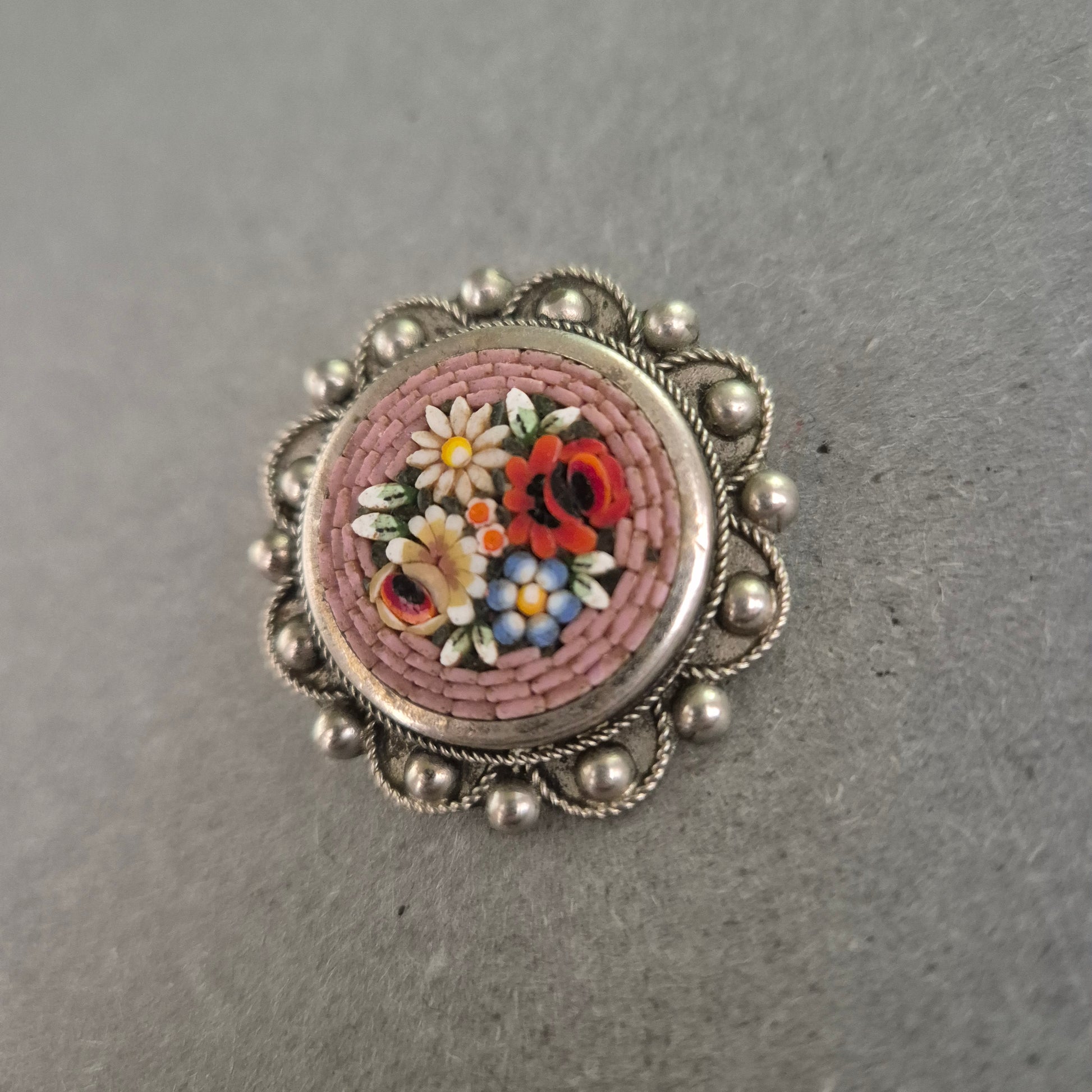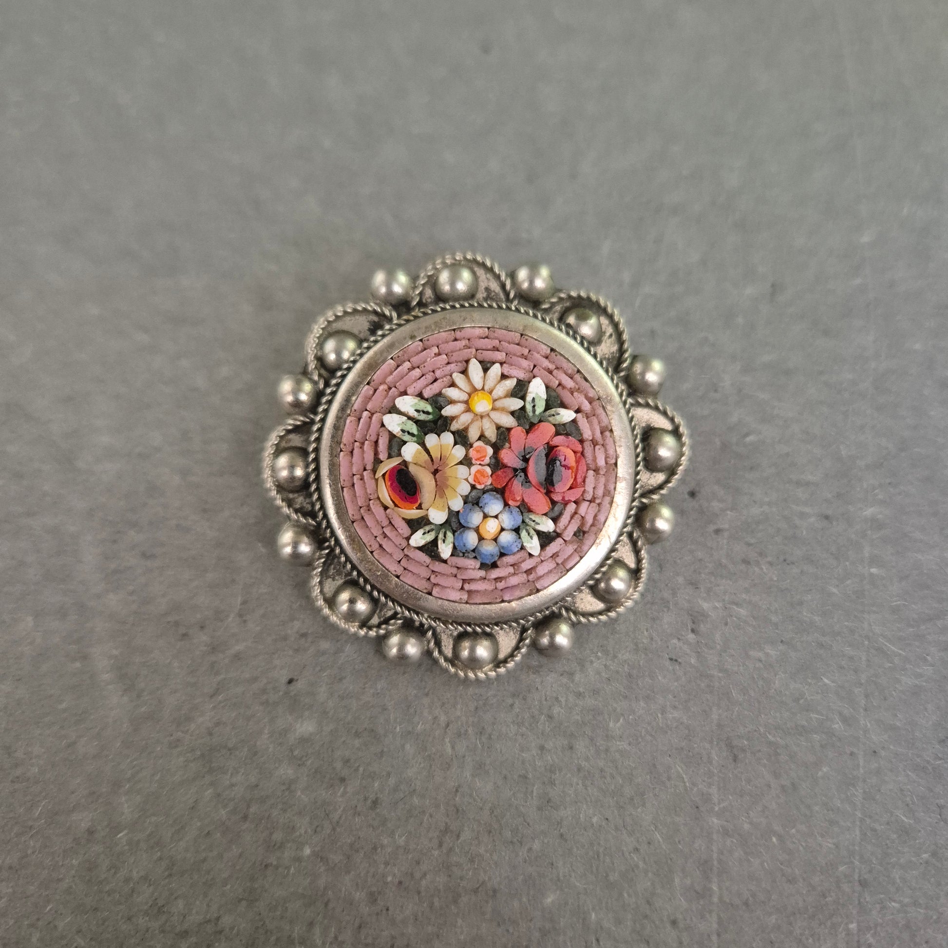 Antike italienische Micro-Mosaik-Brosche – Florales Kunsthandwerk aus Silber