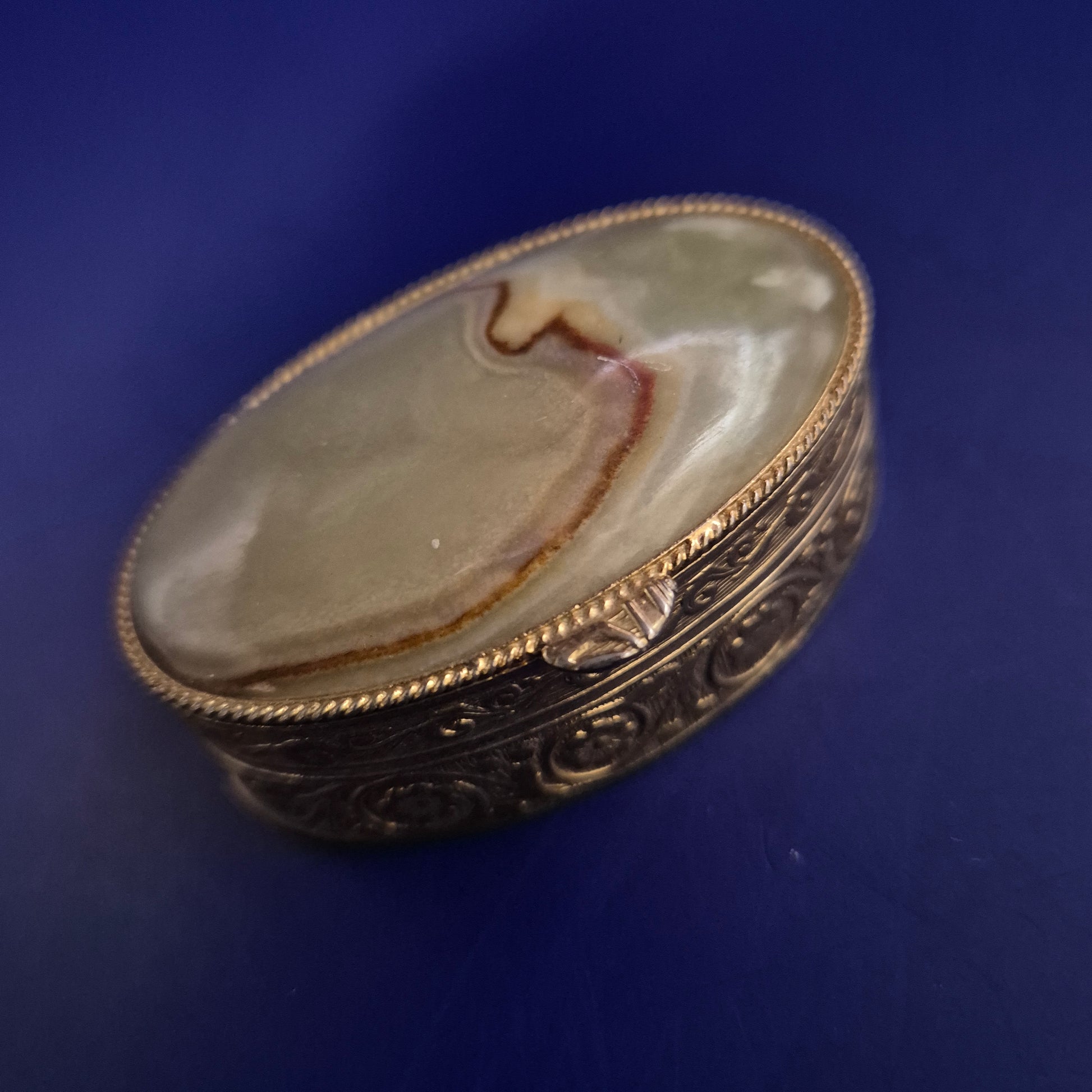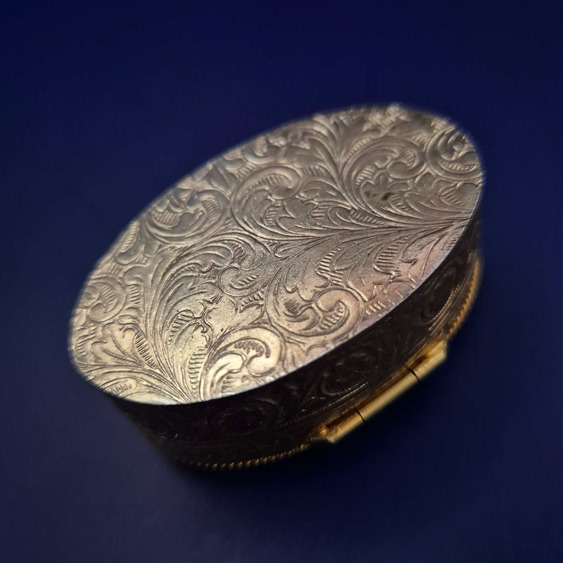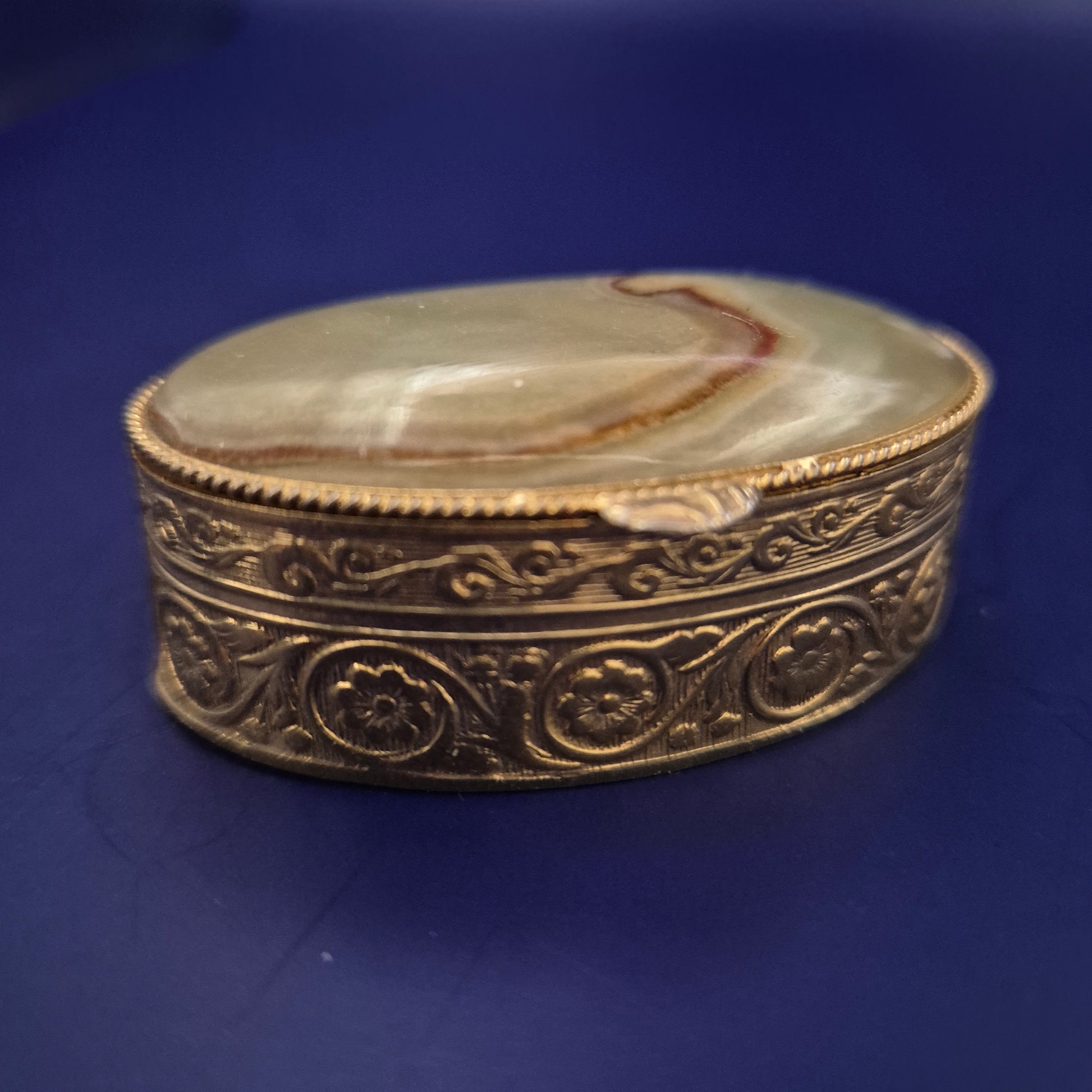 Diese ovale, antike Schmuck- oder Pillendose vereint kunstvolles Handwerk mit natürlicher Eleganz. Der Deckel ist mit einem polierten Naturstein besetzt, dessen einzigartiges Muster die Einmaligkeit des Stücks unterstreicht. Der Korpus besteht aus reich verziertem Messing mit floralen Gravuren, die der Dose einen nostalgischen, hochwertigen Charakter verleihen – perfekt als Schmuckaufbewahrung oder dekoratives Sammlerstück.