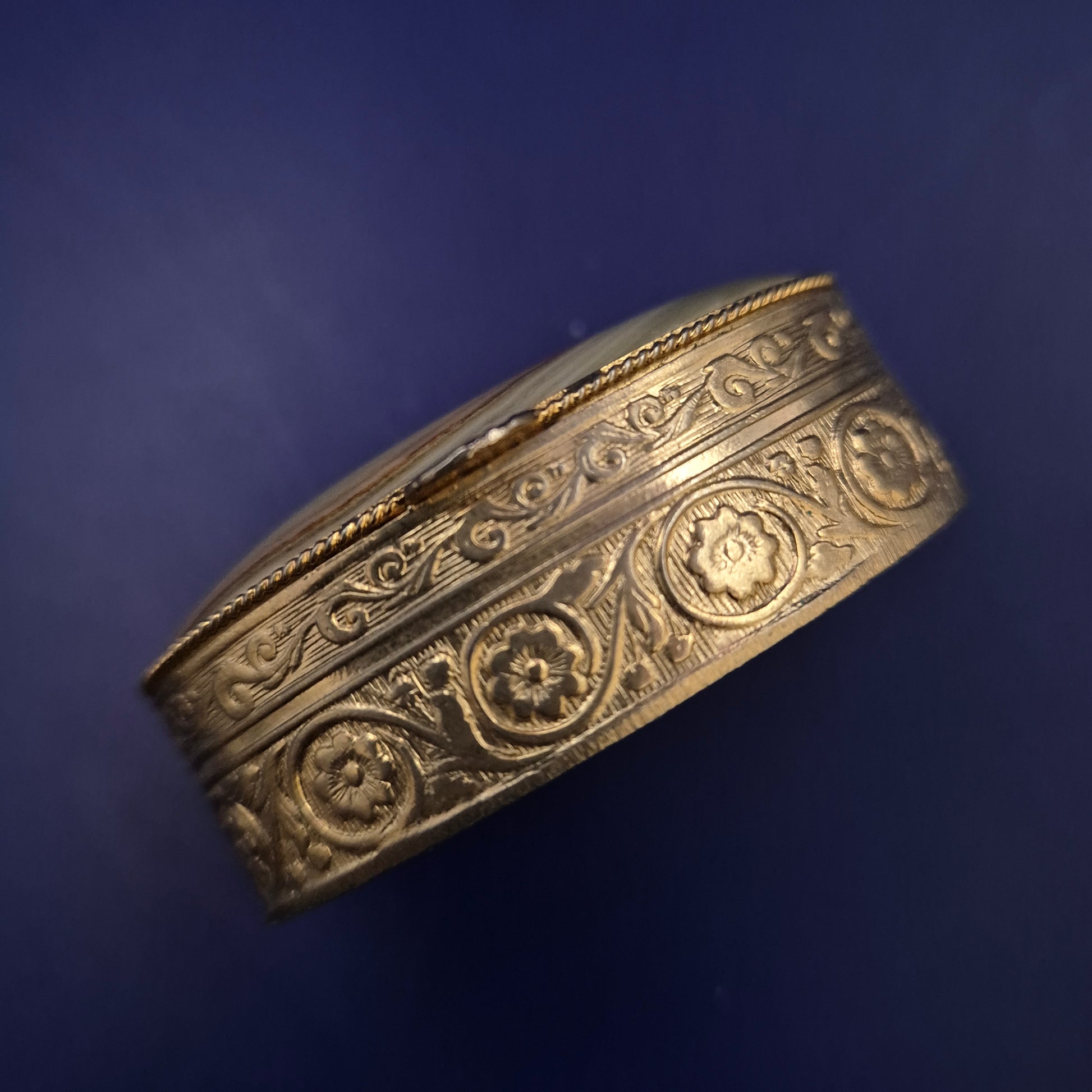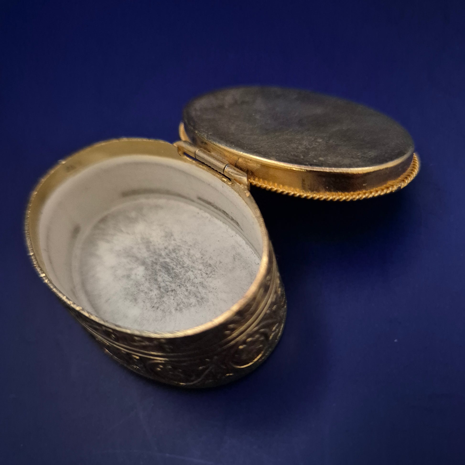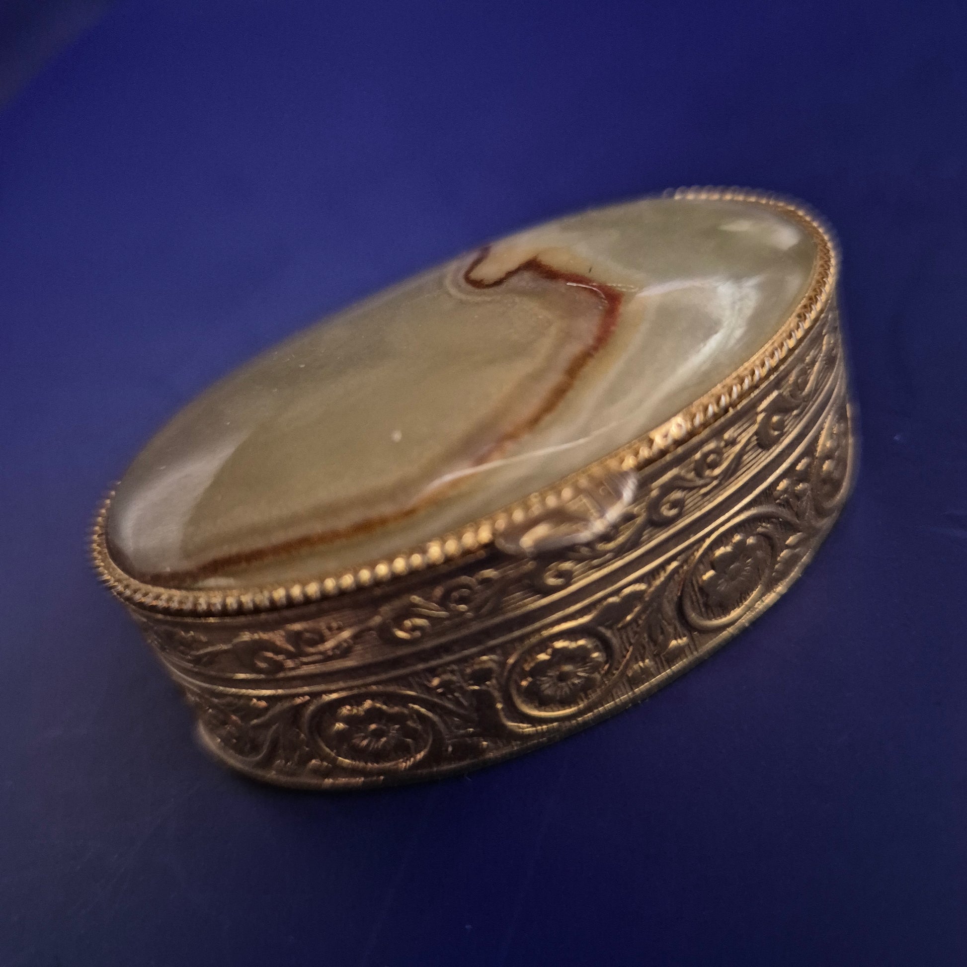 Diese ovale, antike Schmuck- oder Pillendose vereint kunstvolles Handwerk mit natürlicher Eleganz. Der Deckel ist mit einem polierten Naturstein besetzt, dessen einzigartiges Muster die Einmaligkeit des Stücks unterstreicht. Der Korpus besteht aus reich verziertem Messing mit floralen Gravuren, die der Dose einen nostalgischen, hochwertigen Charakter verleihen – perfekt als Schmuckaufbewahrung oder dekoratives Sammlerstück.