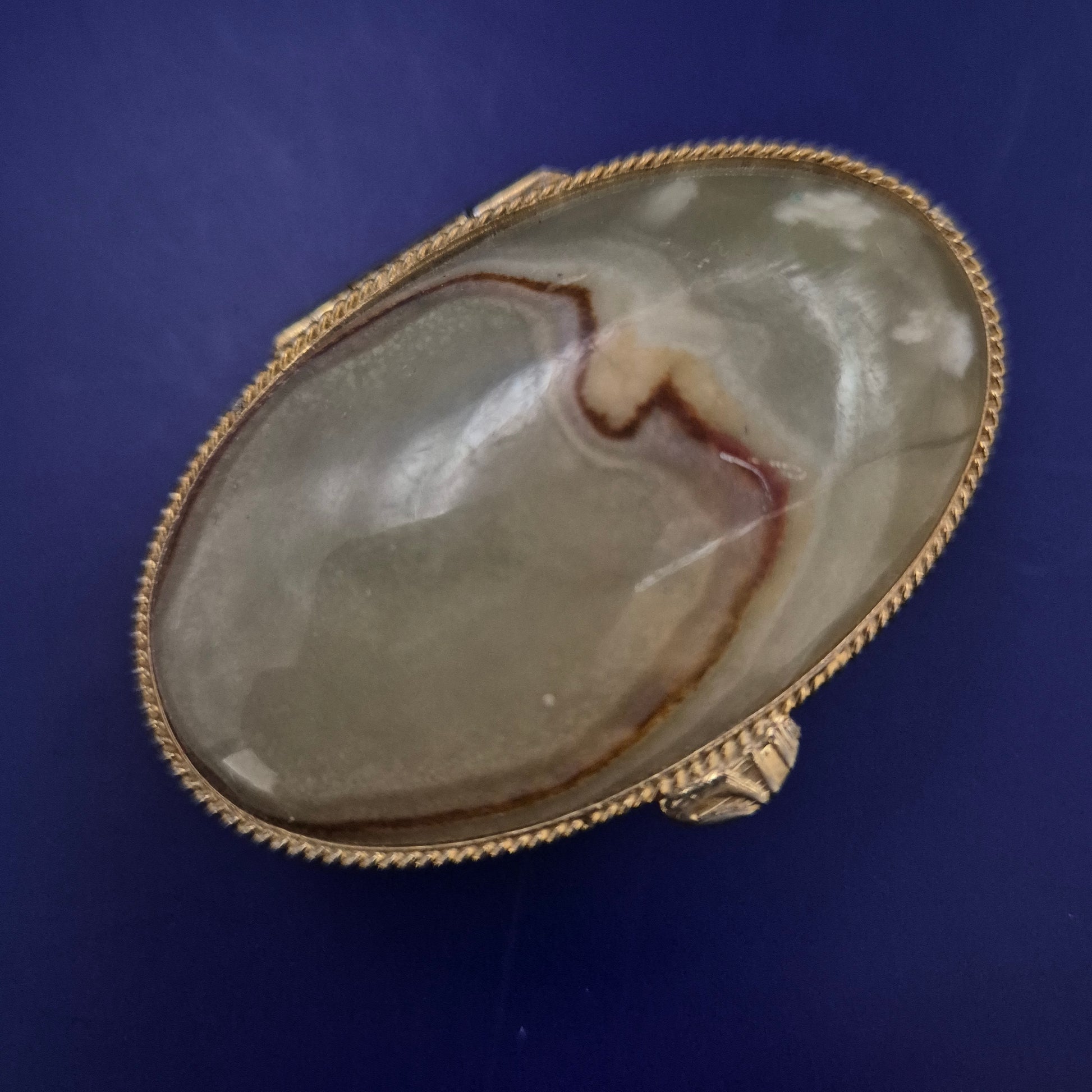 Material: Messing, polierter Naturstein (vermutlich Achat oder Jaspis)