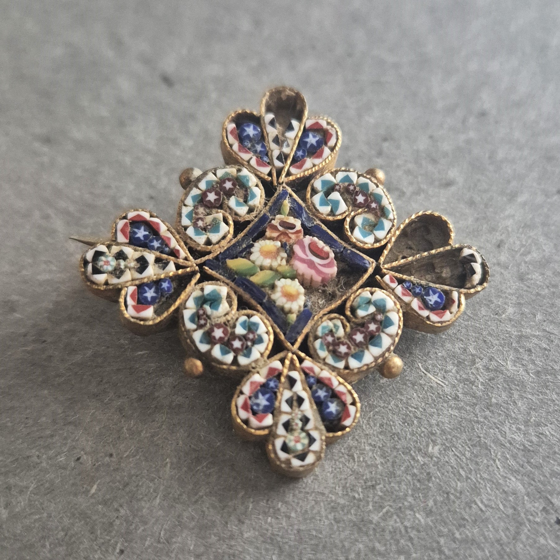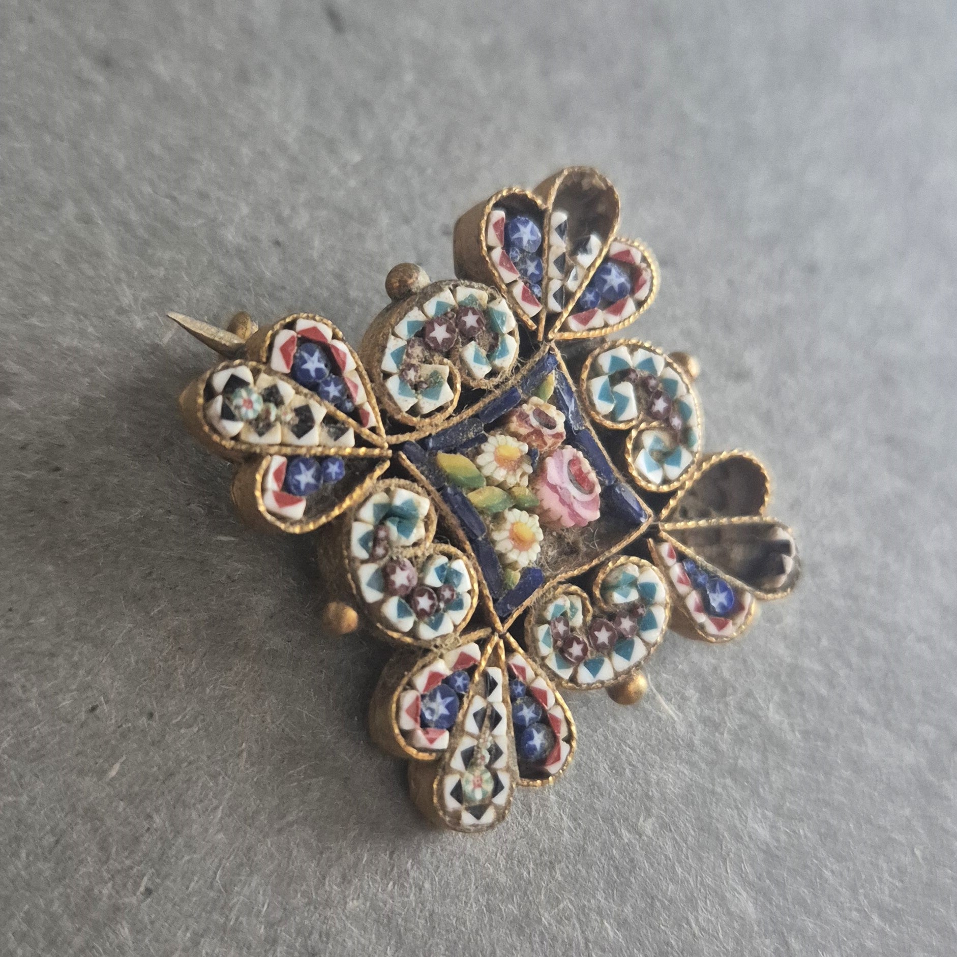 Diese filigrane antike Brosche ist ein prachtvolles Beispiel italienischer Handwerkskunst im Micro-Mosaik-Stil. Aufwendig gesetzte, winzige Glaselemente bilden ein florales Motiv in der Mitte, umgeben von herzförmigen Ornamenten in kräftigen Farben. Die Fassung aus vergoldetem Metall verleiht dem Stück einen edlen Rahmen. Dieses Schmuckstück ist nicht nur ein modisches Accessoire, sondern auch ein begehrtes Sammlerobjekt.