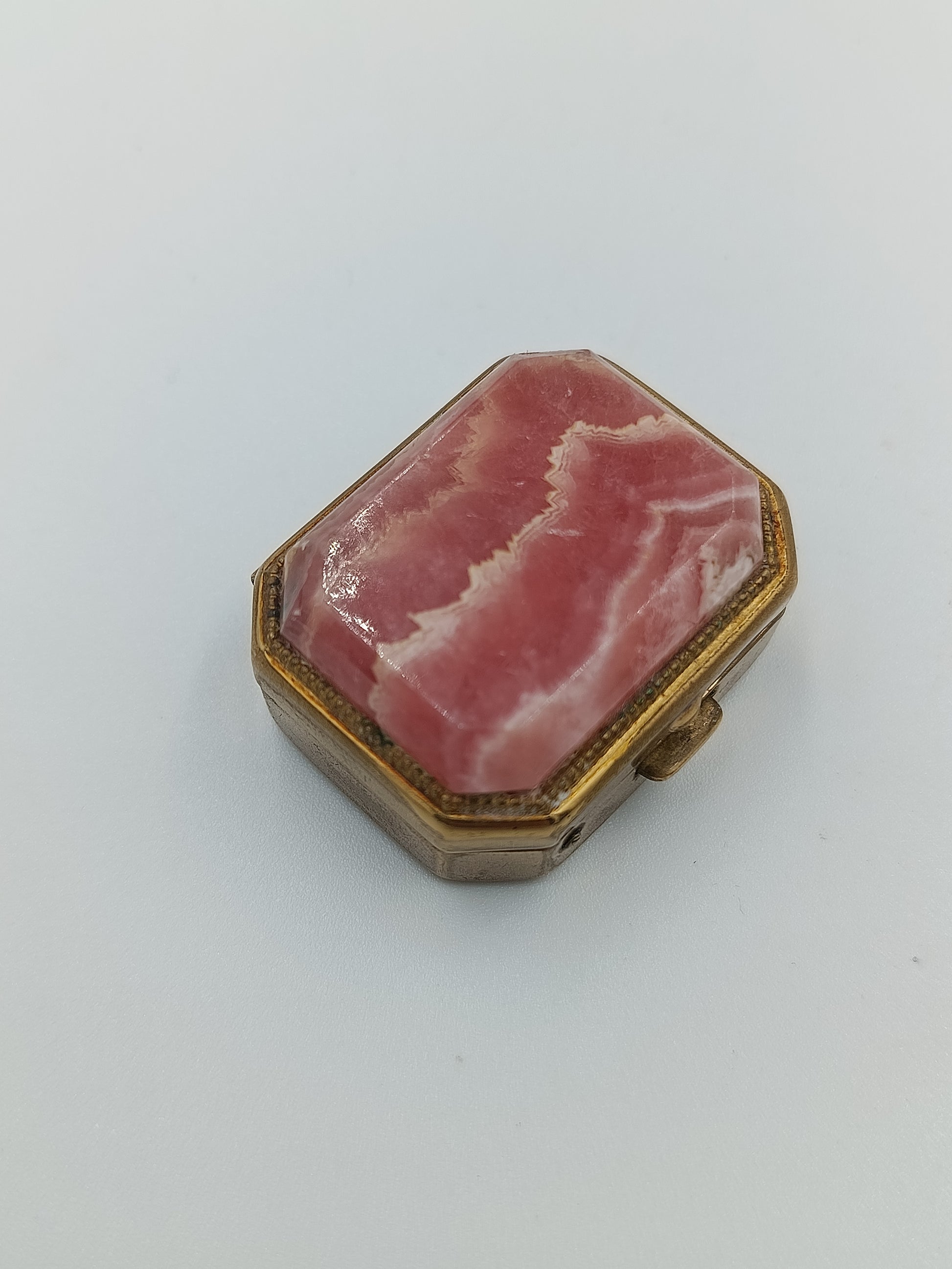 Wunderschöne kleine Pillendose mit einem facettierten Rhodochrosit-Stein als Deckel. Die achteckige Form und der goldfarbene Metallrahmen verleihen der Dose einen edlen, antiken Look. Innen ist sie mit weißer Emaille ausgekleidet. Ideal als dekoratives Sammlerstück oder als besonderes Schmuckkästchen.