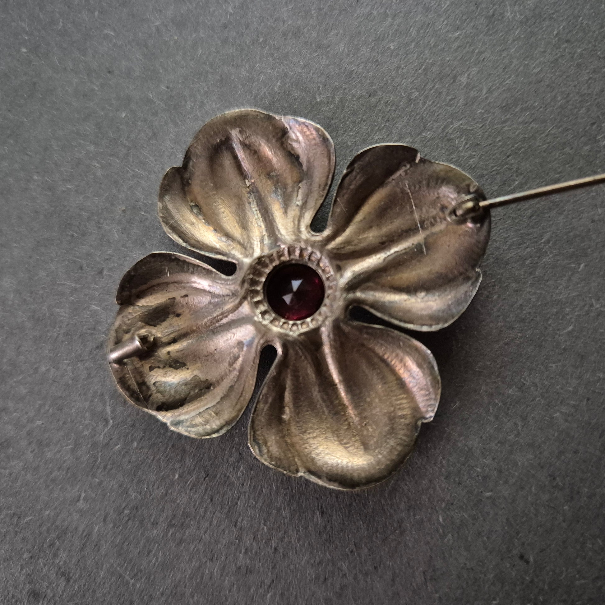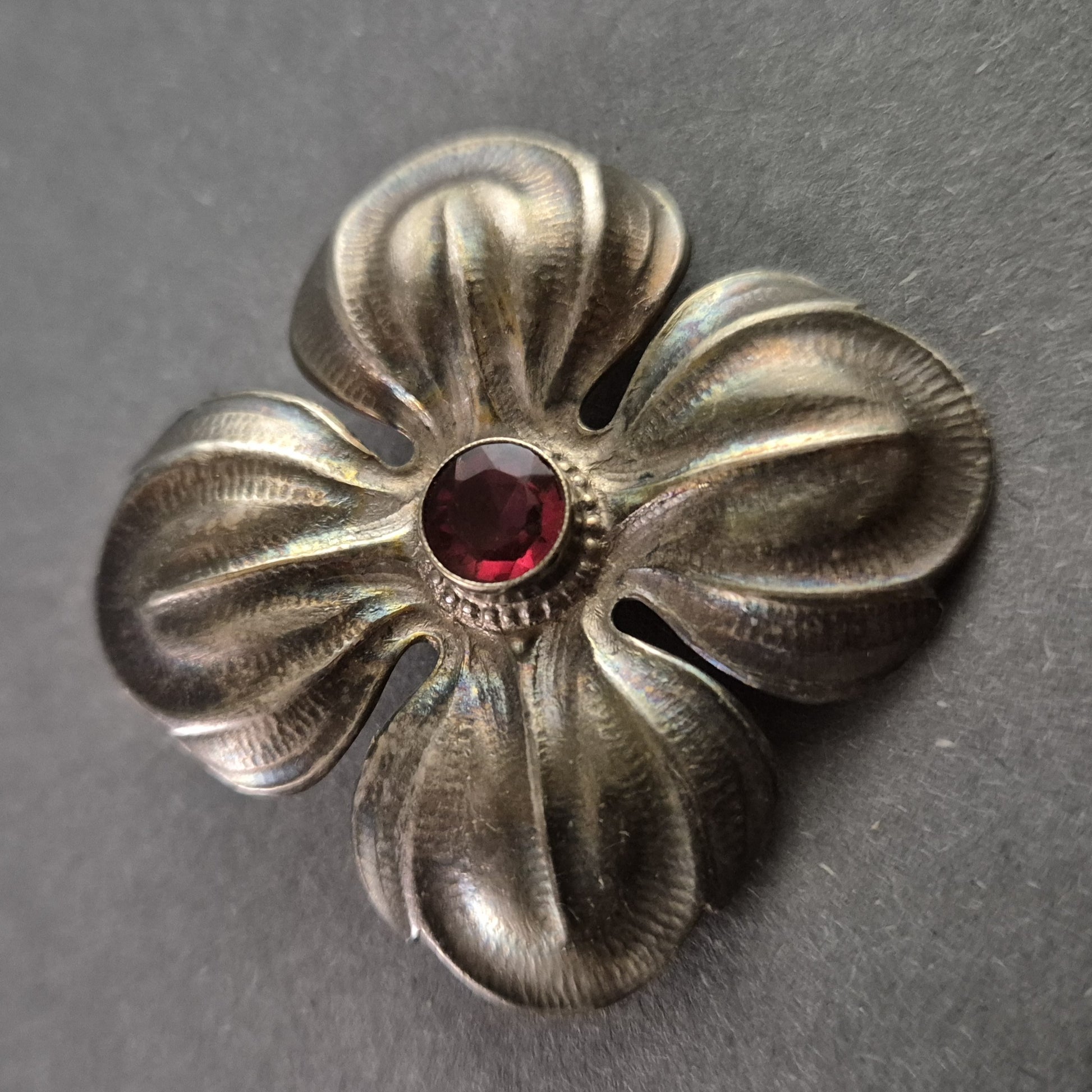 Antike Silberbrosche in Blumenform – mit rotem Schmuckstein