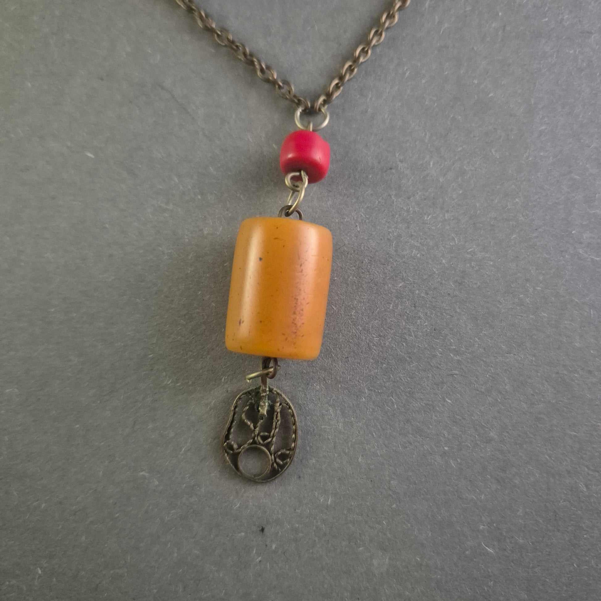 Diese elegante antike Halskette kombiniert eine feine Silberkette mit einem auffälligen Anhänger aus bernsteinfarbenen und korallenroten Perlen. Ein filigranes antikes Metallelement verleiht der Kette einen authentischen orientalischen Touch. Die harmonische Farbkombination und das handgefertigte Design machen diese Kette zu einem besonderen Schmuckstück für Liebhaber von Vintage-Schmuck und marokkanischer Handwerkskunst.