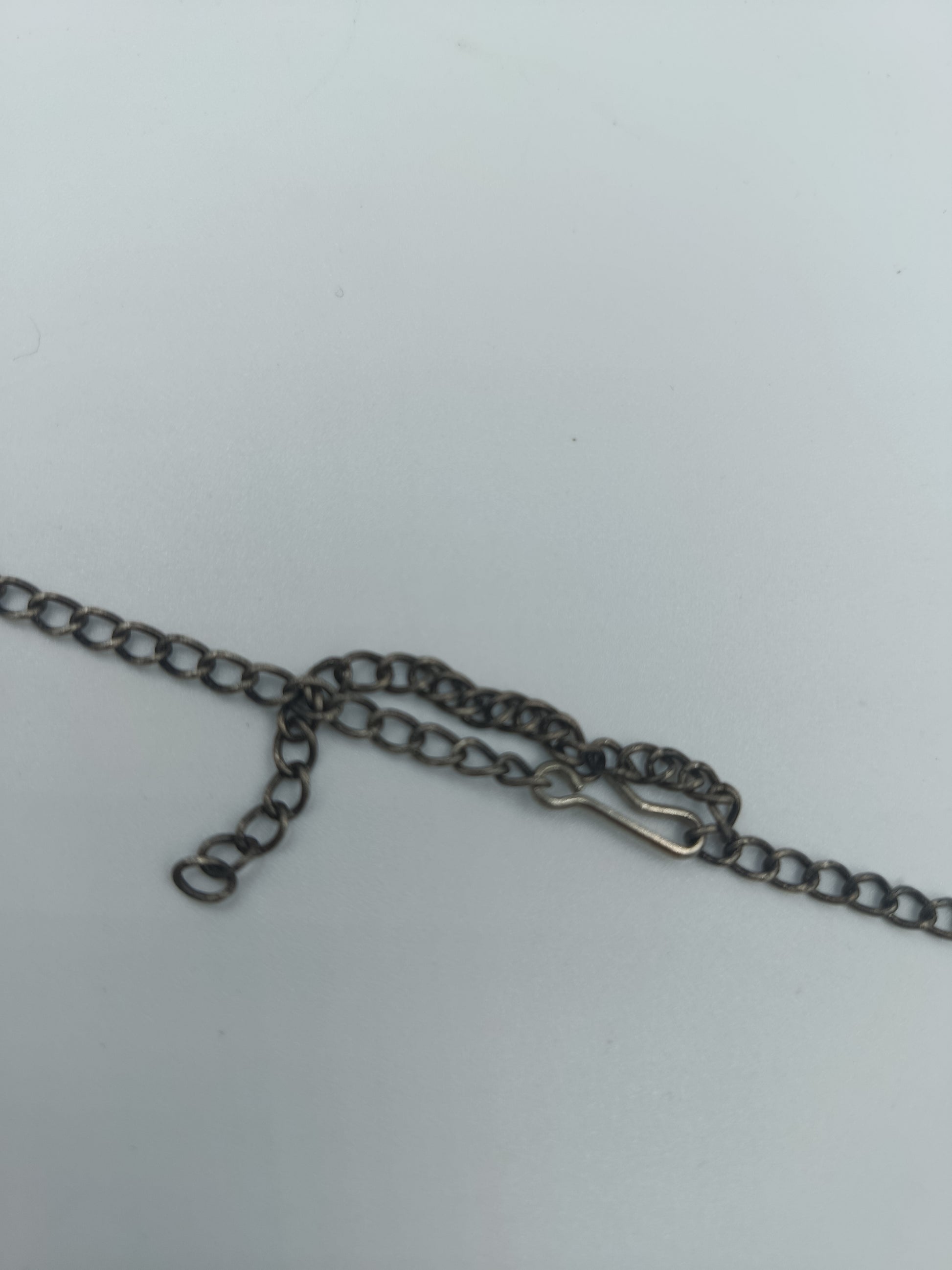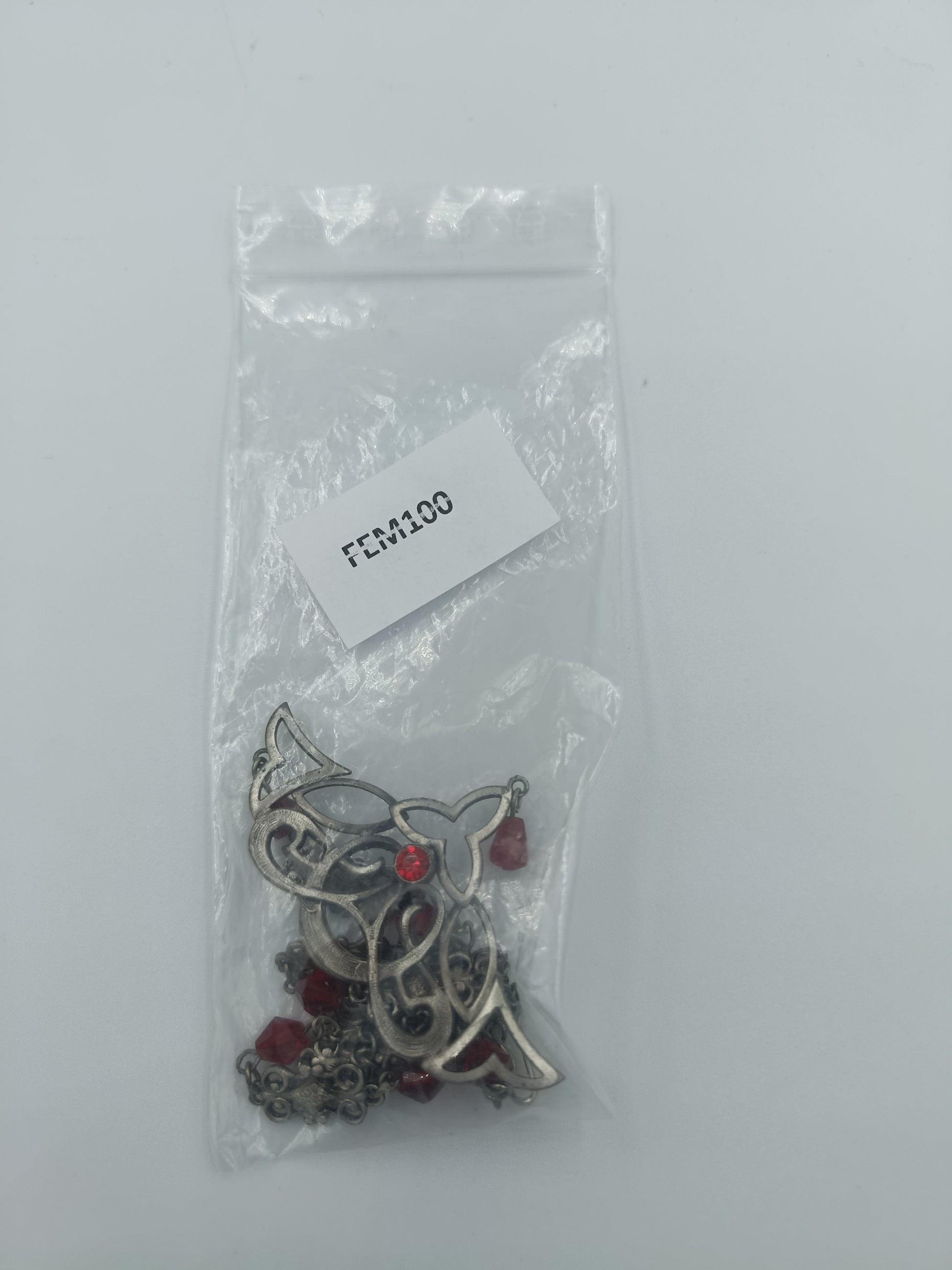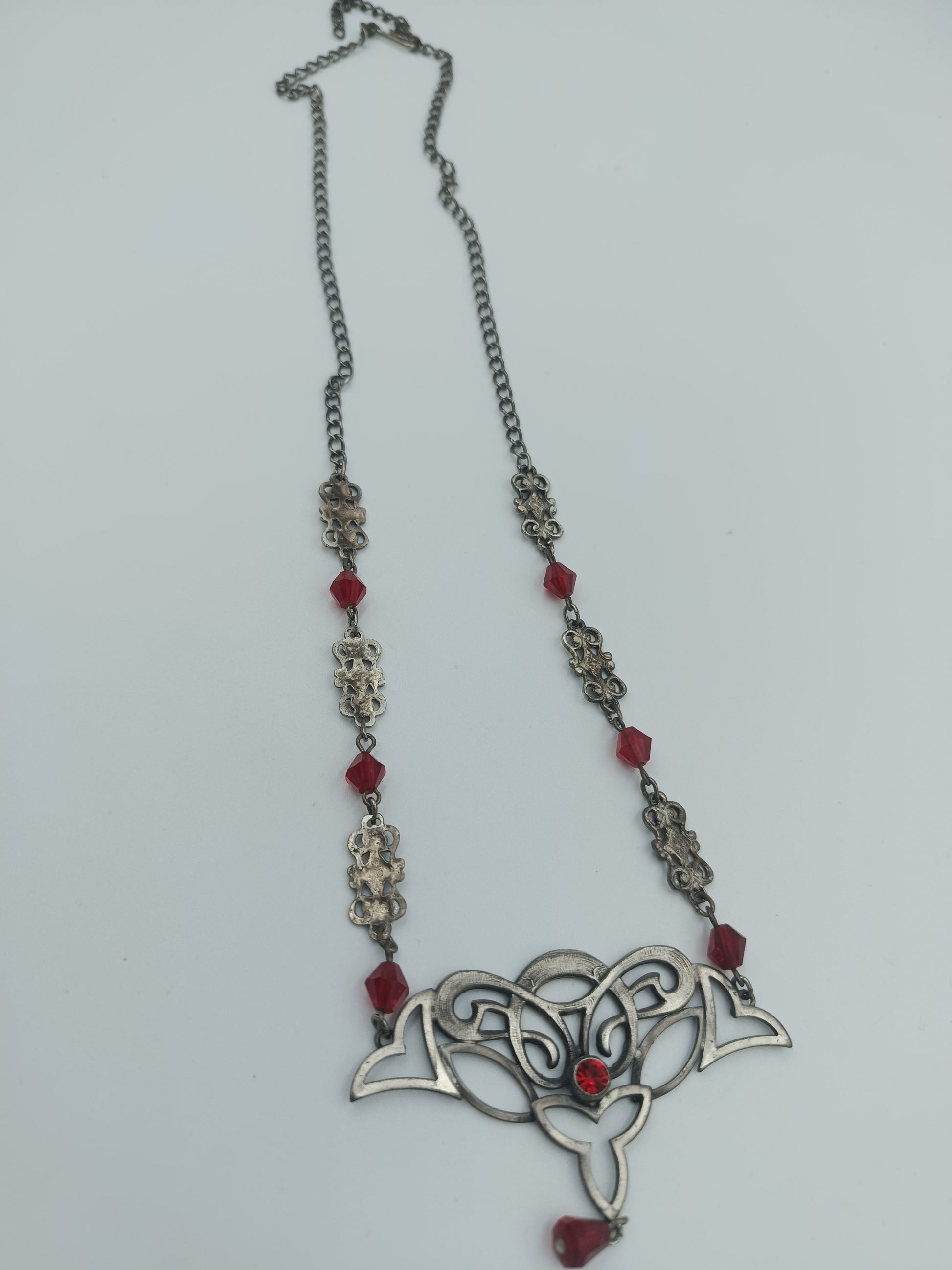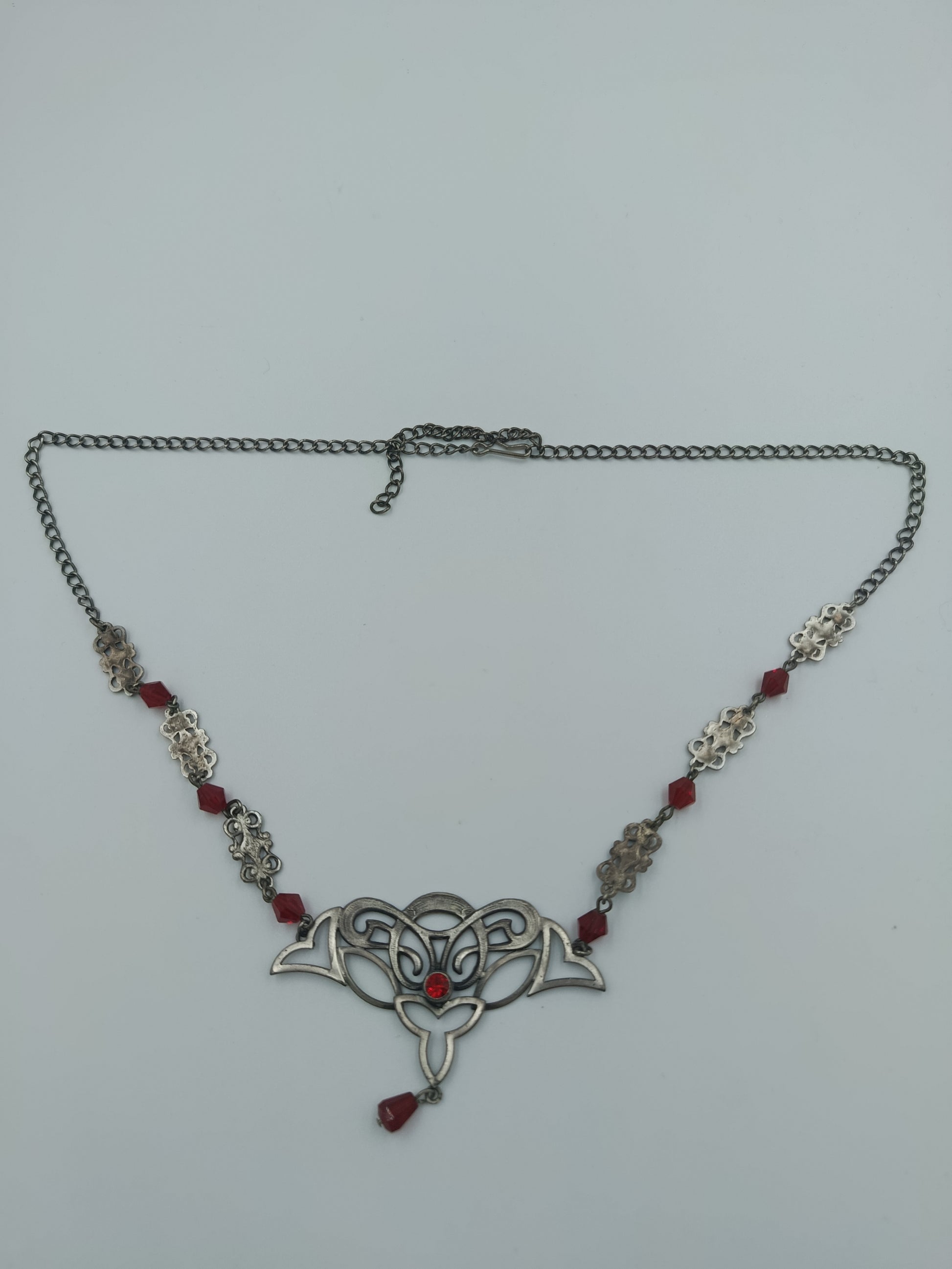 Wunderschöne, filigrane Halskette im Jugendstil-Design. Das Schmuckstück besteht aus einer zarten, patinierten Silberkette mit kunstvollen Zwischenelementen und einem auffälligen Mittelteil in geschwungener Ornamentform. Rote Glassteine setzen leuchtende Akzente und machen diese Kette zu einem echten Hingucker – perfekt für Vintage-Liebhaber.