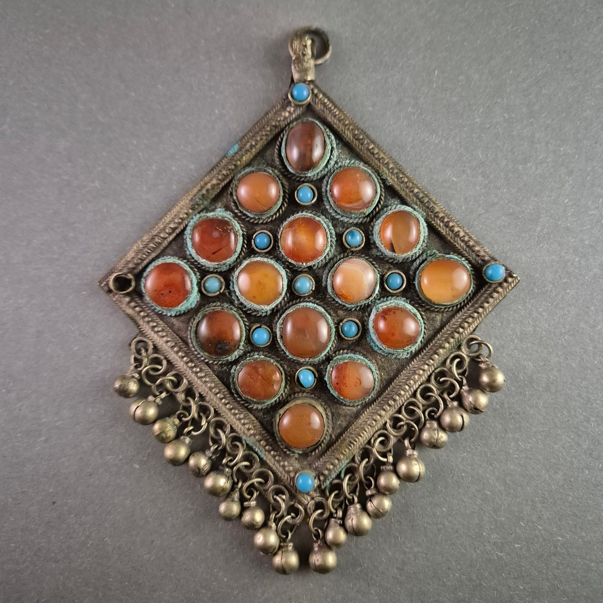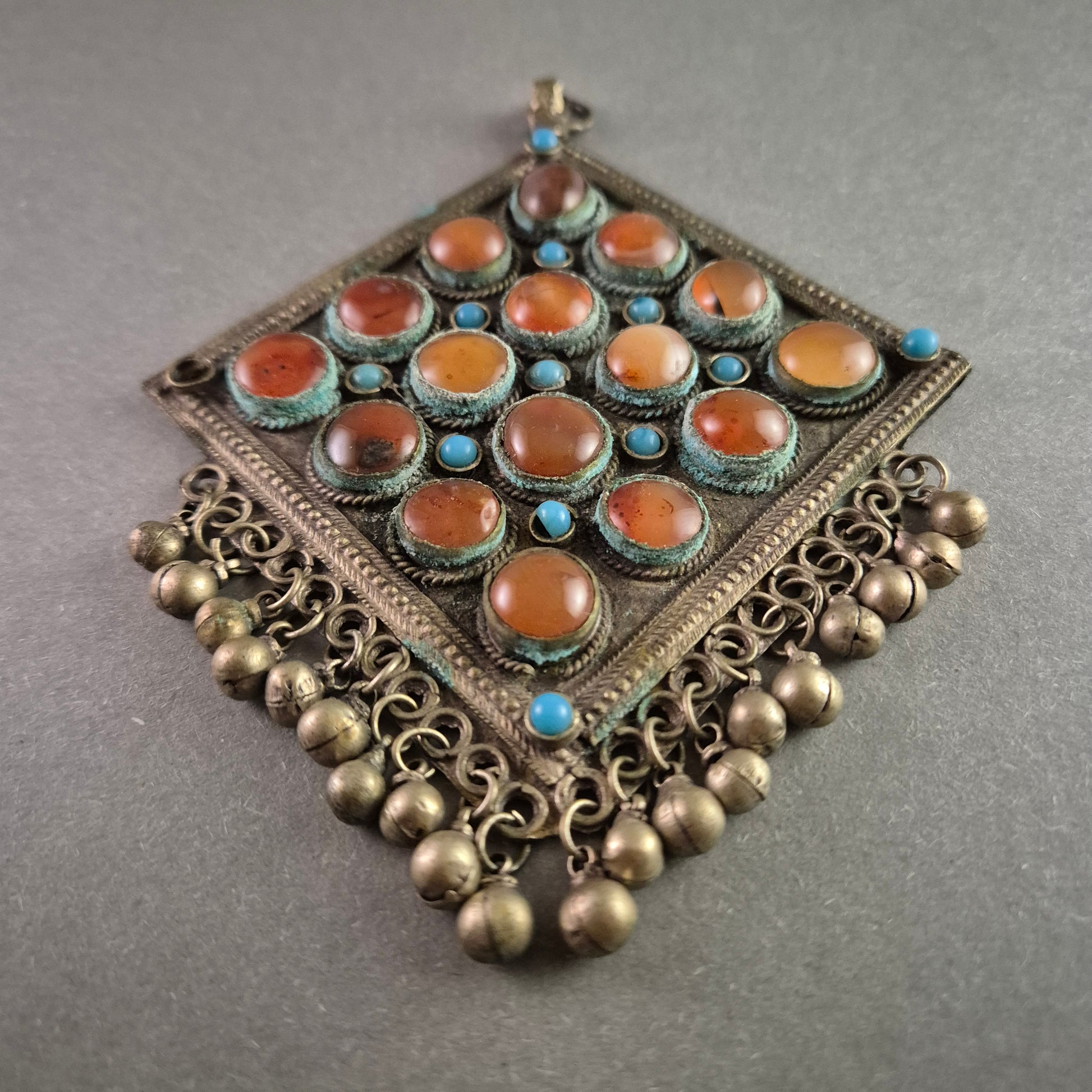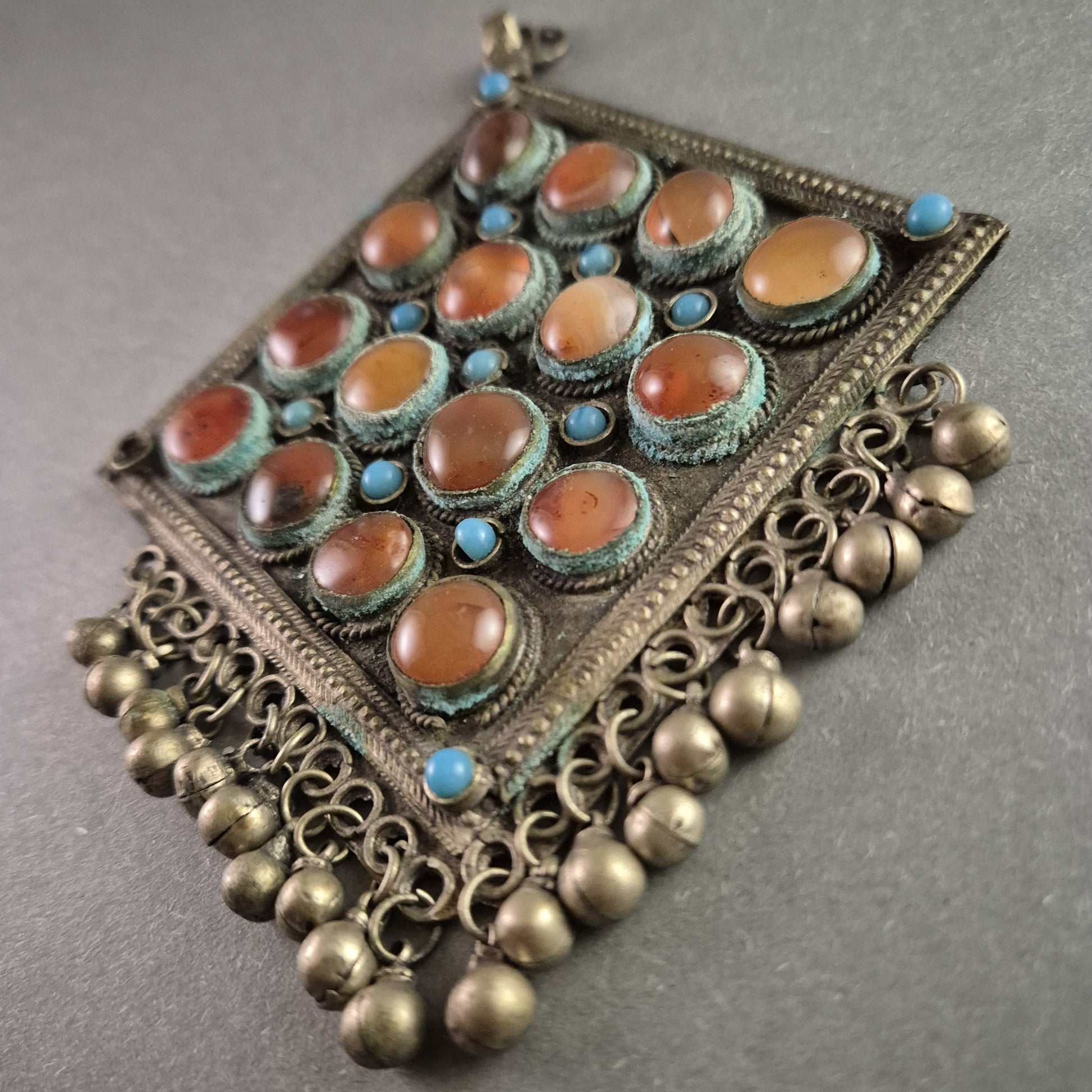 Dieser beeindruckende Berber-Anhänger stammt aus Marokko und vereint traditionelle Handwerkskunst mit prachtvollen Edelsteinverzierungen. Die quadratische Form ist mit tiefroten Karneol-Steinen und leuchtend blauen Türkisen besetzt, die durch die filigrane Metallfassung besonders hervorgehoben werden. Kleine Kettenglieder mit Glöckchen verleihen dem Schmuckstück eine authentische, nomadische Note. Die wunderschöne Patina unterstreicht seinen antiken Charakter und macht ihn zu einem einzigartigen Sammlerstück.