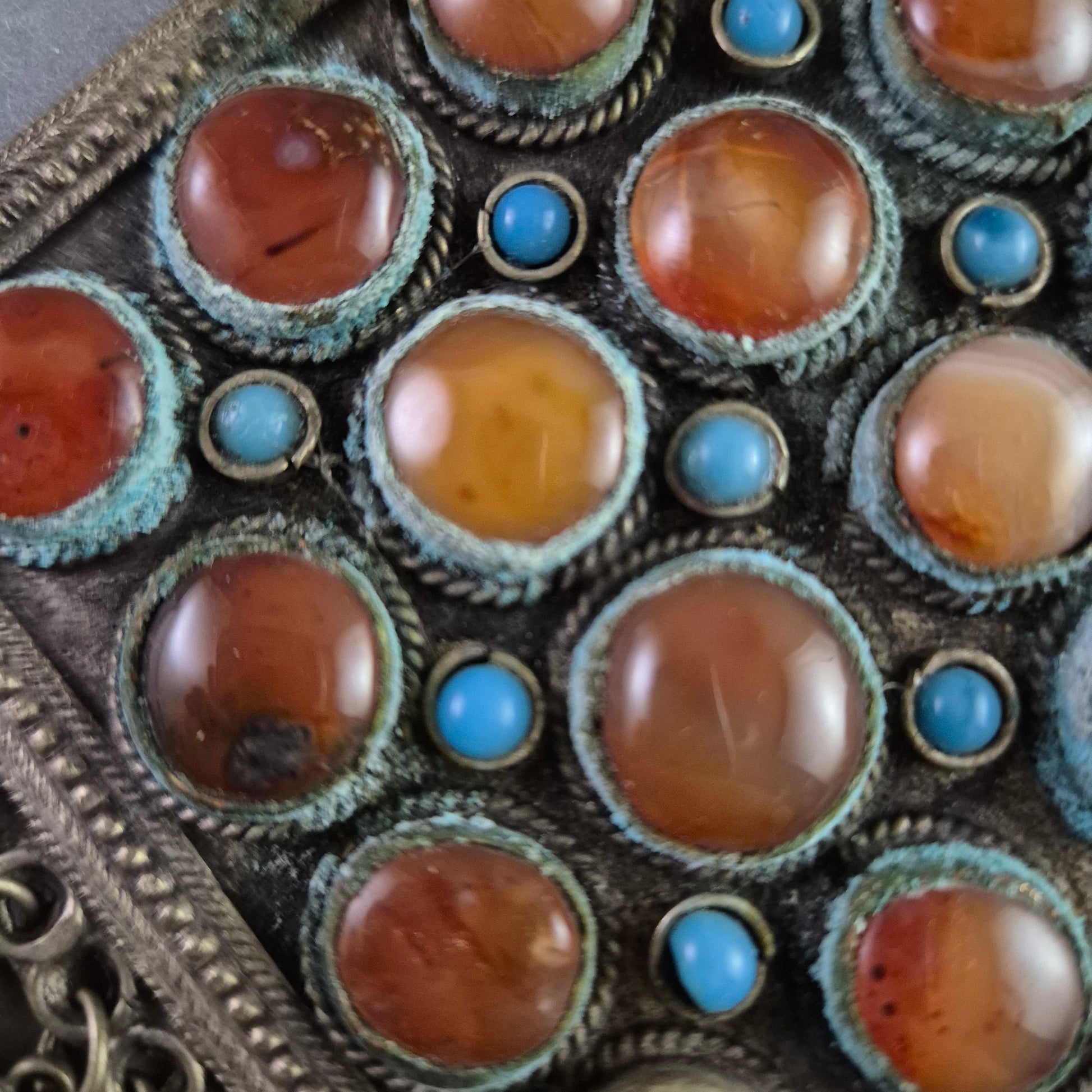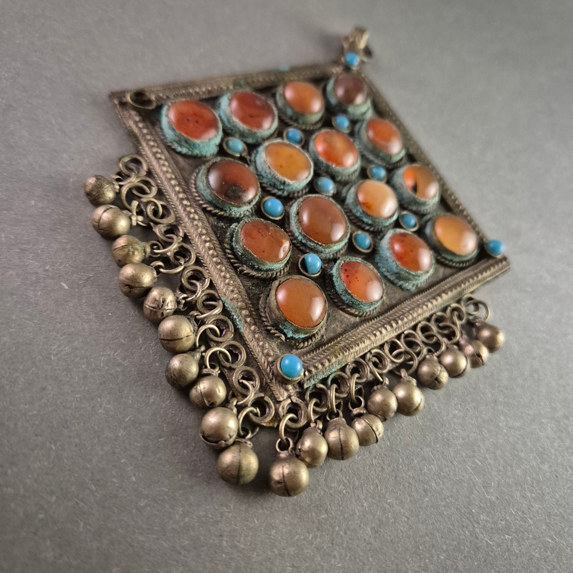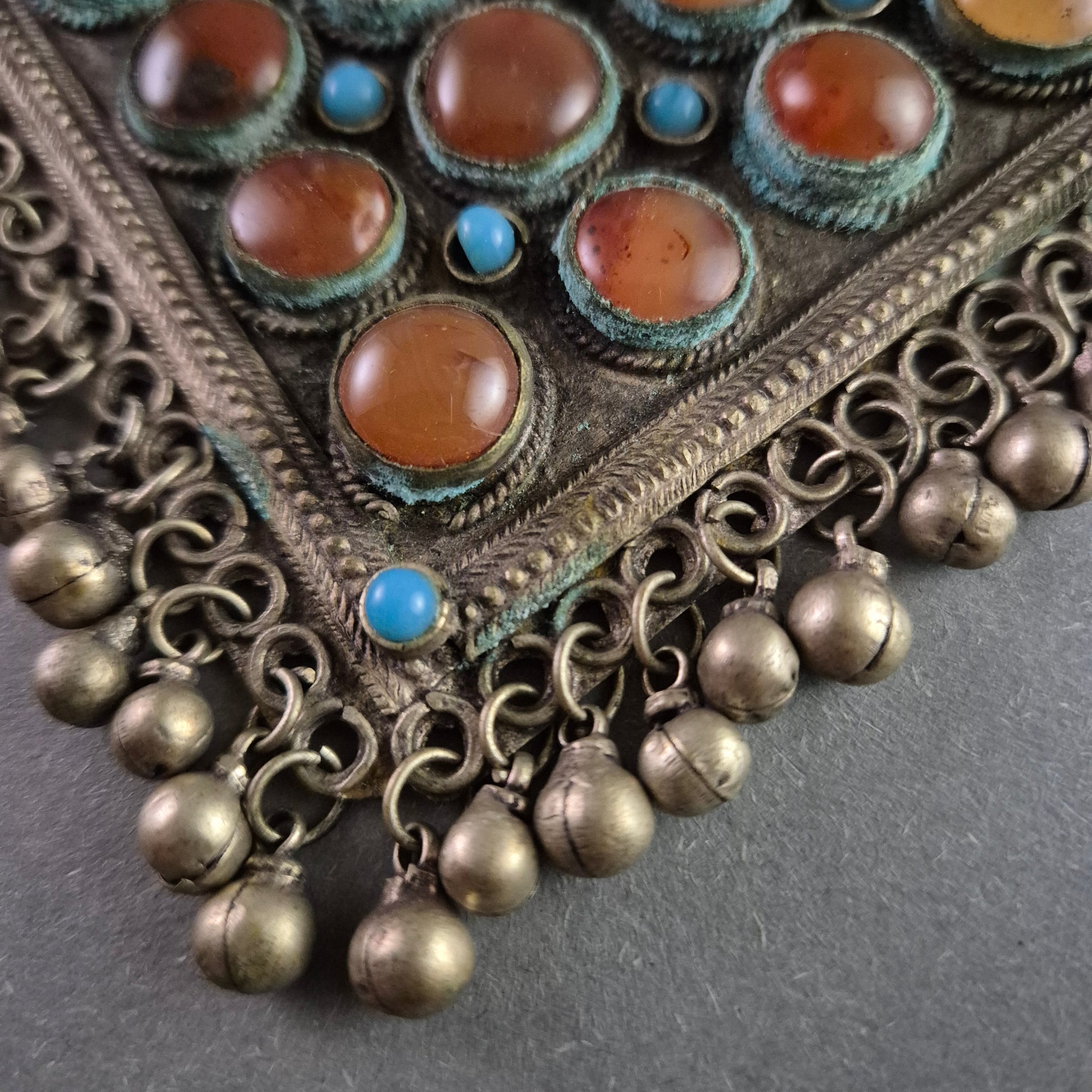 Dieser beeindruckende Berber-Anhänger stammt aus Marokko und vereint traditionelle Handwerkskunst mit prachtvollen Edelsteinverzierungen. Die quadratische Form ist mit tiefroten Karneol-Steinen und leuchtend blauen Türkisen besetzt, die durch die filigrane Metallfassung besonders hervorgehoben werden. Kleine Kettenglieder mit Glöckchen verleihen dem Schmuckstück eine authentische, nomadische Note. Die wunderschöne Patina unterstreicht seinen antiken Charakter und macht ihn zu einem einzigartigen Sammlerstück.