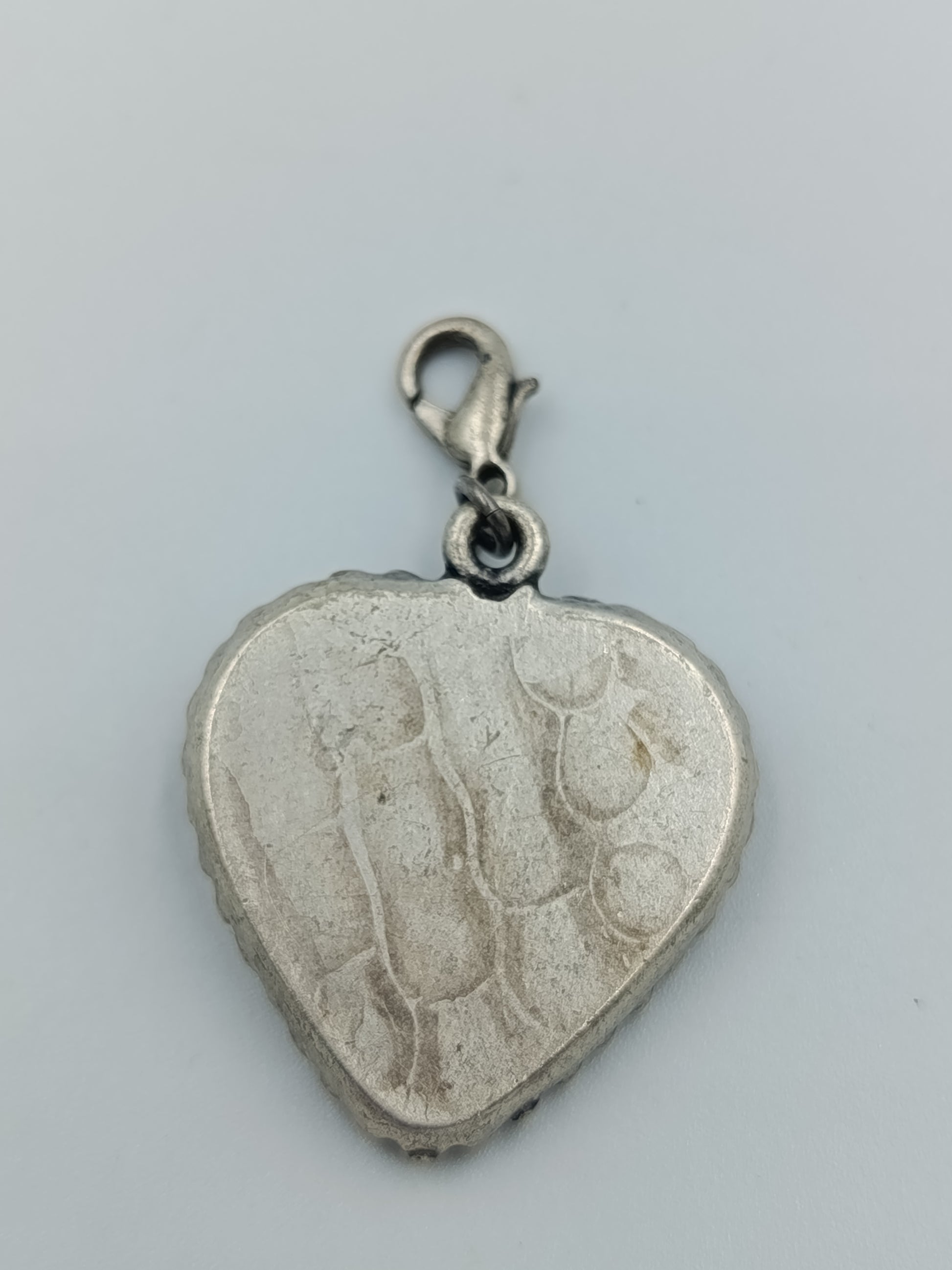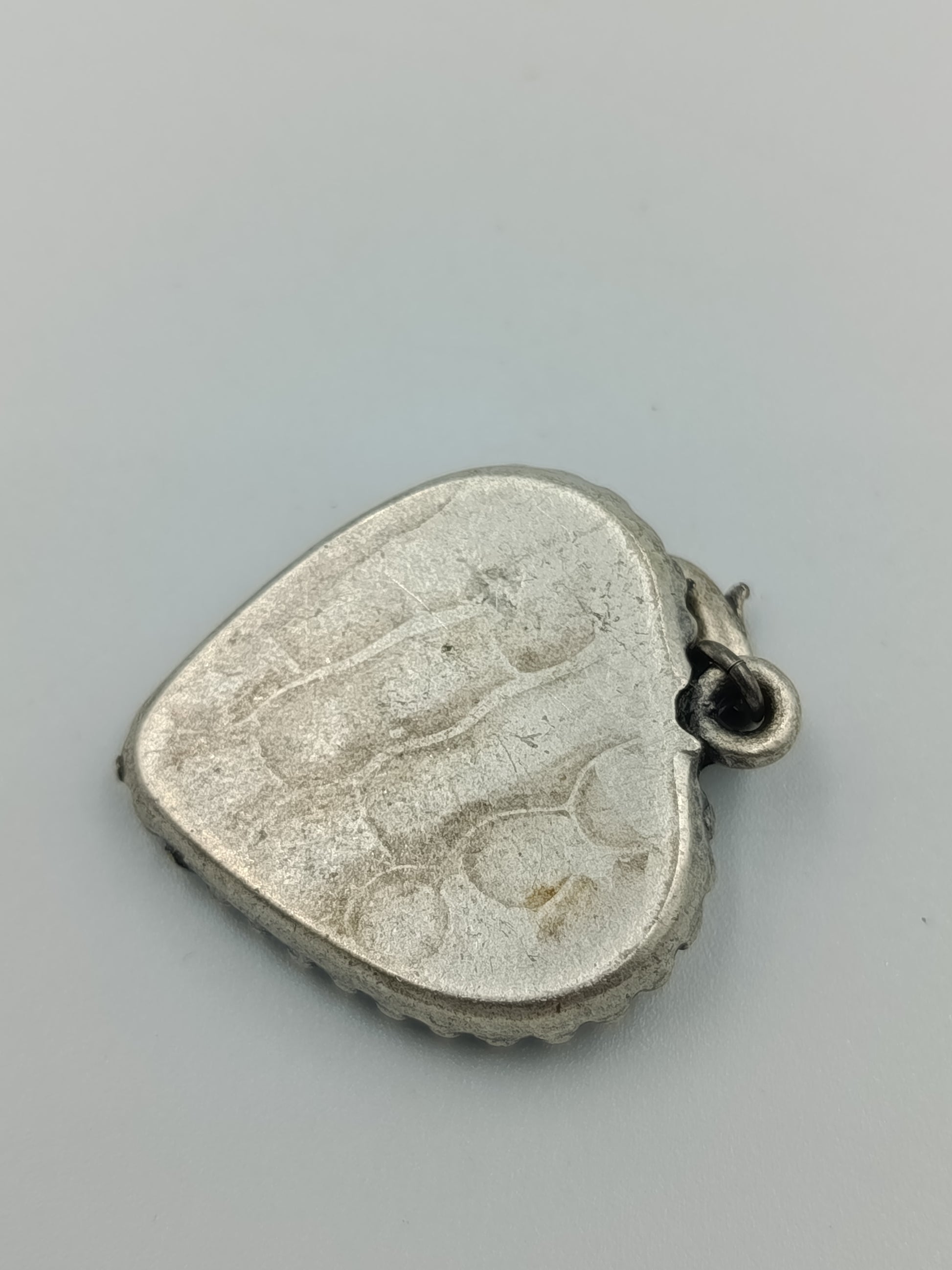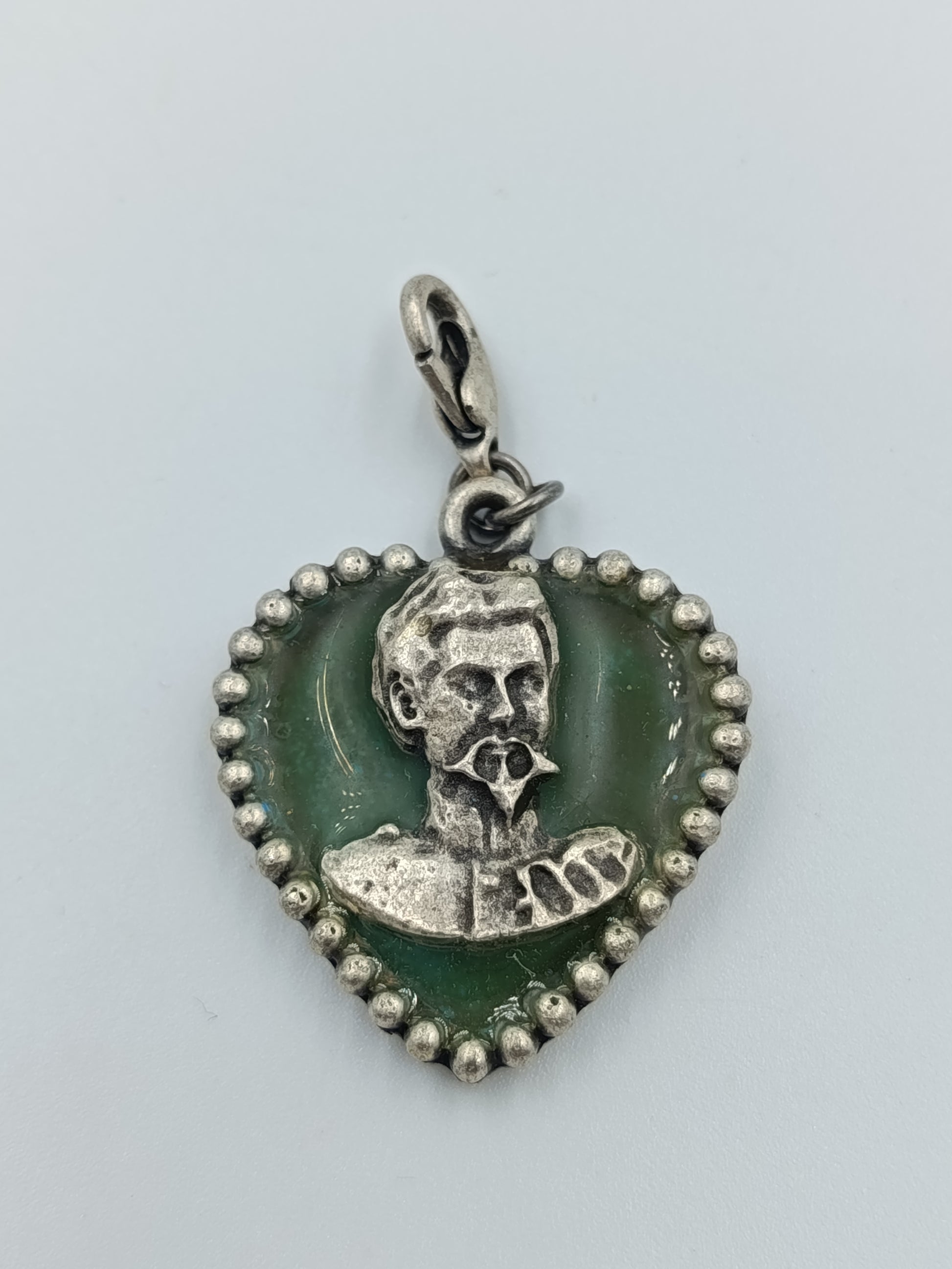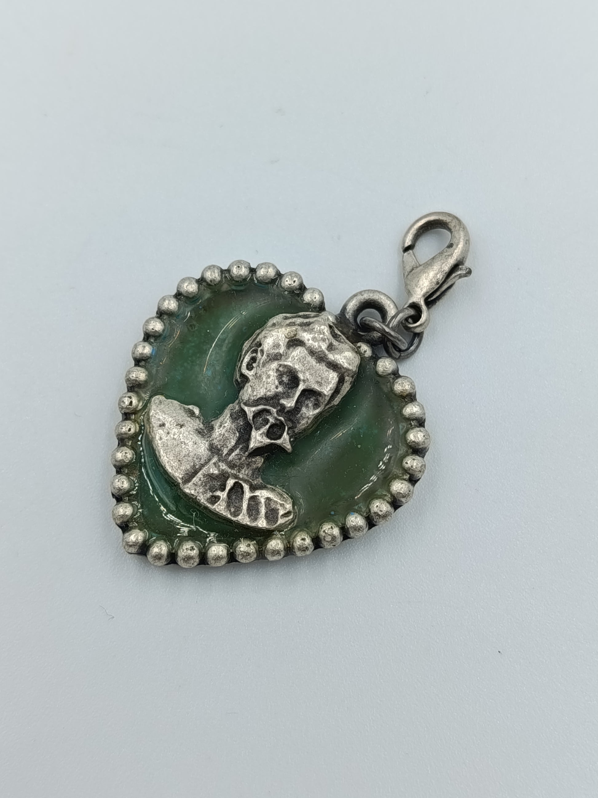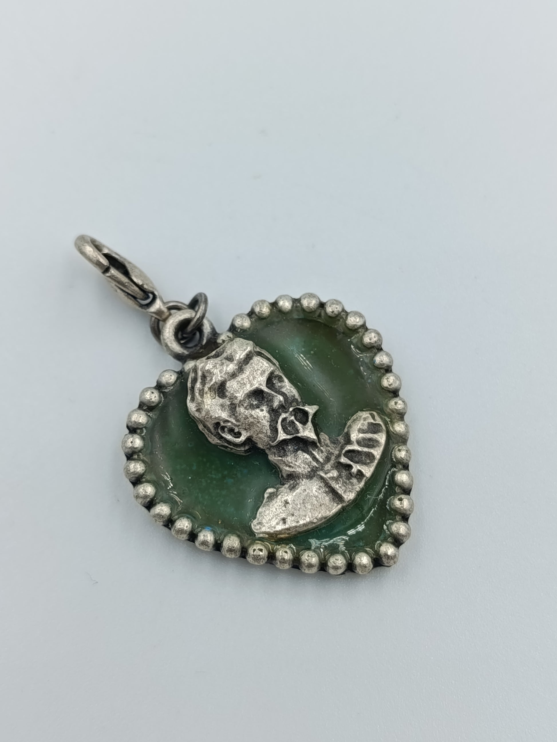 Dieser besondere Anhänger ist in Herzform gestaltet und zeigt ein plastisches Portrait auf grünem Hintergrund, umrahmt von einer dekorativen Perlenkante. Das Material wirkt wie versilbertes Metall mit schöner Patina – ideal für Sammler oder als ausgefallenes Schmuckstück mit Vintage-Charme.