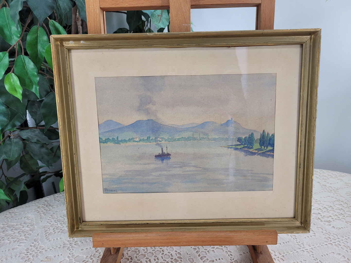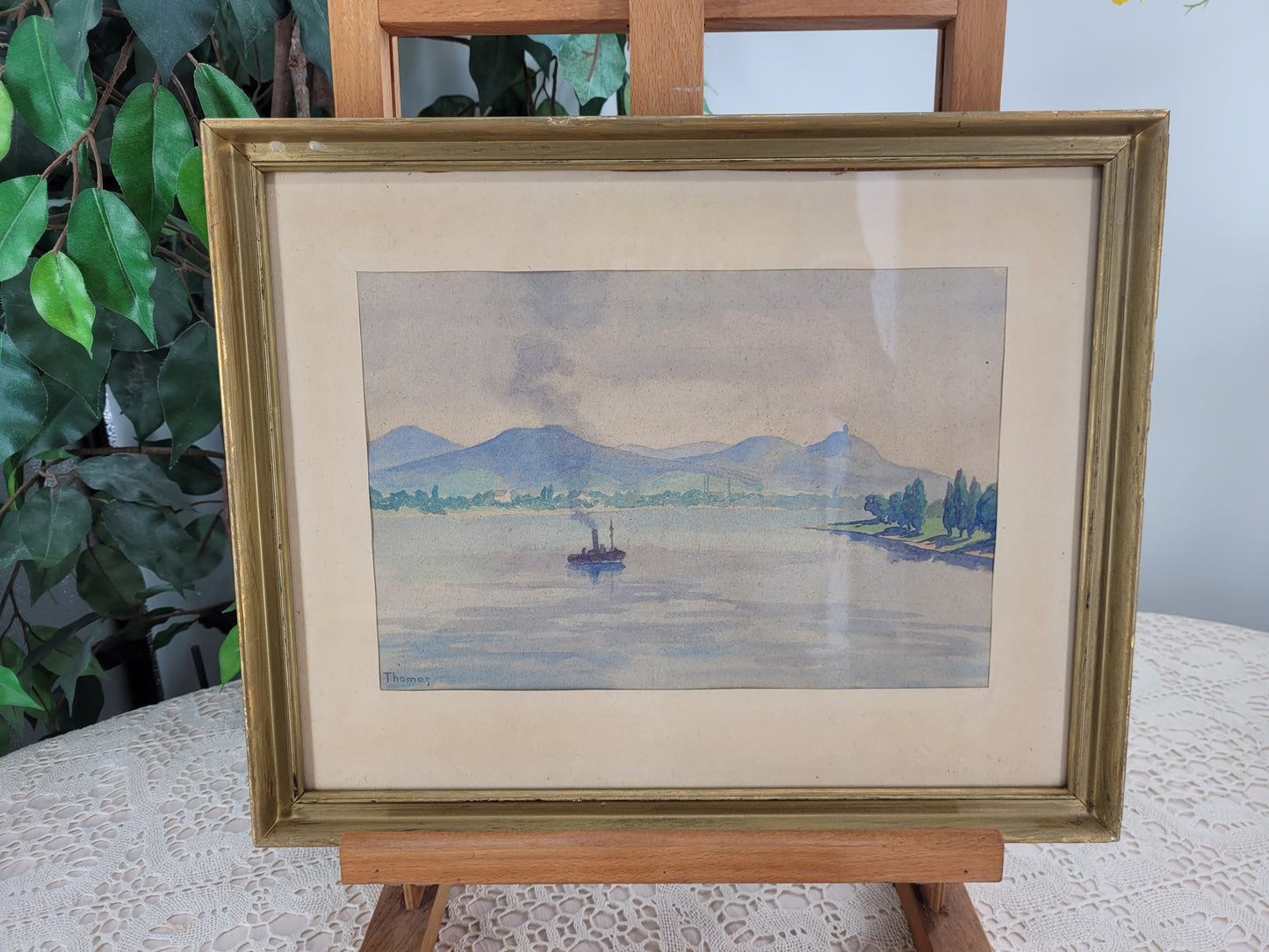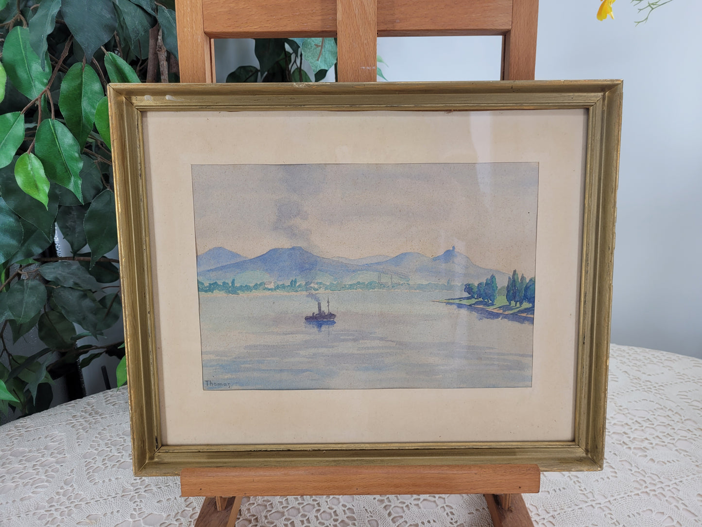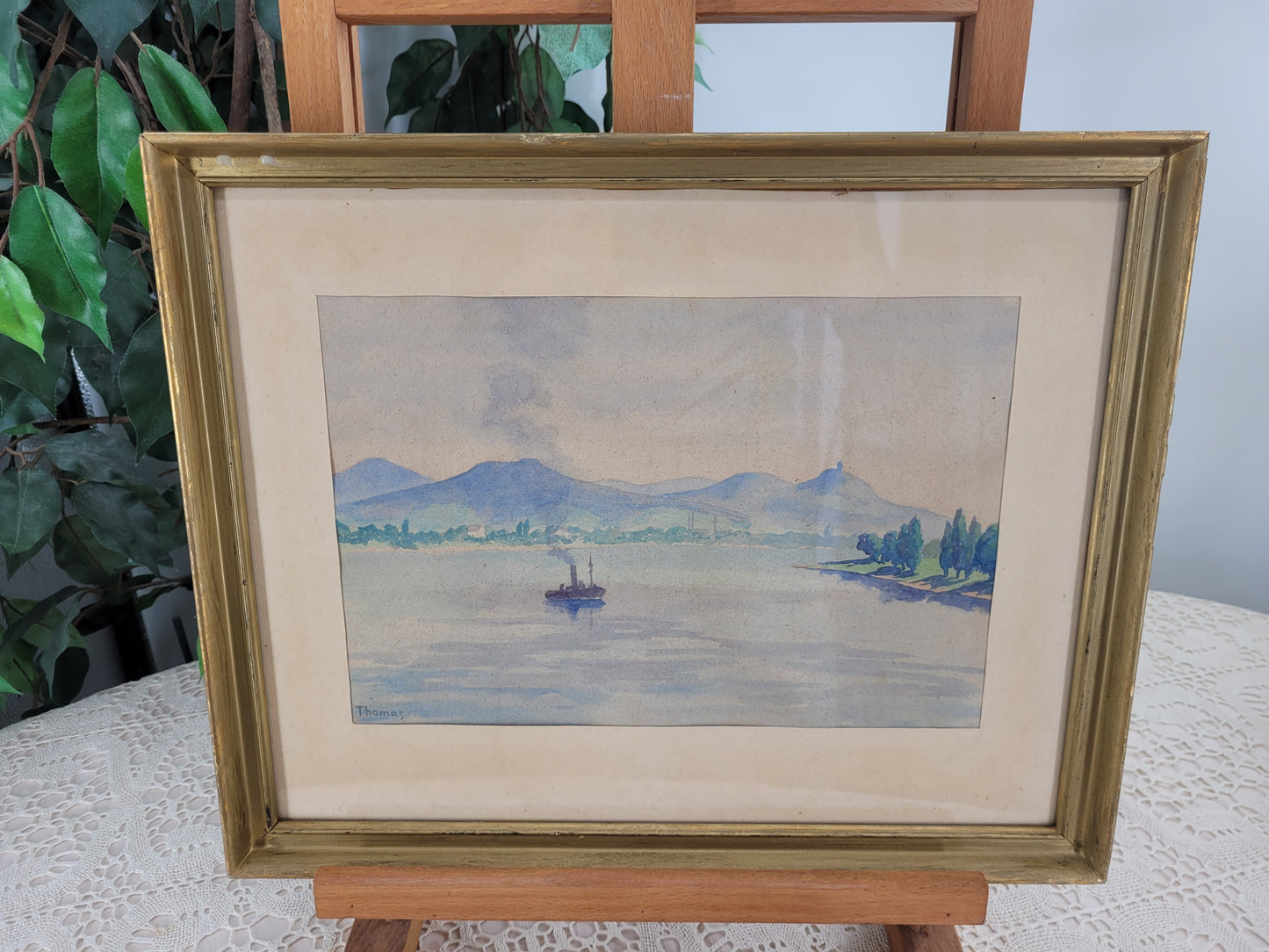 Thomas (XX) Aquarell Malerei,Landschaft mit See und Bergen