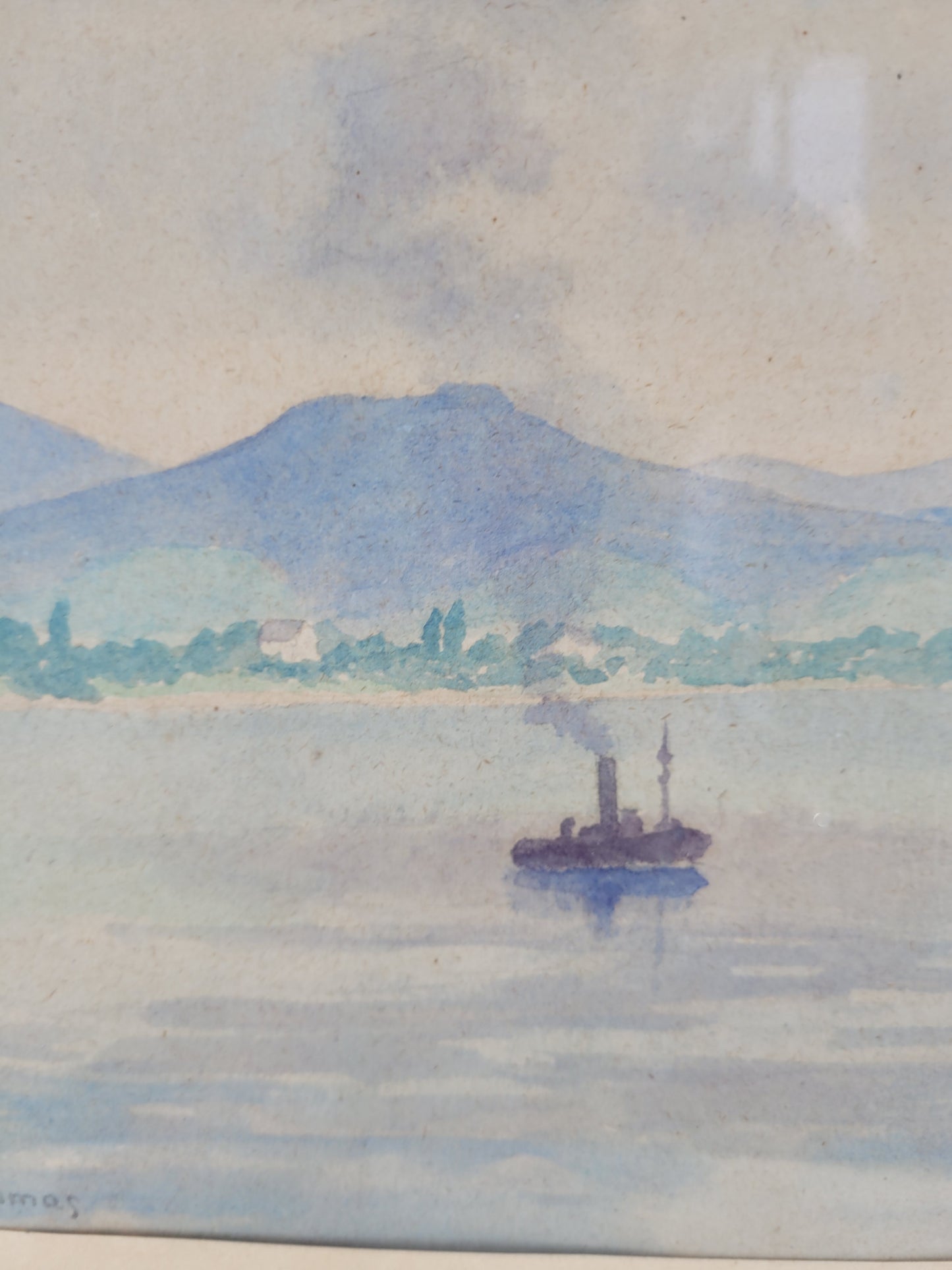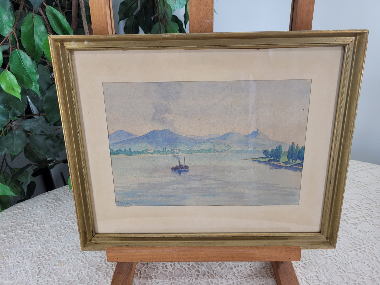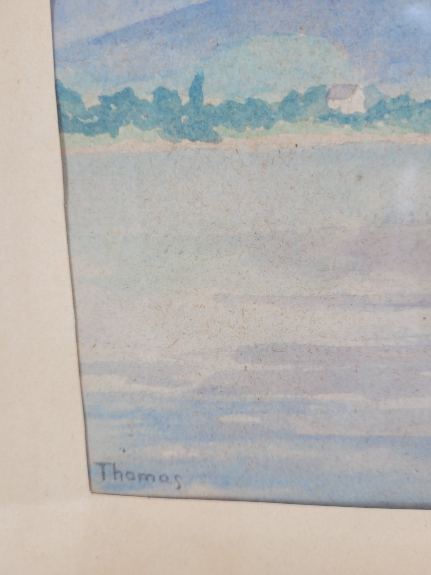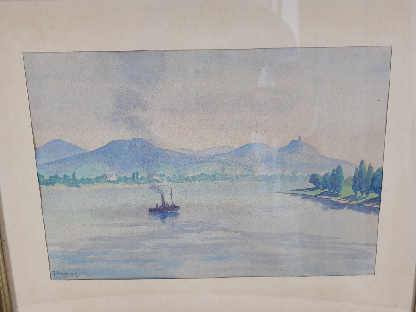 Thomas (XX) Aquarell Malerei,Landschaft mit See und Bergen