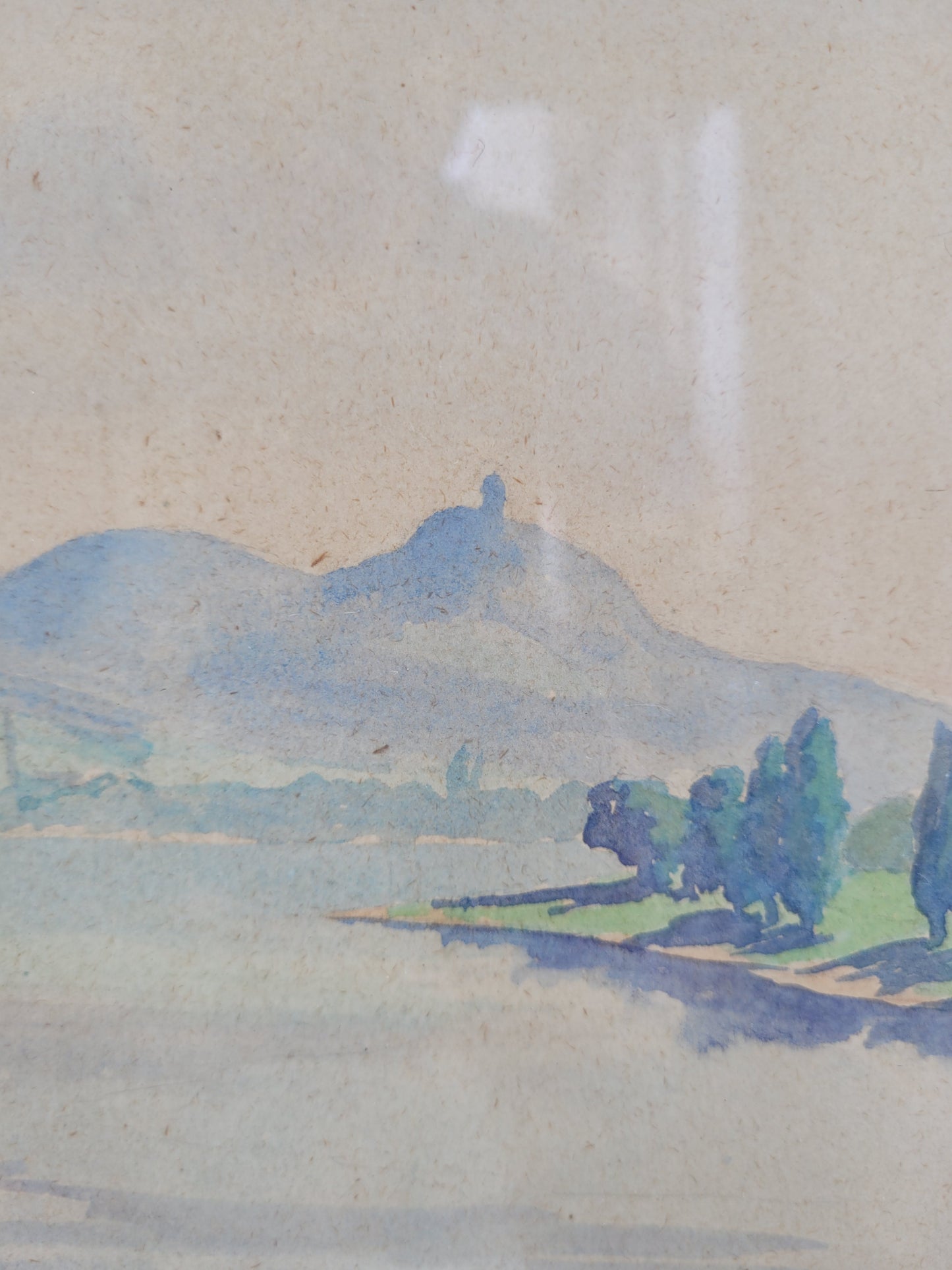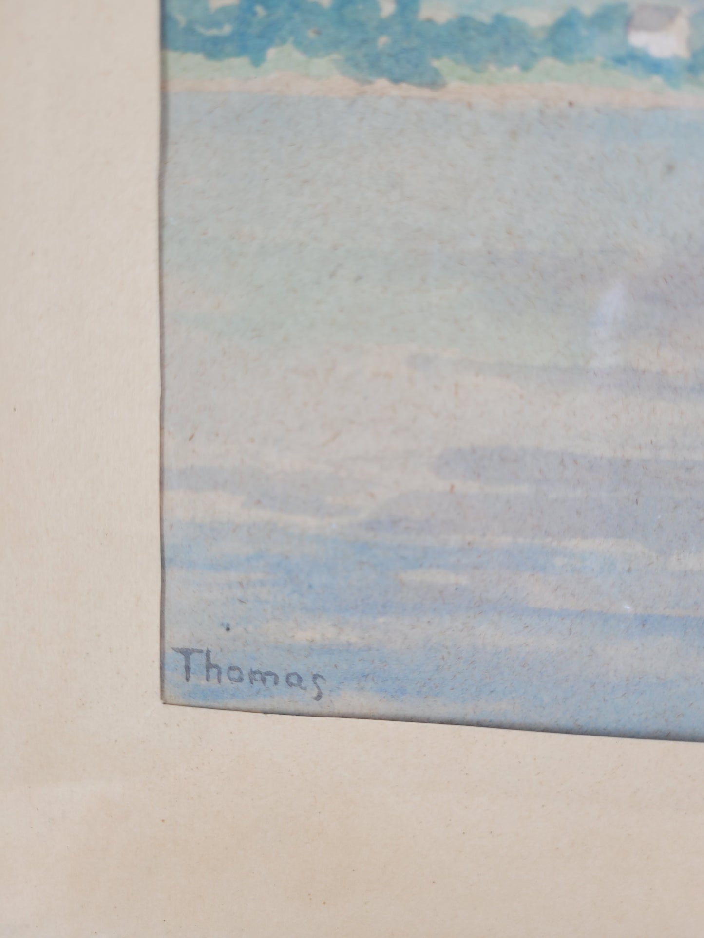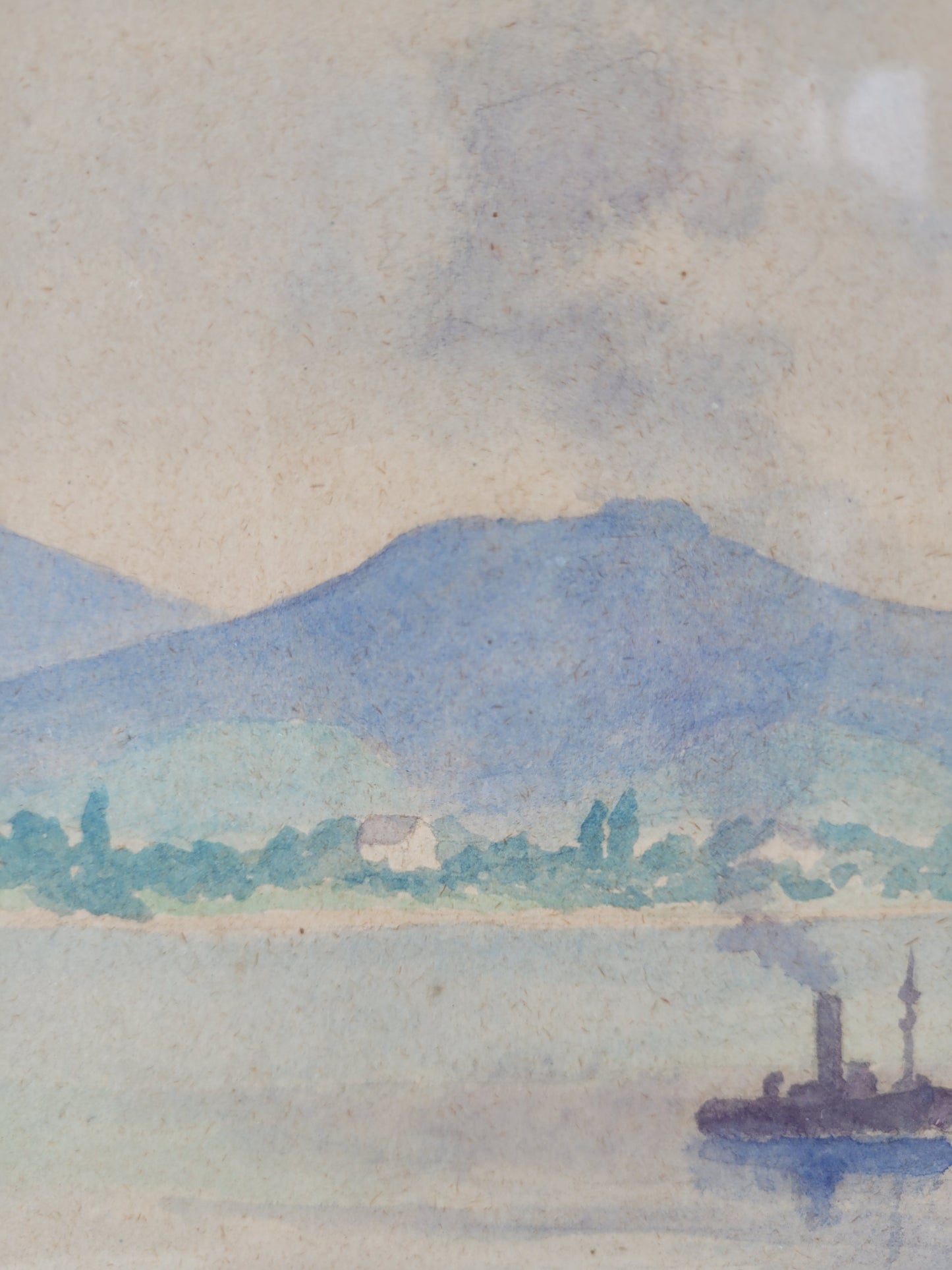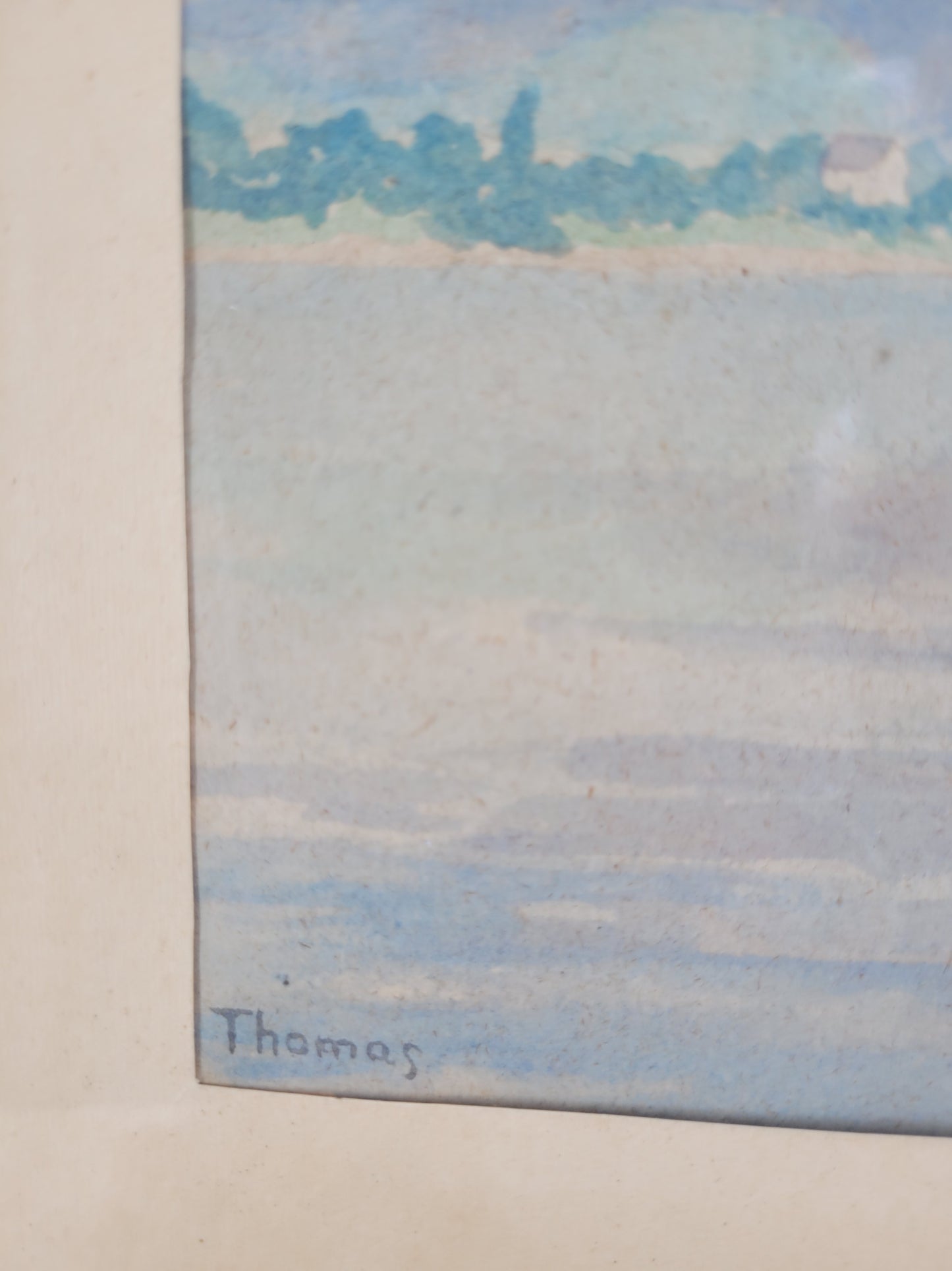 Thomas (XX) Aquarell Malerei,Landschaft mit See und Bergen