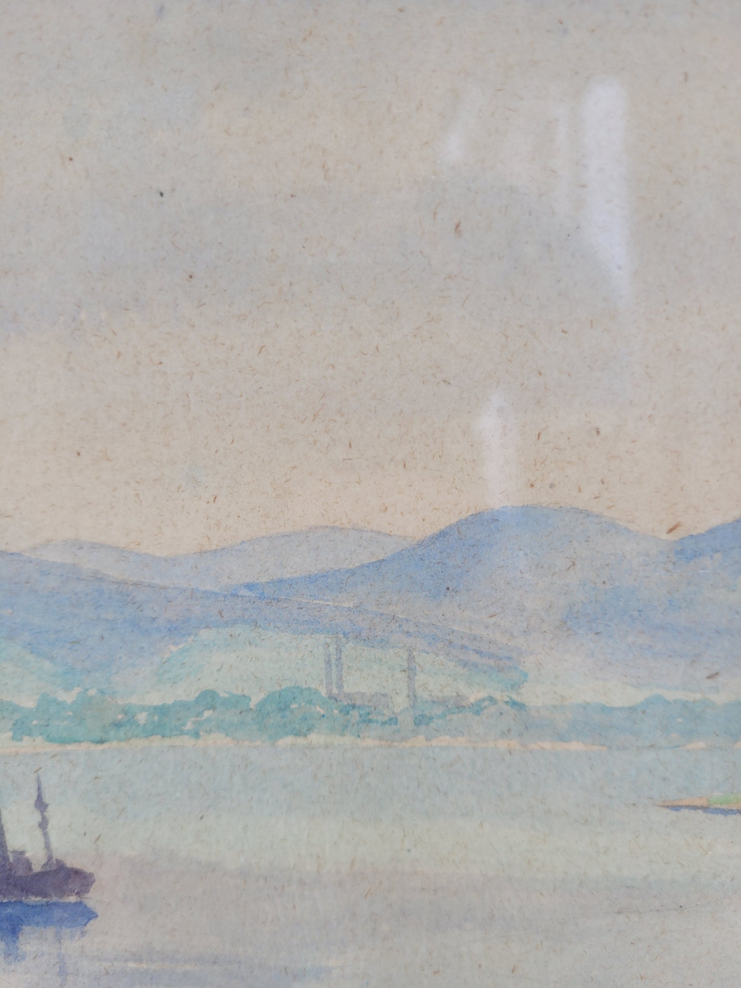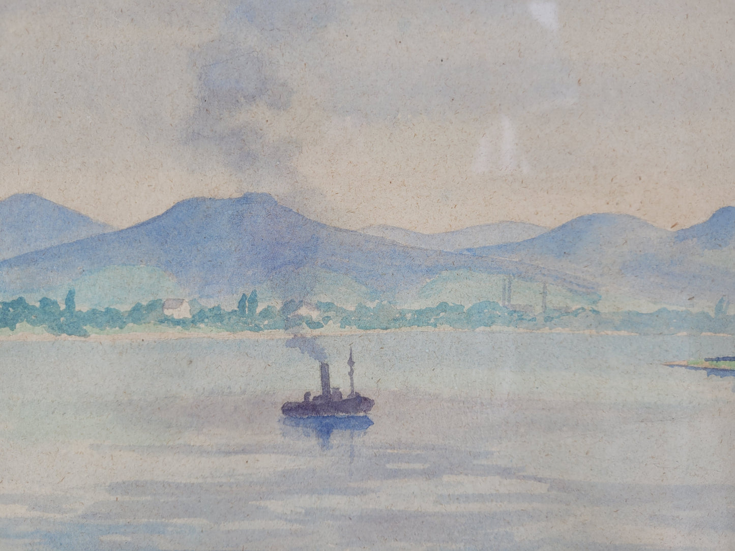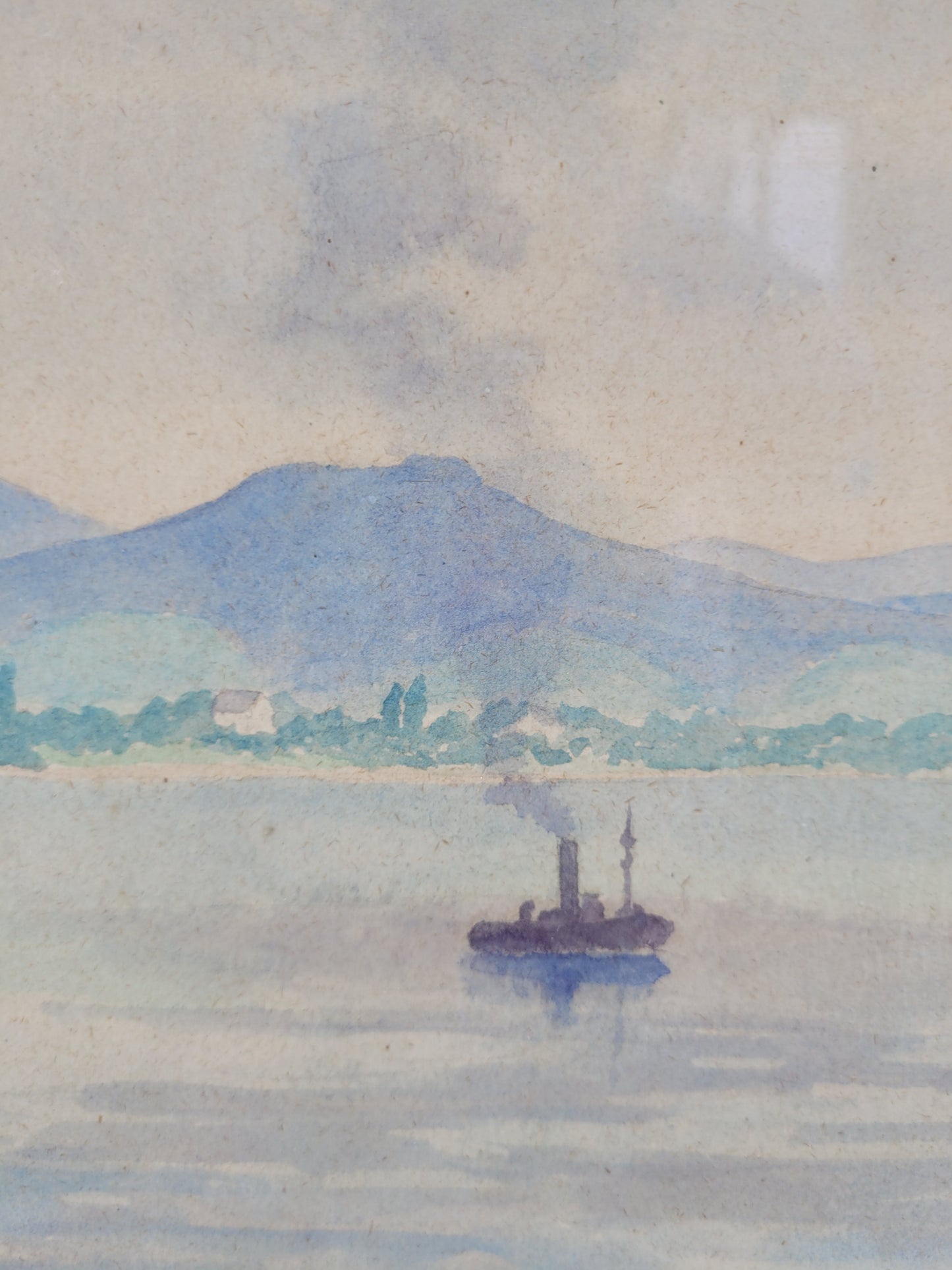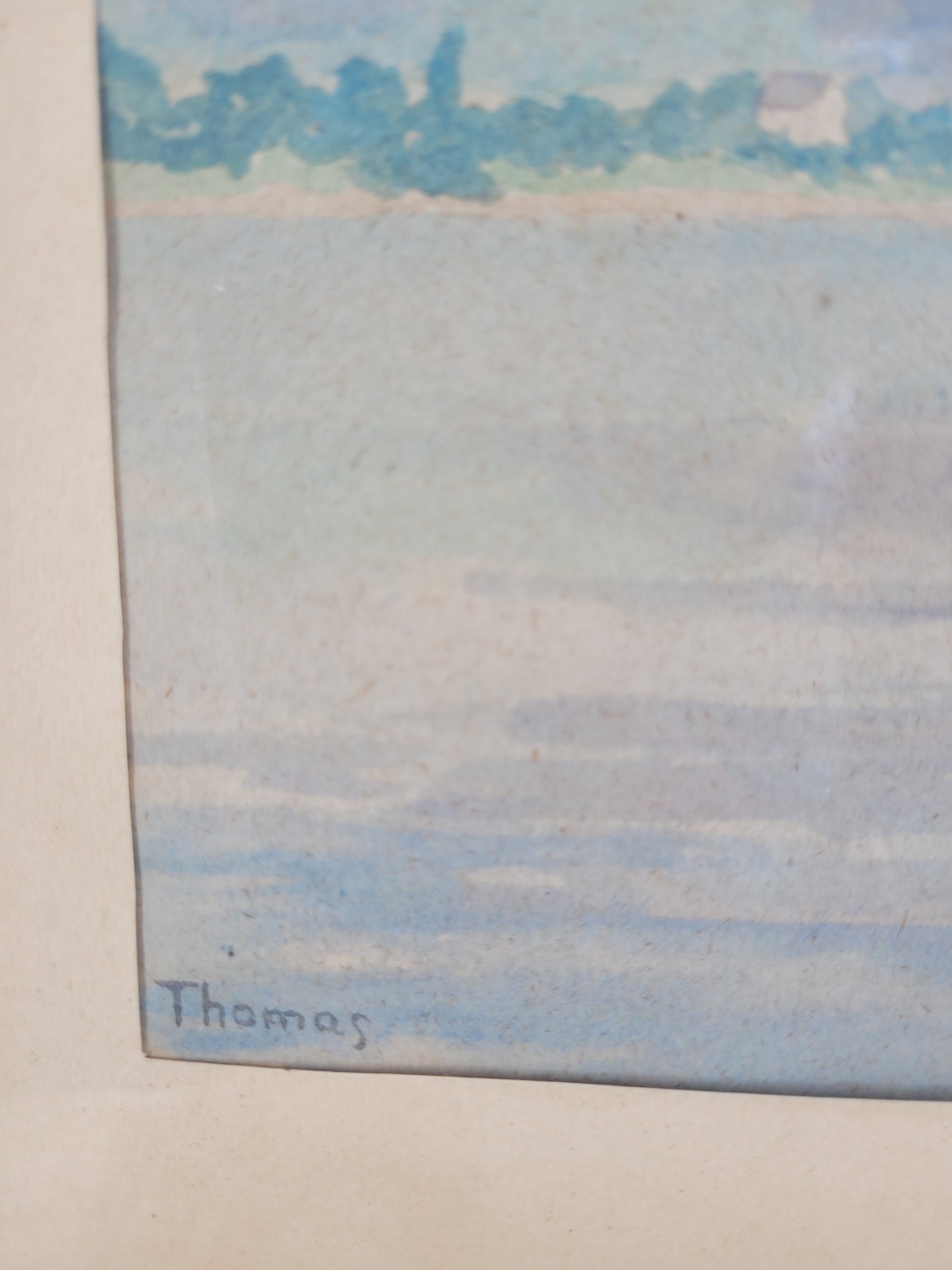 Thomas (XX) Aquarell Malerei,Landschaft mit See und Bergen