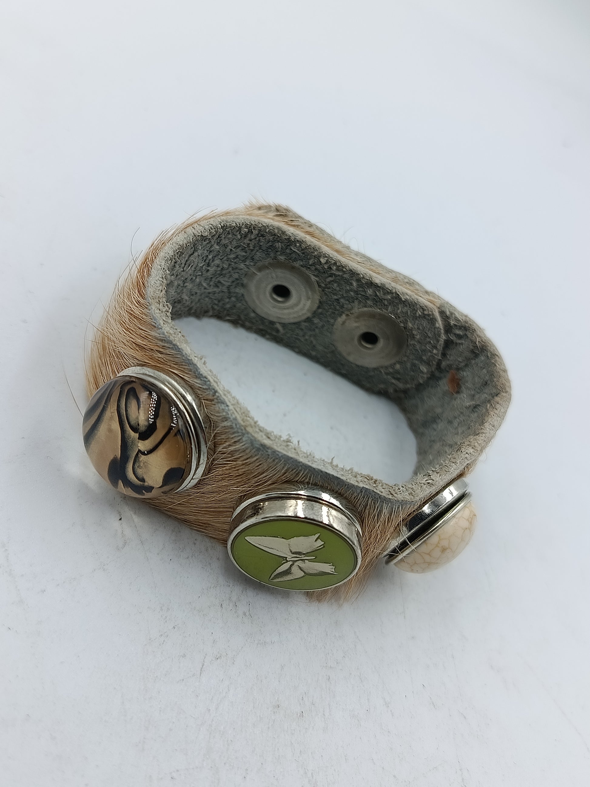 Armband aus Leder mit Felloptik und dekorativen Druckknöpfen im natürlichen Stil