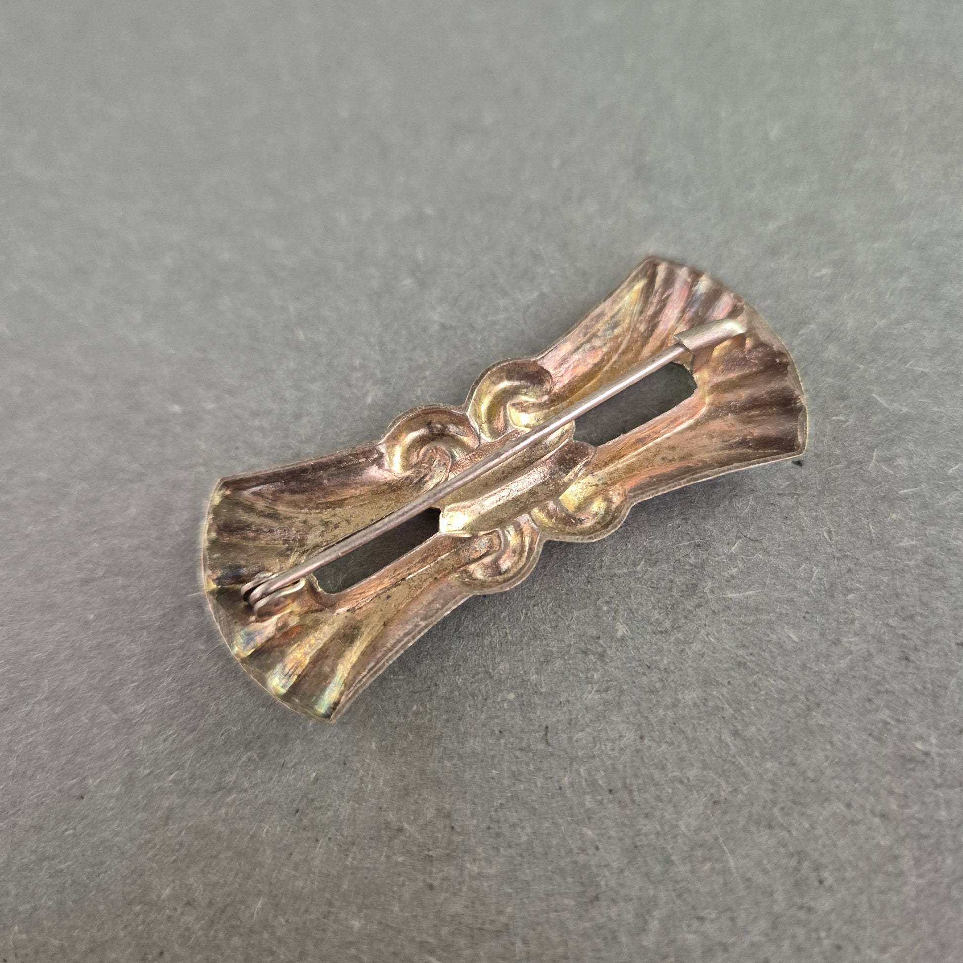 Diese stilvolle Brosche im Art-Déco-Stil vereint klare Linien und geometrische Eleganz. Das fächerförmige Design in Kombination mit der offenen Mitte verleiht dem Schmuckstück eine edle Leichtigkeit. Ein einzigartiger Akzent für Vintage-Liebhaber und ideal geeignet für Blazer, Kleider oder Schals.