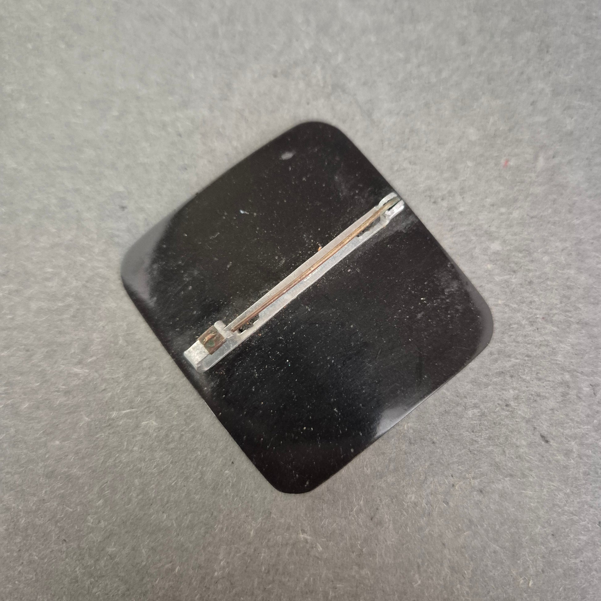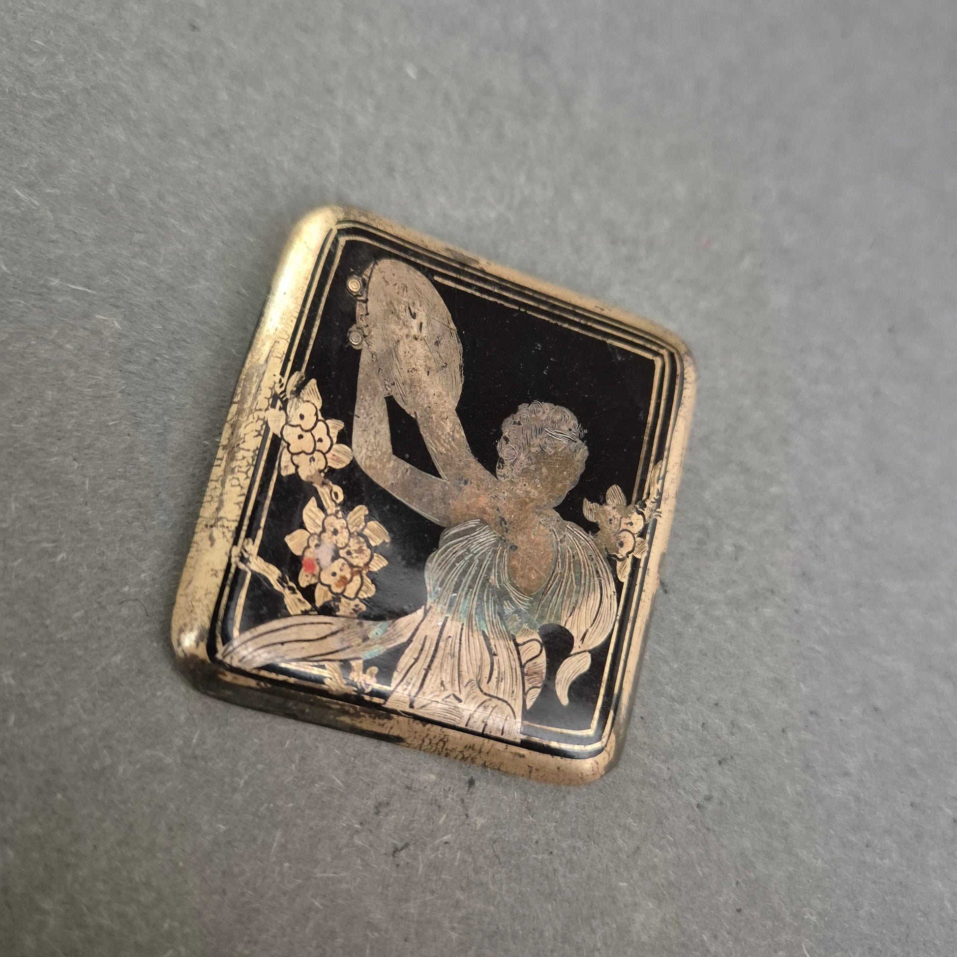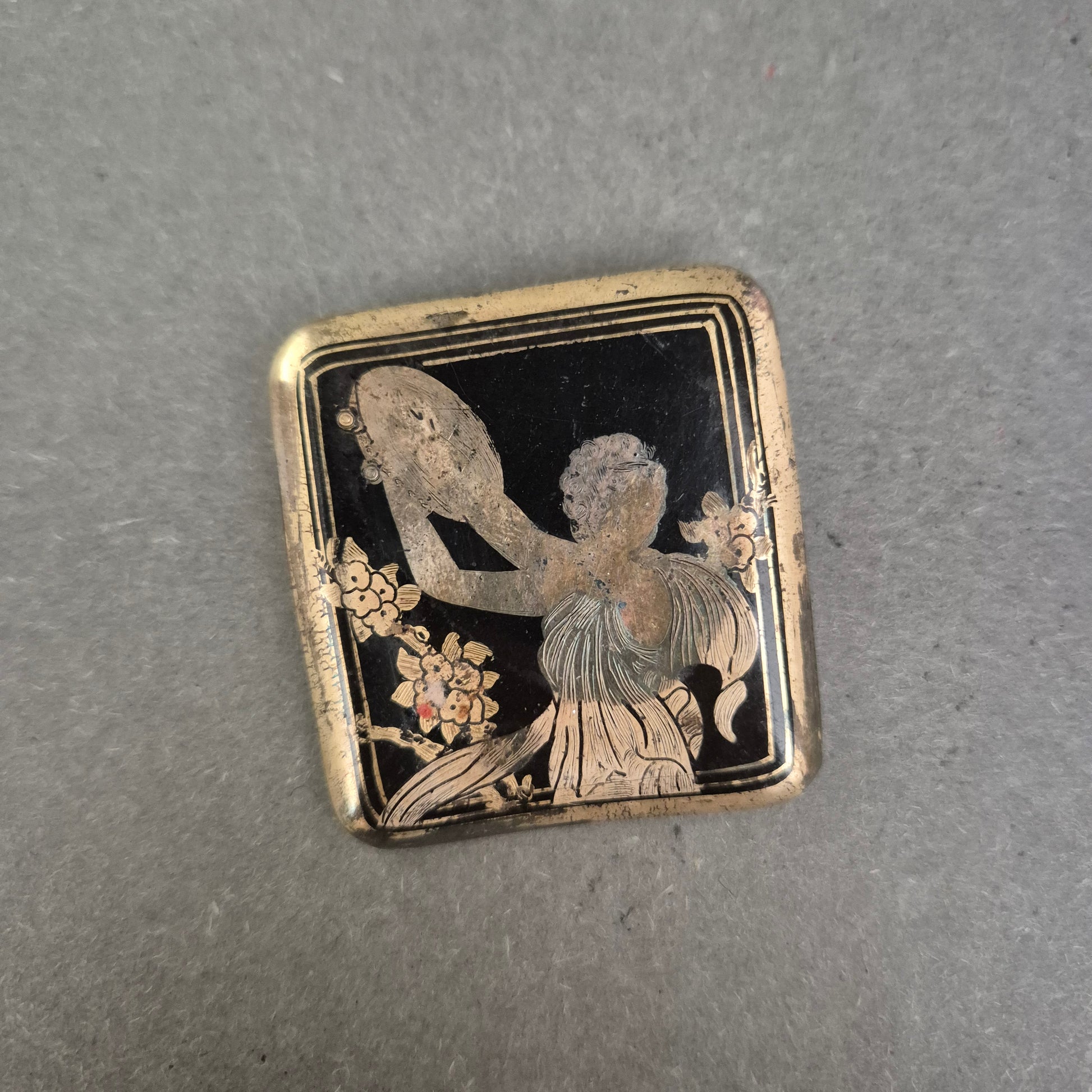 Diese dekorative Vintage-Brosche zeigt eine elegante Frau mit Tamburin in einem stilisierten, floralen Umfeld – ein typisches Motiv des Art-Déco-Zeitalters. Das schwarzgoldene Emaille-Finish verleiht der Brosche ihren besonderen Charme, während leichte Alterungsspuren ihre Authentizität als Sammlerstück unterstreichen. Ideal für Liebhaber nostalgischer Schmuckkunst und historischer Ästhetik.