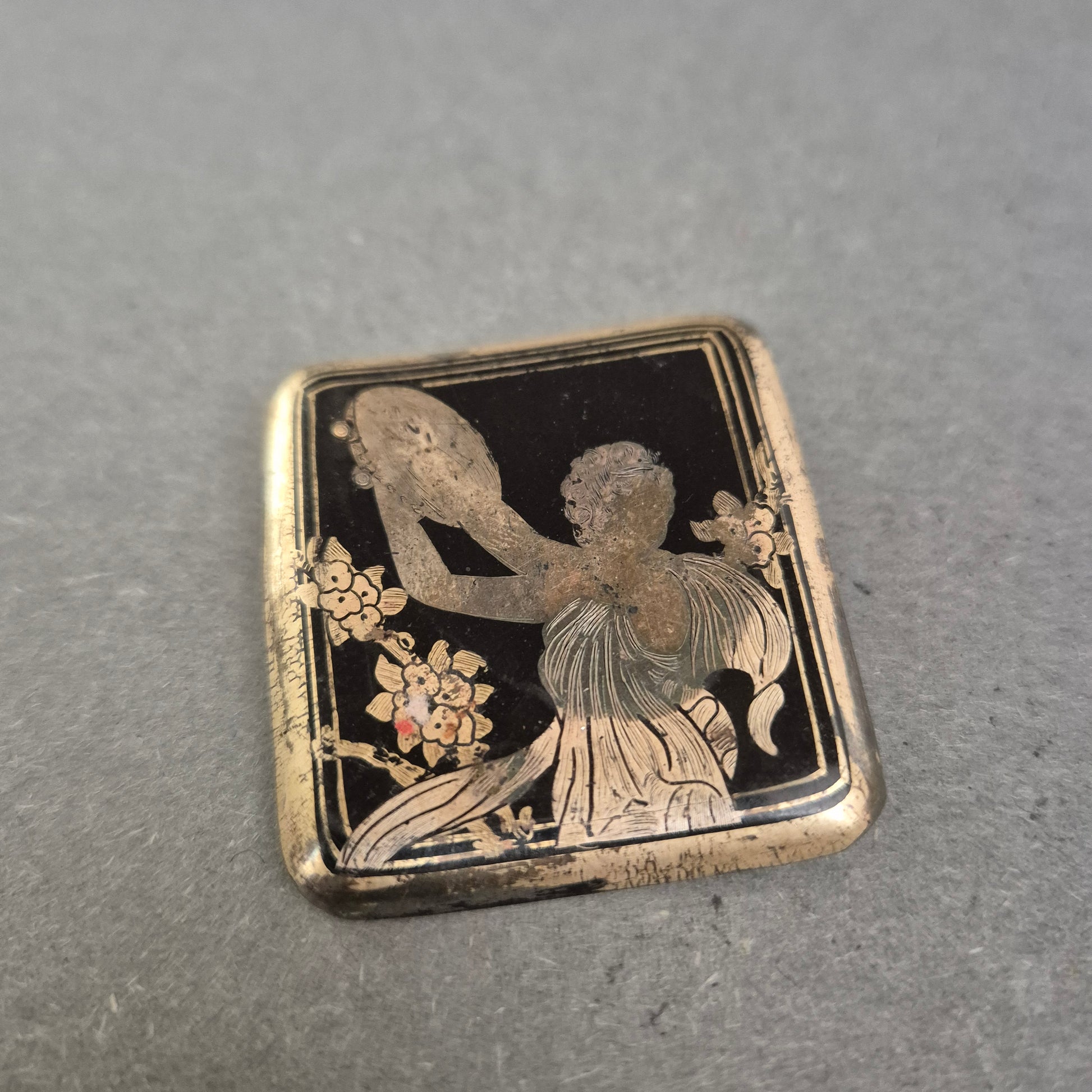 Art-Déco-Brosche mit antiker Tänzerin – Schwarzgoldenes Emaille-Design