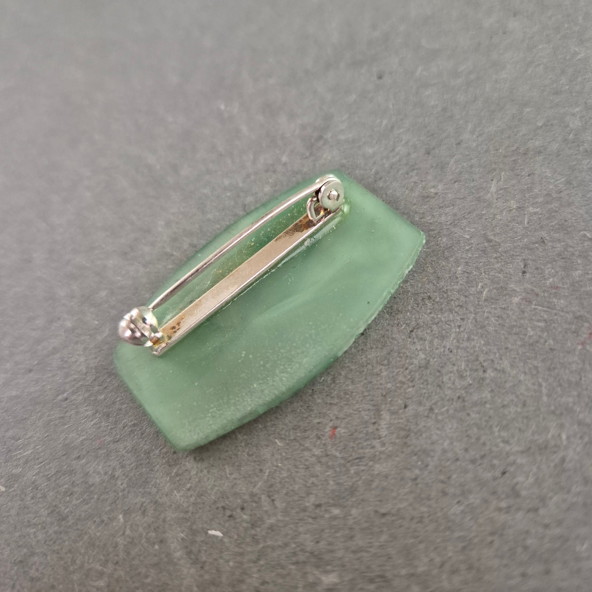 Diese stilvolle Brosche erinnert an den Art-Déco-Stil der 1920er Jahre. Sie besteht aus einer grünlichen, halbtransparenten Kunststoffplatte mit feinem floralen Relief. Die dezente rechteckige Form und die filigrane Blütenstruktur verleihen ihr eine charmante, nostalgische Ausstrahlung. Rückseitig mit Nadelverschluss – ideal für Fans von Vintage-Kunstharz-Schmuck.