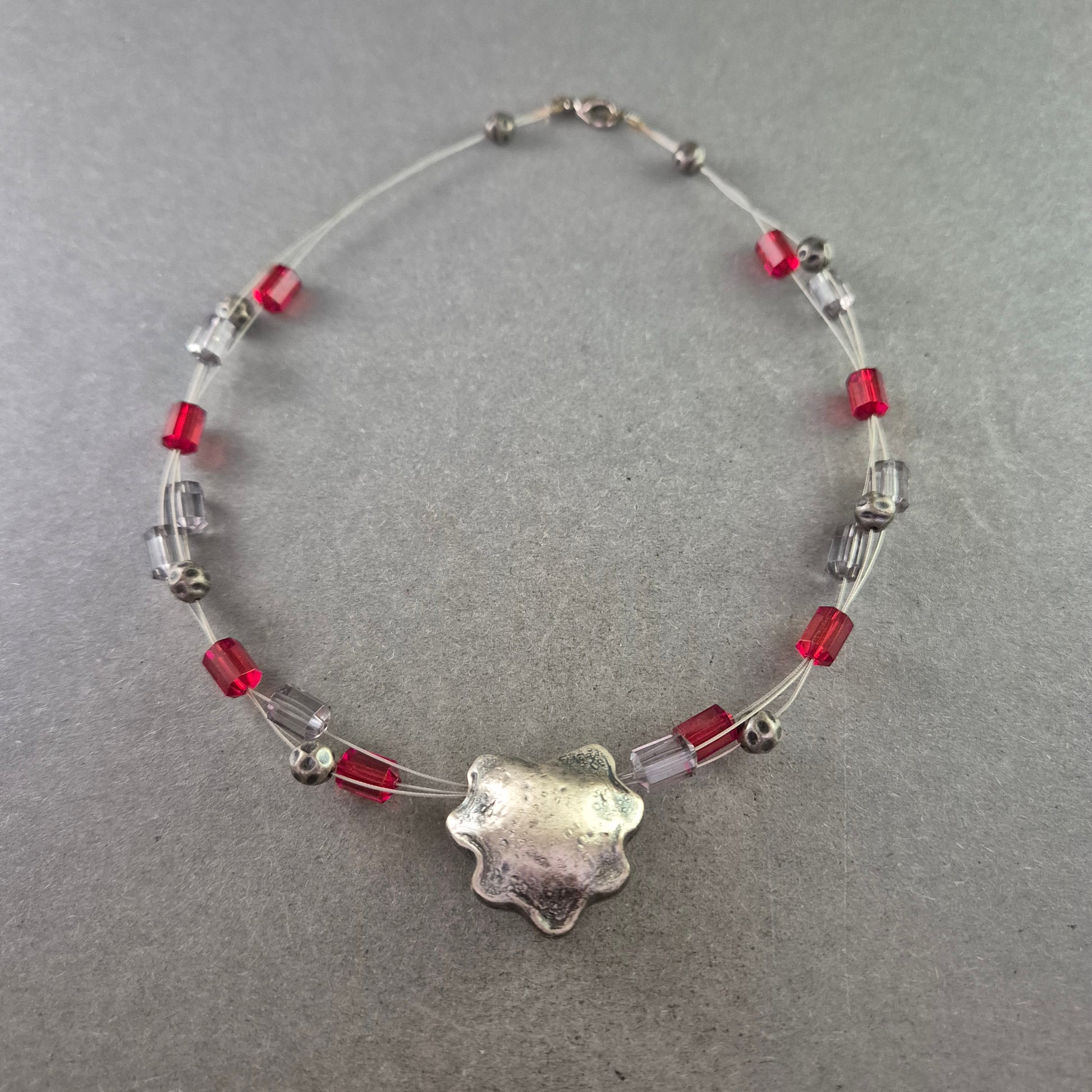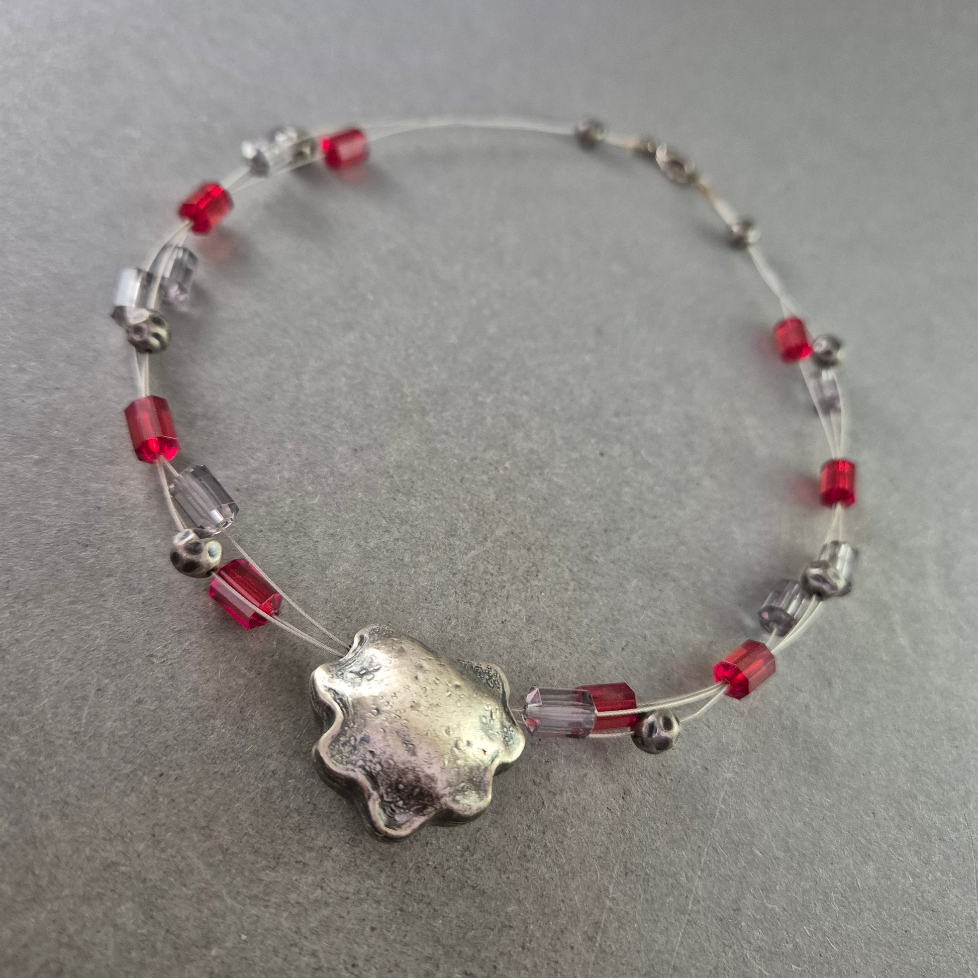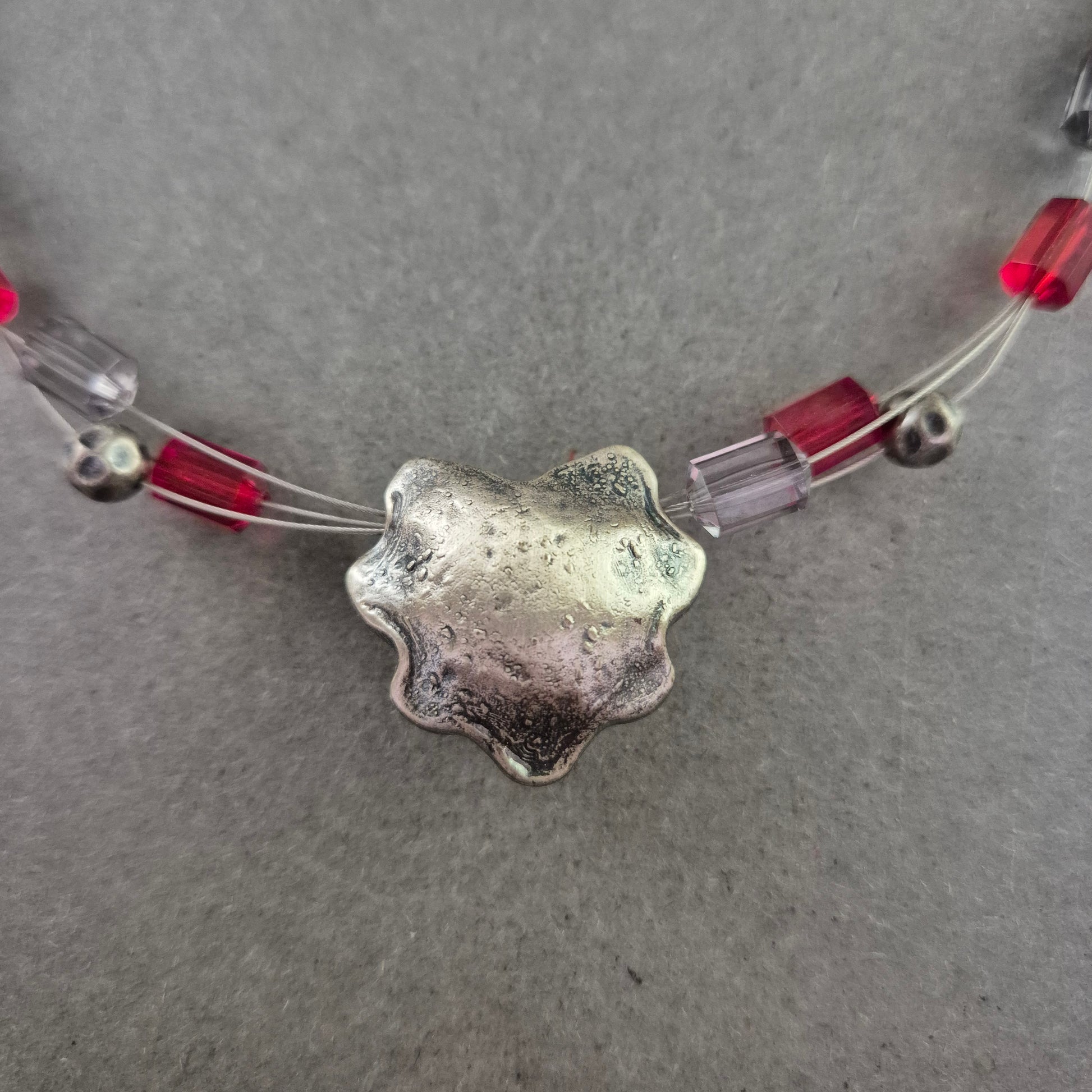 Diese kreative Modeschmuck-Halskette kombiniert transparente Drahtstränge mit roten und silberfarbenen Würfel- sowie Kugelperlen. Das Highlight bildet ein großer, organisch geformter Anhänger in matter Silberoptik. Durch den Karabinerverschluss lässt sich die Kette sicher tragen. Ideal für alle, die außergewöhnlichen Schmuck mit modernem Charakter lieben.