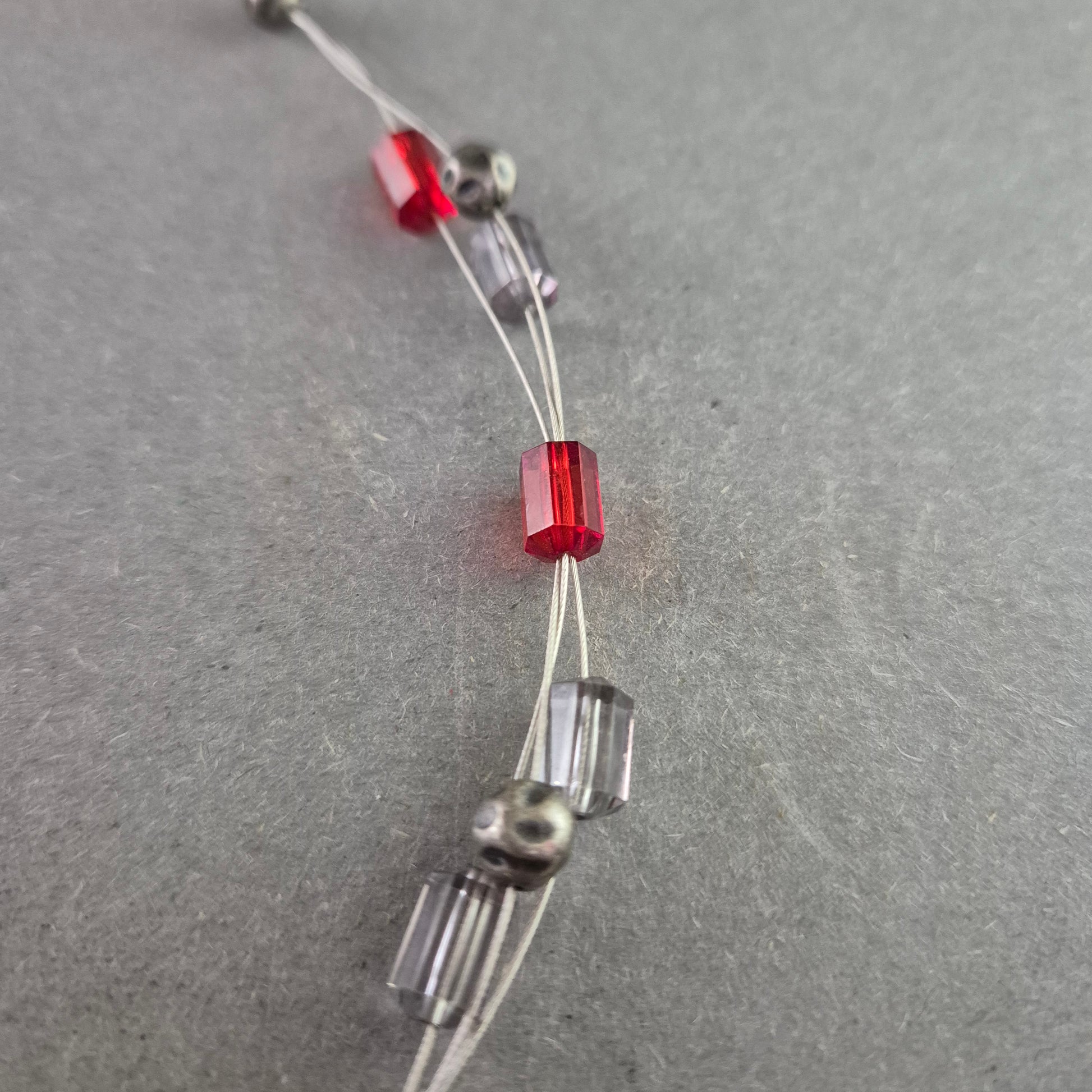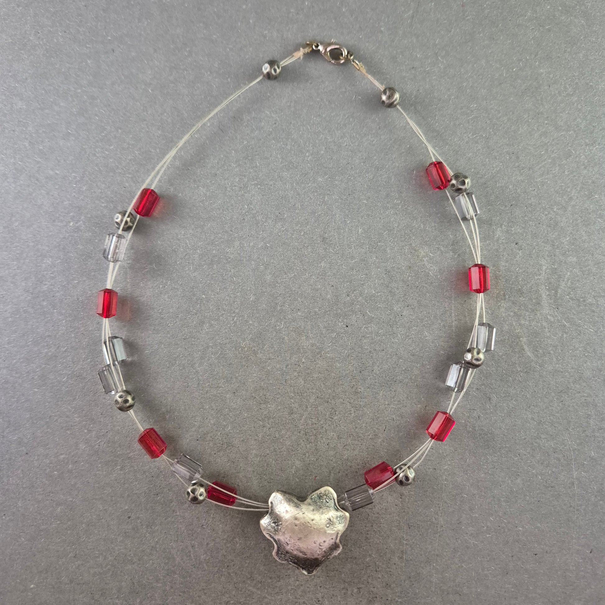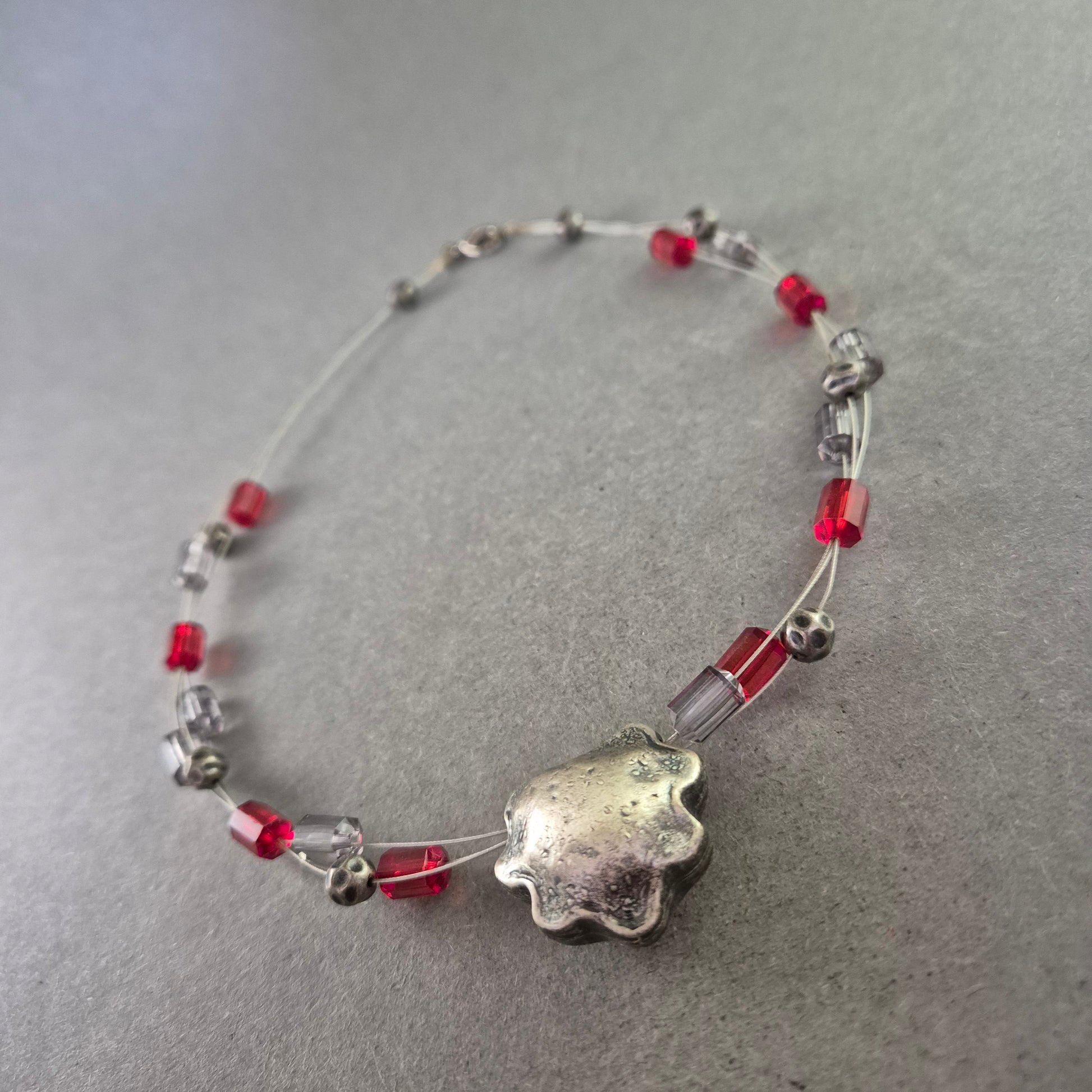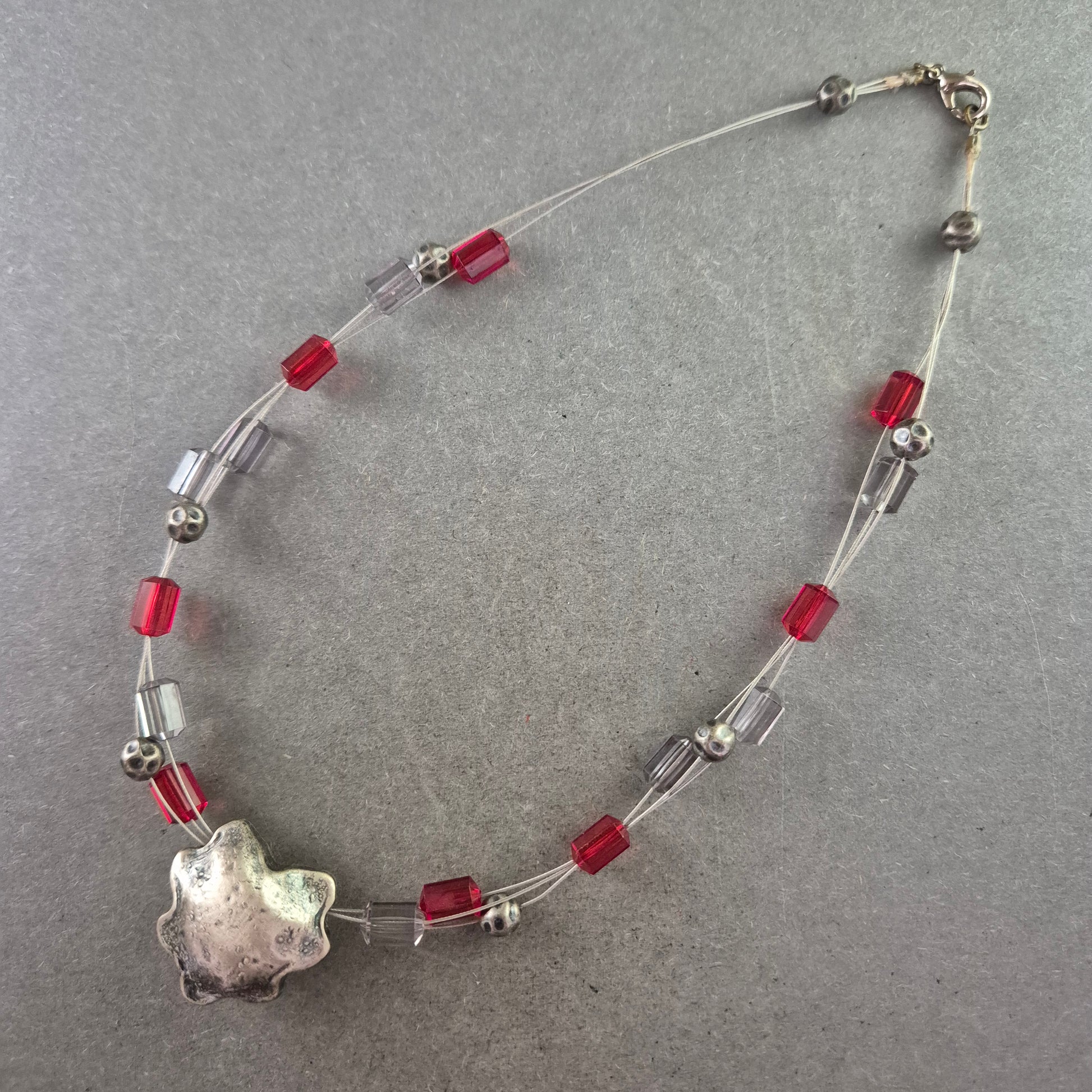 Diese kreative Modeschmuck-Halskette kombiniert transparente Drahtstränge mit roten und silberfarbenen Würfel- sowie Kugelperlen. Das Highlight bildet ein großer, organisch geformter Anhänger in matter Silberoptik. Durch den Karabinerverschluss lässt sich die Kette sicher tragen. Ideal für alle, die außergewöhnlichen Schmuck mit modernem Charakter lieben.